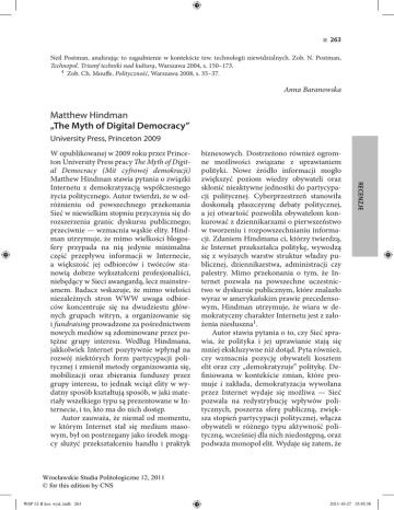 263 Neil Postman, analizując to zagadnienie w kontekście tzw. technologii niewidzialnych. Zob. N. Postman, Technopol. Triumf techniki nad kulturą, Warszawa 2004, s. 150–173. 4 Zob. Ch. Mouffe, Polityczność, Warszawa 2008, s. 35–37. Anna Baranowska Matthew Hindman „The Myth of Digital Democracy” University Press, Princeton 2009 biznesowych. Dostrzeżono również ogromne możliwości związane z uprawianiem polityki. Nowe źródło informacji mogło zwiększyć poziom wiedzy obywateli oraz skłonić nieaktywne jednostki do partycypacji politycznej. Cyberprzestrzeń stanowiła doskonałą płaszczyznę debaty politycznej, a jej otwartość pozwoliła obywatelom konkurować z dziennikarzami o pierwszeństwo w tworzeniu i rozpowszechnianiu informacji. Zdaniem Hindmana ci, którzy twierdzą, że Internet przekształca politykę, wywodzą się z wyższych warstw struktur władzy publicznej, dziennikarstwa, administracji czy palestry. Mimo przekonania o tym, że Internet pozwala na powszechne uczestnictwo w dyskursie publicznym, które znalazło wyraz w amerykańskim prawie precedensowym, Hindman utrzymuje, że wiara w demokratyczny charakter Internetu jest z założenia niesłuszna1. Autor stawia pytania o to, czy Sieć sprawia, że polityka i jej uprawianie stają się mniej ekskluzywne niż dotąd. Pyta również, czy wzmacnia pozycję obywateli kosztem elit oraz czy „demokratyzuje” politykę. Definiowana w kontekście zmian, które promuje i zakłada, demokratyzacja wywołana przez Internet wydaje się możliwa — Sieć pozwala na redystrybucję wpływów politycznych, poszerza sferę publiczną, zwiększa stopień partycypacji politycznej, włącza obywateli w różnego typu aktywność polityczną, wcześniej dla nich niedostępną, oraz podważa monopol elit. Wydaje się zatem, że RECENZJE W opublikowanej w 2009 roku przez Princeton University Press pracy The Myth of Digital Democracy (Mit cyfrowej demokracji) Matthew Hindman stawia pytania o związki Internetu z demokratyzacją współczesnego życia politycznego. Autor twierdzi, że w odróżnieniu od powszechnego przekonania Sieć w niewielkim stopniu przyczynia się do rozszerzenia granic dyskursu publicznego; przeciwnie — wzmacnia wąskie elity. Hindman utrzymuje, że mimo wielkości blogosfery przypada na nią jedynie minimalna część przepływu informacji w Internecie, a większość jej odbiorców i twórców stanowią dobrze wykształceni profesjonaliści, niebędący w Sieci awangardą, lecz mainstreamem. Badacz wskazuje, że mimo wielości niezależnych stron WWW uwaga odbiorców koncentruje się na dwudziestu głównych grupach witryn, a organizowanie się i fundraising prowadzone za pośrednictwem nowych mediów są zdominowane przez potężne grupy interesu. Według Hindmana, jakkolwiek Internet pozytywnie wpłynął na rozwój niektórych form partycypacji politycznej i zmienił metody organizowania się, mobilizacji oraz zbierania funduszy przez grupy interesu, to jednak wciąż elity w wydatny sposób kształtują sposób, w jaki materiały wszelkiego typu są prezentowane w Internecie, i to, kto ma do nich dostęp. Autor zauważa, że niemal od momentu, w którym Internet stał się medium masowym, był on postrzegany jako środek mogący służyć przekształceniu handlu i praktyk Wrocławskie Studia Politologiczne 12, 2011 © for this edition by CNS WSP 12-II kor. wyd..indb 263 2011-10-27 15:45:38 RECENZJE 264 rozwój nowych technologii wzmacnia głos obywateli. Hindman przypuszcza jednak, że gdyby naprawdę mogli oni tworzyć informacje oraz prezentować własne komentarze przed szeroką publicznością, miałoby to poważne implikacje dla sytuacji politycznej. Micha el Schudson wspomina w tym kontekście o „demokracji monitorującej”, sugerując, że demokracja może sprawnie funkcjonować, nawet jeśli obywatele poświęcają uwagę polityce wyłącznie wtedy, kiedy zachodzą w niej nieprawidłowości. Według tej koncepcji odpowiadanie na „alarmy” (jak nazywa je Schudson) zapewnia obywatelom udział w polityce2. Z tej perspektywy Internet sprawia, że monitoring życia politycznego staje się dużo bardziej efektywny niż dotąd i pozwala obywatelom odgrywać rolę tradycyjnie zarezerwowaną dla oficjalnej prasy. Hindman twierdzi, że rzeczywista partycypacja wymaga od obywateli zaangażowania w dyskusję z innymi obywatelami. Polityczne znaczenie Internetu autor postrzega przez pryzmat demokracji deliberatywnej, mając nadzieję, że Sieć rozszerzy sferę publiczną, powiększając zarówno katalog dyskutowanych idei, jak i liczbę obywateli zaangażowanych w dyskusję. Jednocześnie stawia kolejne pytania — czy, poprzez rozwój Internetu, wzrosła liczba typów partycypacji politycznej? Czy znaczna liczba dotychczas nieaktywnych obywateli została włączona w aktywność polityczną? Inne pytania wiążą się ze stwierdzeniami, wedle których Sieć pomoże zmienić układ interesów politycznych, ożywi debatę polityczną czy nawet zatrze tradycyjne podziały między masami a elitą. W jakim stopniu otwarty jest Internet w swej architekturze? Czy struktura odbiorców Internetu jest mniej scentralizowana niż struktura odbiorców tradycyjnych mediów? Ile głosów obywateli zostaje usłyszanych w Internecie? Czy głosy, które zostaną usłyszane, wywołają zamierzoną refleksję wśród odbiorców?3 Rozpoczynając krytykę entuzjazmu wokół społeczeństwa sieci, Hindman opiera się przede wszystkim na kategorii wykluczenia cyfrowego. Mimo że liczba użytkowników Internetu na przełomie XX i XXI wieku gwałtownie wzrosła, grupy defaworyzowane — mieszkańcy USA, pochodzący z Ameryki Łacińskiej, osoby ubogie, starsze, słabo wykształcone czy zamieszkujące obszary wiejskie — nadal mają problemy z dostępem do Sieci i korzystaniem z niej4. Podczas gdy niektóre z defaworyzowanych grup stopniowo zyskują łączność z Internetem, pozostaje wiele innych, znajdując
