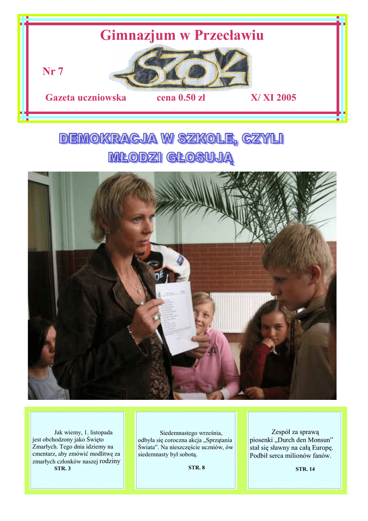 Gimnazjum w Przecławiu Nr 7 Gazeta uczniowska Jak wiemy, 1. listopada jest obchodzony jako Święto Zmarłych. Tego dnia idziemy na cmentarz, aby zmówić modlitwę za zmarłych członków naszej rodziny STR. 3 cena 0.50 zł Siedemnastego września, odbyła się coroczna akcja „Sprzątania Świata”. Na nieszczęście uczniów, ów siedemnasty był sobotą. S STR. 8 X/ XI 2005 Zespół za sprawą piosenki „Durch den Monsun” stał się sławny na całą Europę. Podbił serca milionów fanów. STR. 14 SZOK! Strona 2 SŁOWO OD REDAKTORA NACZELNEGO Cześć! Jak Wam minęły wakacje? Mnie i całej redakcji super! Ale niestety zaczęła się szkoła. Są teŜ tego plusy. Jednym z nich jest to, Ŝe będziecie mogli przeczytać najnowszy numer Waszej ulubionej gazety. W tym numerze moŜecie przeczytać wywiad z panem Wojciechem Woźniakiem, znajdziecie teŜ sprawozdania z Dnia Nauczyciela i Akcji Sprzątania Świata. Dzięki gazetce dowiecie się, skąd wzięło się Halloween i jak zrobić „dyniową świeczkę ”, nauczycie się przyrządzać „coś na ząb”, dowiecie się równieŜ wielu ciekawostek o zespołach rockowych. To tylko część tego co zawiera nowy „SZOK!”. W imieniu swoim i całej redakcji Ŝyczę Wam miłej lektury. Plan pracy Rady Samorządu Uczniowskiego Gimnazjum w Przecławiu w roku szk. 2005/2006 Wybory do Rady Samorządu- październik 2005 r. Wybory składu Rady Samorządu Uczniowskiego- październik 2005 r. Współpraca z Redakcją Gazetki Szkolnej „Szok”- cały rok szkolny 2005/2006 Organizacja Dnia Nauczyciela- 14 października 2005r. Zorganizowanie dyskotek: 21 października 2005 r.- Jesienna 25 listopada 2005 r.- Andrzejkowa 13 stycznia 2006 r.- Karnawałowa 17 lutego 2006 r.- Walentynkowa 26 maja 2006 r.- Wiosenna Ogłoszenie konkursu na Najlepszego Gospodarza Klasypaździernik-listopad 2005 r. Udział w Ogólnopolskiej Akcji „Góra Grosza” „SZOK!” był, jest i będzie… Stało się! To juŜ drugi rok istnienia gazetki szkolnej– bardzo się z tego cieszę. JuŜ od pierwszego numeru z zainteresowaniem przyglądam się poczynaniom młodych dziennikarzy. Tworzenie gazety nie jest łatwe, wymaga odwagi, konsekwencji w działaniu, dobrej współpracy w zespole, a takŜe znajomości warsztatu pisarskiego oraz programów komputerowych. Wydanie tego numeru jest dowodem na to, Ŝe nasi gimnazjaliści sprostowali temu. Mam nadzieję, Ŝe łamy gazetki będą miejscem rzetelnej informacji o szkole i jej sukcesach i problemach, miejscem gdzie kaŜdy będzie mógł popisac się swoim talentem, zarazic swoimi pasjami innych, nie zapominaja oczywiście o chwilach rozrywki dla czytelników. Małgorzata Surdy– wicedyrektor SKŁAD SAMORZĄDU UCZNIOWSKIEGO OPIEKUN: Halina Usewicz Przewodniczący - Sylwia Knajp Wiceprzewodniczący - Daniel Studziński, Kuba śelazko Sekretarz - Michał Uwarkin Skarbnik - Mariusz Dryjer Kronikarz - Magda Szymczak, Klaudia Drusewicz Łącznicy z gospodarzami klas: Marcin Drapiński, Karol Mendak Zorganizowanie akcji „Pachnący tydzień” dla wychowanków Specjalnego Ośrodka SzkolnoWychowawczego w Tanowie- grudzień 2005 r. Udział w akcji zbiórki pieniędzy na Wielką Orkiestrę Świątecznej Pomocy- styczeń 2006 r. Ogłoszenie konkursu na Walentynkowego Idola i Walentynkową Idolkę- luty 2006 r. Słodki poczęstunek od Cukierni Mistrza Jana Współpraca w organizacji Dni Otwartych Gimnazjumkwiecień-maj 2006 r. Rozstrzygnięcie konkursu na Najlepszego Gospodarza Klasy- czerwiec 2006 r. WyróŜnienie dyplomami i nagrodami najaktywniejszych działaczy Rady Samorządu Uczniowskiego w roku 2005/2006 Rada Samorządu Uczniowskiego Gimnazjum w Przecławiu SZOK! Dnia 4 października odbyły się Ogólnopolskie Wybory Prezydenckie w Szkołach Gimnazjalnych. W naszej szkole równieŜ przeprowadzono wybory na prezydenta RP, zgodnie z programem CEO „Młodzi obywatele głosują”. W gimnazjum w Przecławiu uprawionych do głosowania było 279 uczniów. Głosów, które brano pod uwagę było 241, 4 ankiety zostały źle wypełnione. Na czele komisji, która czuwała nad przebiegiem wyborów była Sylwia Knajp, a na zastępcę została powołana Natalia Szała. Oto wyniki: Tusk Donald Franciszek – 92 głosy, Lepper Andrzej Zbigniew – 65, Kaczyński Lech Aleksander – 42, Bochniarz Henryka – 19 głosy, Korwin-Mikke Janusz Ryszard - 7, Borowski Marek Stefan – 7, Bubel Leszek Henryk – 5, Tymiński Stanisław – 2, Pyszko Jan – 1, Ilasz Liwiusz Marian – 1, Słomka Adam Andrzej – 0, Kalinowski Jarosław – 0, Giertych Maciej Marian – 0 Sylwia Knajp 14 października 2005r. obchodziliśmy Święto Edukacji Narodowej (w skrócie „Dzień Nauczyciela”). Z tej okazji uczniowie naszej szkoły postanowili zorganizować mała niespodziankę dla „psorów”. Po burzliwych przygotowaniach i wysiłku młodzieŜy doszło do próby generalnej. KaŜdy z nas zajął się tym, za co był odpowiedzialny. Nadszedł ten dzień. Czwartek, 7 godzina lekcyjna. Sala gimnastyczna udekorowana, trybuny rozsunięte, wszystko zapięte na ostatni guzik. Ruszamy! Na początku apelu było przemówienie, które wygłosiła Karolina. Przedstawiła historię Święta Edukacji Narodowej. Następnie przyszła pora na chwilę relaksu. Na scenie pojawili się uczniowie klasy 2c i zaśpiewali hiciory: „Ich bin Schnappi” oraz „Bo wszyscy Polacy, to jedna rodzina“. Strona 3 Te skoczne rytmy zachęciły wszystkich do wspólnej zabawy. Uczniowie i nauczyciele, wspólnie z naszymi „gwiazdami”, wystukiwali rytm i nucili pod nosem. Atmosfera była przyjacielska. Po ciekawym i pełnym humoru występie, koleŜanki z Koła Teatralnego przedstawiły skecz pt. „Pan Belfer był chory”. Wszyscy nagrodzili młode aktorki gorącymi brawami. Po apelu poświeconym Świętu Nauczyciela rozeszliśmy się do swoich klas. Uczniowie byli zadowoleni, bo zostali zwolnieni z ostatnich lekcjiJ (Dlaczego Dzień Nauczyciela, jest tylko raz w roku?!) Syl