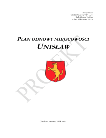 Załącznik do UCHWAŁY Nr VI/…./11 Rady Gminy Unisław z dnia 05 kwietnia 2011 r. PLAN ODNOWY MIEJSCOWOŚCI UNISŁAW Unisław, marzec 2011 roku Spis treści: 1. Charakterystyka miejscowości. .........................................................................................3 2. Inwentaryzacja zasobów służących odnowie miejscowości. ..............................................4 3. Ocena mocnych i słabych stron miejscowości, w której będzie realizowana operacja........8 4. Opis planowanych zadań inwestycyjnych i przedsięwzięć aktywizujących społeczność lokalną. ...........................................................................................................................16 5. Opis i charakterystyka obszarów o szczególnym znaczeniu dla zaspokojenia potrzeb mieszkańców, sprzyjających nawiązywaniu kontaktów społecznych, ze względu na ich położenie oraz cechy funkcjonalno-przestrzenne.............................................................17 2 1. Charakterystyka miejscowości. 1.1. Położenie miejscowości, przynależność administracyjna. Unisław położony jest na 18°23' E i 53°13' N, w środkowej części województwa kujawsko – pomorskiego, w powiecie chełmińskim, w centralnej części kraju przy głównych szlakach komunikacyjnych. Dobrze ukształtowana sieć drogowa wywiera wpływ na życie społeczno – kulturalne, ale przede wszystkim umożliwia rozwój transportu, turystyki i wypoczynku. W miejscowości Unisław występuje skrzyżowanie dróg wojewódzkich nr 551 Strzyżawa-Unisław- Chełmża-Wąbrzeźno, drogi nr 550 Chełmno–Brzozowo-Kokocko-Unislaw oraz drogi nr 597 Rzęczkowo-Cichoradz-Siemoń-Unisław. Unisław położony jest w odległości 30 km od Bydgoszczy, 30 km od Torunia oraz 17 km od Chełmna. Komunikacja pomiędzy poszczególnymi miejscowościami, jak również pobliskimi miastami odbywa się za pomocą własnych środków transportu, komunikacji kolejowej, komunikacji autobusowej i linii prywatnej BUS. Unisław zamieszkuje 3586 mieszkańców, co stanowi 52% ludności gminy Unisław (stan na dzień 31.12.2010 r.). 1.2 Historia miejscowości. W okresie kształtowania się plemiennej organizacji ludów słowiańskich obszar obecnego Unisławia zamieszkany był przez ludność, która dotarła tu zza Wisły ok. VIII stulecia po Chrystusie. W dobie tworzenia się samodzielnego państwa polskiego dobra ziemskie Unisławia znalazły się w zarządzie kasztelanii chełmińskiej, która po 1138 r. weszła w skład Mazowsza. Pierwszym znanym kolonizatorem na obszarze obecnego Unisławia był Żyra z rodu Pawłów – wojewoda mazowiecki. W 1222 r. Unyslau (Unisław) należał w tej okolicy do jednych z najważniejszych warowni, który był ośrodkiem ogniskującym ówczesne życie administracyjno-gospodarcze. Unisław występuje w źródłach historycznych pod nazwami: Unyslau – 1222 r.; Wenczlow – 1285; w latach następnych Wenzlabe, Wenczlaw, Więcław; 1495 r. – Unisław, Wnyslaw, alias Wenczlaw i Wenclaw, Wenzlau; Unisław – 1570 r., a także Dunislaw, Venzlaw. Po przybyciu Krzyżaków na ziemię chełmińską w latach osiemdziesiątych XIII wieku powstało w Unisławiu komturstwo. W Unisławiu znajdował się zamek, w którym mieszkali i urzędowali komturowie: 1289-1295 Dyteryk, 1326 – Henryk oraz wójtowie: Rabe von Kruftele – 1364, Brandecke – 1381, Erwin von Kruftele – 1381-1384, Urlyk von Beyer – 1391, Arnold von Hecke i Kaspar von Prittitz – 1392-1394, Mikołaj von Melin i Wilhelm von Witlich -1398. 2 Po przybyciu Krzyżaków na ziemię chełmińską w latach osiemdziesiątych XIII wieku w Unisławiu mieściła się siedziba komturstwa, włączonego ok. 1384 do komturstwa w Starogrodzie. W 1410 r. po bitwie grunwaldzkiej zamek w Unisławiu został przejściowo zajęty przez wojsko polskie i nadany przez króla Polski Władysławę Jagiełłę kasztelanowi ze Stęszewa. Istniejący przy zamku w Unisławiu folwark, należący do zamku królewskiego w Starogrodzie, w 1495 r. został nadany przez króla Jana I Olbrachta aktem darowizny biskupowi chełmińskiemu Stefanowi z Niedzicy i kapitule chełmińskiej. W 1772 roku ziemia chełmińska dostała się pod zabór pruski, a Unisław stał się ważną osadą, w której mieścił się urząd dominalny dla administracji dóbr rządowych. Według danych z 1893 roku Unisław zamieszkiwało 536 mieszkańców, w tym 333 katolików i 203 ewangelików. W 1902 roku Unisław uzyskał połączenie linią kolejową z Chełmnem, a następnie Bydgoszczą, Chełmżą i Toruniem, która obok przewozów osobowych służyła do przewozów towarowych, przede wszystkim płodów rolnych i towarów przetwórstwa rolno-spożywczego fabryki „Unamel”, słynącej z produkcji sztucznego miodu i syropu, oraz wybudowanej w XIX wieku w Unisławiu cukrowni. W roku 1920 Unisław wrócił w ręce polskie i po reorganizacji powiatu został siedzibą gminy. 2. Inwentaryzacja zasobów służących odnowie miejscowości. 2.1 Zasoby przyrodnicze Według podziału fizyczno-geograficznego Unisław znajduje się w obrębie Pojezierza Chełmińskiego. Rzeźba terenu została ukształtowana w czasie ostatniego zlodowacenia skandynawskiego i wykazuje klasyczne cechy krajobrazu młodoglacjalnego. Rozległe wysoczyzny morenowe i równiny sandrowe rozcinają pradoliny i doliny rzeczne oraz rynny polodowcowe. Zróżnicowanie fizyczno-geograficzne obszaru wywiera konsekwencje dla wszystkich komponentów środowiska geograficznego. Unisław położony jest na wysoczyźnie morenowej na poziomie 84,5 – 100,5 m n.p.m. Część Unisławia znajduje się w obszarze Zespołu Parków Krajobrazowych Chełmińskiego i Nadwiślańskiego, który został utworzony na mocy Zarządzenia Wojewody KujawskoPomorskiego Nr 144/03 z dnia 21 maja 2003 roku z Parku Krajobrazowego Doliny Dolnej Wisły w Świeciu. 4 2.2. Dziedzictwo historyczne, kulturowe i religijne. W zachodniej części miejscowo