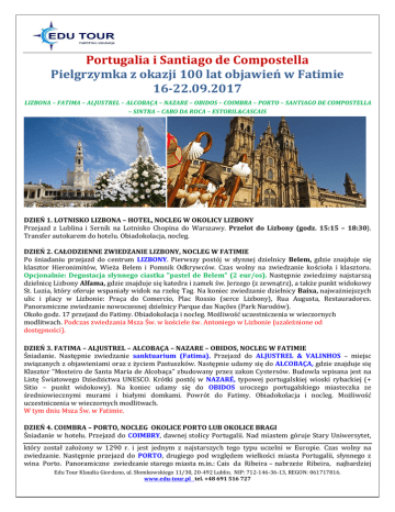 Portugalia i Santiago de Compostella Pielgrzymka z okazji 100 lat objawień w Fatimie 16-22.09.2017 LIZBONA – FATIMA – ALJUSTREL – ALCOBAÇA – NAZARE – OBIDOS – COIMBRA – PORTO – SANTIAGO DE COMPOSTELLA – SINTRA – CABO DA ROCA – ESTORIL&CASCAIS DZIEŃ 1. LOTNISKO LIZBONA – HOTEL, NOCLEG W OKOLICY LIZBONY Przejazd z Lublina i Sernik na Lotnisko Chopina do Warszawy. Przelot do Lizbony (godz. 15:15 – 18:30). Transfer autokarem do hotelu. Obiadokolacja, nocleg. DZIEŃ 2. CAŁODZIENNE ZWIEDZANIE LIZBONY, NOCLEG W FATIMIE Po śniadaniu przejazd do centrum LIZBONY. Pierwszy postój w słynnej dzielnicy Belem, gdzie znajduje się klasztor Hieronimitów, Wieża Belem i Pomnik Odkrywców. Czas wolny na zwiedzanie kościoła i klasztoru. Opcjonalnie: Degustacja słynnego ciastka "pastel de Belem" (2 eur/os). Następnie zwiedzimy najstarszą dzielnicę Lizbony Alfama, gdzie znajduje się katedra i zamek św. Jerzego (z zewnątrz), a także punkt widokowy St. Luzia, który oferuje wspaniały widok na rzekę Tag. Na koniec zwiedzanie dzielnicy Baixa, najważniejszych ulic i placy w Lizbonie: Praça do Comercio, Plac Rossio (serce Lizbony), Rua Augusta, Restauradores. Panoramiczne zwiedzanie nowoczesnej dzielnicy Parque das Nações (Park Narodów). Około godz. 17 przejazd do Fatimy. Obiadokolacja i nocleg. Możliwość uczestniczenia w wieczornych modlitwach. Podczas zwiedzania Msza Św. w kościele św. Antoniego w Lizbonie (uzależnione od dostępności). DZIEŃ 3. FATIMA – ALJUSTREL – ALCOBAÇA – NAZARE – OBIDOS, NOCLEG W FATIMIE Śniadanie. Następnie zwiedzanie sanktuarium (Fatima). Przejazd do ALJUSTREL & VALINHOS – miejsc związanych z objawieniami oraz z życiem Pastuszków. Następnie udamy się do ALCOBAÇA, gdzie znajduje się Klasztor “Mosteiro de Santa Maria de Alcobaça” zbudowany przez zakon Cystersów. Budowla wpisana jest na Listę Światowego Dziedzictwa UNESCO. Krótki postój w NAZARÉ, typowej portugalskiej wioski rybackiej (+ Sitio – punkt widokowy). Na koniec udamy się do OBIDOS uroczego portugalskiego miasteczka ze średniowiecznymi murami i białymi domkami. Powrót do Fatimy. Obiadokolacja i nocleg. Możliwość uczestniczenia w wieczornych modlitwach. W tym dniu Msza Św. w Fatimie. DZIEŃ 4. COIMBRA – PORTO, NOCLEG OKOLICE PORTO LUB OKOLICE BRAGI Śniadanie w hotelu. Przejazd do COIMBRY, dawnej stolicy Portugalii. Nad miastem góruje Stary Uniwersytet, który został założony w 1290 r. i jest jednym z najstarszych tego typu uczelni w Europie. Czas wolny na zwiedzanie. Następnie przejazd do PORTO, drugiego pod względem wielkości miasta Portugalii, słynnego z wina Porto. Panoramiczne zwiedzanie starego miasta m.in.: Cais da Ribeira – nabrzeże Ribeira, najbardziej Edu Tour Klaudia Giordano, ul. Słomkowskiego 11/30, 20-492 Lublin. NIP: 712-146-36-13, REGON: 061717816. www.edu-tour.pl tel. +48 691 516 727 typowego i malowniczego miejsca w Porto, Igreja de São Francisco – kościół świętego Franciszka i Sé – katedry. Opcjonalnie wizyta połączona z degustacją w jednej z wytwórni win Porto (nie zawarta w cenie). Opcjonalnie Rejs po rzece DOURO ok. 50 min. (11 eur/os) Przejazd do hotelu w okolicach Porto lub Bragi na obiadokolację i nocleg. W tym dniu Msza Św. rano w Fatimie. DZIEŃ 5. CALODZIENNA WYCIECZKA DO SANTIAGO DE COMPOSTELA, NOCLEG PORTO OKOLICE LUB OKOLICE BRAGI Po śniadaniu przejazd do SANTIAGO DE COMPOSTELA (HISZPANIA), najbardziej znany hiszpański ośrodek kultu i cel pielgrzymek. Katedra w Santiago de Compostela stanowi sanktuarium św. Jakuba i znajduje się na Liście Światowego Dziedzictwa UNESCO. Powrót do hotelu. Obiadokolacja i nocleg. W tym dniu Msza Św. w Katedrze w Santiago. DZIEŃ 6. SINTRA – CABO DA ROCA – ESTORIL&CASCAIS, NOCLEG OKOLICE LIZBONY Śniadanie w hotelu. Po śniadaniu przejazd do pełnej mistycyzmu, romantyzmu i średniowiecznych pałaców SINTRY (znajduje się na liście światowego dziedzictwa UNESCO). Czas wolny na spacer po niezwykle malowniczych uliczkach miasta. Postój w CABO DA ROCA – najbardziej za zachód wysunięty punkt Europy. Na koniec panoramiczne zwiedzanie ESTORIL & CASCAIS – dwóch malowniczych kurortów w okolicy Lizbony. Obiadokolacja i nocleg w hotelu w okolicy Lizbony. Poranna Msza Św. w hotelu. DZIEŃ 7. HOTEL LIZBONA – LOTNISKO LIZBONA Wykwaterowanie z hotelu, lunch pakiet za śniadanie. Transfer na lotnisko w Lizbonie. Wylot do Warszawy (godz. 9:30 – 14:25) na lotnisko Chopina. Powrót autokarem do Lublina. Zakończenie pielgrzymki. CENA: 3 680 PLN/os. przy 40 os. płatnych Msza Święta każdego dnia pielgrzymki Cena zawiera: transfery autokarowe Lublin – Lotnisko im. F. Chopina w Warszawie – Lublin; bilet lotniczy na trasie Warszawa – Lizbona – Warszawa; transfery miejscowym autokarem podczas całej pielgrzymki; ubezpieczenie KL i NNW; zakwaterowanie w hotelach 3*** na terenie Portugalii – 6 noclegów, pokoje 2 os; wyżywienie HB – śniadania oraz obiadokolacje; napoje do obiadokolacji ¼ l wody + ¼ l wina/os; opiekę pilota/przewodnika w języku polskim; obowiązkową opłatę na Turystyczny Fundusz Gwarancyjny. Cena nie zawiera: wydatków własnych uczestników; biletów wstępu do zwiedzanych obiektów, na które należy przeznaczyć ok. 40 eur/os (płatne pilotowi); atrakcji fakultatywnych organizowanych na życzenie uczestników. Należy posiadać ważny dokument tożsamości – dowód osobisty lub paszport. Kolejność zwiedzania może ulec zmianie! Edu Tour Klaudia Giordano, ul. Słomkowskiego 11/30, 20-492 Lublin. NIP: 712-146-36-13, REGON: 061717816. www.edu-tour.pl tel. +48 691 516 727