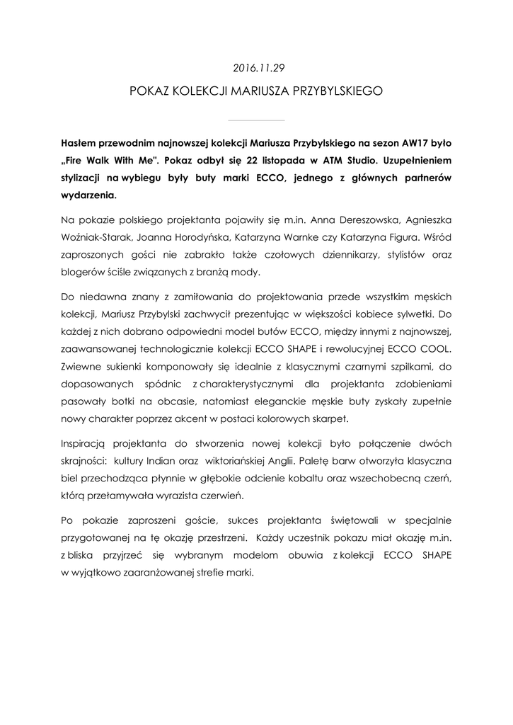2016.11.29 POKAZ KOLEKCJI MARIUSZA PRZYBYLSKIEGO Hasłem przewodnim najnowszej kolekcji Mariusza Przybylskiego na sezon AW17 było „Fire Walk With Me". Pokaz odbył się 22 listopada w ATM Studio. Uzupełnieniem stylizacji na wybiegu były buty marki ECCO, jednego z głównych partnerów wydarzenia. Na pokazie polskiego projektanta pojawiły się m.in. Anna Dereszowska, Agnieszka Woźniak-Starak, Joanna Horodyńska, Katarzyna Warnke czy Katarzyna Figura. Wśród zaproszonych gości nie zabrakło także czołowych dziennikarzy, stylistów oraz blogerów ściśle związanych z branżą mody. Do niedawna znany z zamiłowania do projektowania przede wszystkim męskich kolekcji, Mariusz Przybylski zachwycił prezentując w większości kobiece sylwetki. Do każdej z nich dobrano odpowiedni model butów ECCO, między innymi z najnowszej, zaawansowanej technologicznie kolekcji ECCO SHAPE i rewolucyjnej ECCO COOL. Zwiewne sukienki komponowały się idealnie z klasycznymi czarnymi szpilkami, do dopasowanych spódnic z charakterystycznymi dla projektanta zdobieniami pasowały botki na obcasie, natomiast eleganckie męskie buty zyskały zupełnie nowy charakter poprzez akcent w postaci kolorowych skarpet. Inspiracją projektanta do stworzenia nowej kolekcji było połączenie dwóch skrajności: kultury Indian oraz wiktoriańskiej Anglii. Paletę barw otworzyła klasyczna biel przechodząca płynnie w głębokie odcienie kobaltu oraz wszechobecną czerń, którą przełamywała wyrazista czerwień. Po pokazie zaproszeni goście, sukces projektanta świętowali w specjalnie przygotowanej na tę okazję przestrzeni. Każdy uczestnik pokazu miał okazję m.in. z bliska przyjrzeć się wybranym modelom w wyjątkowo zaaranżowanej strefie marki. obuwia z kolekcji ECCO SHAPE O marce ECCO ECCO jest światowym liderem wśród marek obuwniczych łączącym styl i komfort. Firma zbudowała swój sukces na designie, skórze wysokiej jakości oraz innowacyjnej technologii. Założona w 1963 roku marka ECCO jest jednym z największych producentów obuwia na świecie, który czuwa i zarządza każdym etapem produkcji skóry, butów czy sprzedaży detalicznej. ECCO należy także do największych producentów wysokiej jakości skóry – zdaniem klientów jest wiodącą marką luksusową na skalę światową. Dzisiaj buty i akcesoria ECCO są sprzedawane w 88 krajach w 3 060 sklepach oraz 14 000 punktów sprzedaży na całym świecie. Firma prowadzona przez rodzinę zatrudnia obecnie 19 800 pracowników na świecie. pl.ecco.com