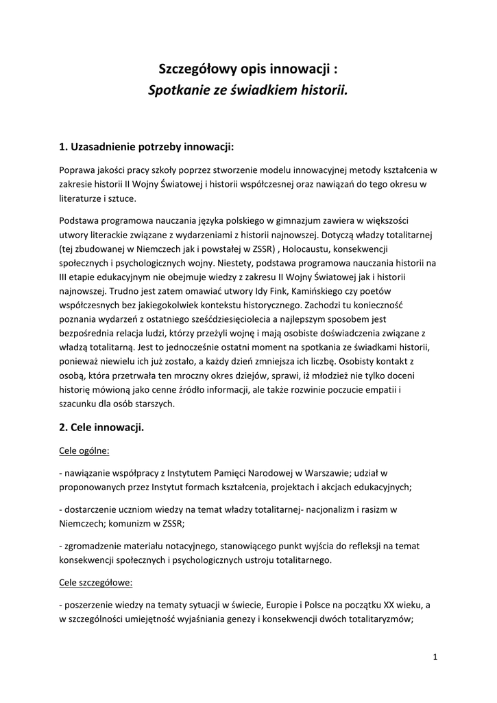 Szczegółowy opis innowacji : Spotkanie ze świadkiem historii. 1. Uzasadnienie potrzeby innowacji: Poprawa jakości pracy szkoły poprzez stworzenie modelu innowacyjnej metody kształcenia w zakresie historii II Wojny Światowej i historii współczesnej oraz nawiązań do tego okresu w literaturze i sztuce. Podstawa programowa nauczania języka polskiego w gimnazjum zawiera w większości utwory literackie związane z wydarzeniami z historii najnowszej. Dotyczą władzy totalitarnej (tej zbudowanej w Niemczech jak i powstałej w ZSSR) , Holocaustu, konsekwencji społecznych i psychologicznych wojny. Niestety, podstawa programowa nauczania historii na III etapie edukacyjnym nie obejmuje wiedzy z zakresu II Wojny Światowej jak i historii najnowszej. Trudno jest zatem omawiać utwory Idy Fink, Kamińskiego czy poetów współczesnych bez jakiegokolwiek kontekstu historycznego. Zachodzi tu konieczność poznania wydarzeń z ostatniego sześćdziesięciolecia a najlepszym sposobem jest bezpośrednia relacja ludzi, którzy przeżyli wojnę i mają osobiste doświadczenia związane z władzą totalitarną. Jest to jednocześnie ostatni moment na spotkania ze świadkami historii, ponieważ niewielu ich już zostało, a każdy dzień zmniejsza ich liczbę. Osobisty kontakt z osobą, która przetrwała ten mroczny okres dziejów, sprawi, iż młodzież nie tylko doceni historię mówioną jako cenne źródło informacji, ale także rozwinie poczucie empatii i szacunku dla osób starszych. 2. Cele innowacji. Cele ogólne: - nawiązanie współpracy z Instytutem Pamięci Narodowej w Warszawie; udział w proponowanych przez Instytut formach kształcenia, projektach i akcjach edukacyjnych; - dostarczenie uczniom wiedzy na temat władzy totalitarnej- nacjonalizm i rasizm w Niemczech; komunizm w ZSSR; - zgromadzenie materiału notacyjnego, stanowiącego punkt wyjścia do refleksji na temat konsekwencji społecznych i psychologicznych ustroju totalitarnego. Cele szczegółowe: - poszerzenie wiedzy na tematy sytuacji w świecie, Europie i Polsce na początku XX wieku, a w szczególności umiejętność wyjaśniania genezy i konsekwencji dwóch totalitaryzmów; 1 - rozwijanie w młodych ludziach postawy antywojennej, poszanowania praw człowieka i narodów do samostanowienia, tolerancji; -wejście w dorosłe życie bez uprzedzeń i przemilczeń, związanych z wiedzą na temat wydarzeń historycznych; - zdobycie wiedzy na temat deportacji ludności polskiej do nazistowskich obozów i miejsc pracy przymusowej oraz deportacji z Kresów Wschodnich do łagrów i w głąb ZSRR; - poznanie warunków życia w łagrach i obozach koncentracyjnych; - zdobywanie wiedzy na temat indywidualnych losów kobiet i mężczyzn –byłych więźniów obozów koncentracyjnych i łagrów w czasie II wojny światowej; - sposoby przygotowywania się do spotkania się ze światkami historii, formułowanie pytań i przeprowadzanie rozmowy ze świadkami historii; - umiejętność wykorzystywania świadectwa autobiograficznego świadków, które pozwolą im zejść z abstrakcyjnego poziomu podręcznikowych danych statystycznych do poziomu losów konkretnej jednostki; - nauczenie dokumentowania relacji światków historii w formie notacji historycznej; - rozwijanie krytycznego podejścia do źródeł historycznych; - rozwijanie poczucia empatii i szacunku w stosunku do osób starszych, doświadczonych przez piekło obozów koncentracyjnych i łagrów; - rozwijanie umiejętności pracy w zespole; -rozwijanie umiejętności interpersonalnych; -uświadomienie, jakie wartości i postawy pozwoliły przetrwać jednostkom w ekstremalnych warunkach; - sformułowanie własnych refleksji na temat represyjności systemu totalitarnemu; - docenienie historii mówionej jako cennego źródła informacji historycznej. 3.Zasady innowacji: Program realizowany będzie w klasie II i III gimnazjum w oparciu o materiały własne nauczyciela, dostępne źródła historyczne, materiały udostępnione przez IPN w Warszawie, relacje świadków historii. Zajęcia odbywać się będą na terenie szkoły, w IPN w Warszawie, w siedzibie Związku Sybiraków w Warszawie. Wywiady ze świadkiem historii odbędą się w miejscu wskazanym przez niego. Podsumowanie pracy w roku szkolnym 2014/2015 odbędzie się na terenie byłego obozu w Ravensbruck w Niemczech. 2 4. Efekty innowacji: - dokumentacja zdjęciowa; wystawa na terenie szkoły; - eseje uczniów na wybrany temat, związany z tematem innowacji (prasa lokalna); - zwiastuny notacji i notacje, prezentowane w IPN w Warszawie oraz dla uczniów, rodziców i nauczycieli w czasie lekcji otwartej; - gromadzenie i usystematyzowanie wiedzy z zakresu historii najnowszej; - umiejętność posługiwania się nowoczesnymi technologiami informacyjnymi; - realizacja celów ogólnych i szczegółowych, zawartych w opisie innowacji. Opracowała Jolanta Brycka 3 Szczegółowy harmonogram zajęć w I półroczu 2014/2015. L.p. Termin Zadanie 1. Wrzesień Nawiązanie współpracy z instytucjami wspomagającymi szkołę - IPN Warszawa, Muzeum POLIN Warszawa, CEF Wołomin 2. 23.X.2014 Lekcja na żywo „Opowieść o Żydach polskich” 3. 4. 5. Organizator Wykonawcy/uczestnicy Uwagi K. Szymańska-dyrektor J. Brycka, nauczyciel Zrealizowano MEN, Muzeum POLIN, Biuro Edukacji m. ST. Warszawy J. Brycka, W. Czuba, P. Brzycki Certyfikat udziału 29.X.2014- Udział w projekcie edukacyjnym IPN VI. 2015 Warszawa: „ O tym nie można zapomnieć…- Kobiety, które przeszły piekło obozów i łagrów” IPN Warszawa J. Brycka 7. XI-7.XII. 2014 Wystawa udostępniona z IPN Warszawa Wystawa:” Z największą brutalnością-zbrodnie Wehrmachtu w Polsce, wrzesień- październik 1939” 21.XI.2014 Lekcja w kinie: ”Złodziejka książek” Uczestnicy: uczniowie klas II i III A. Maszkowska, M. Mrówczyński, K. Sroka, W. Rypkowska, K. Szymańska, J. Brycka, Rada Rodziców Pierwsze spotkanie w cyklu. Zrealizowano Cała społeczność szkolna oraz 