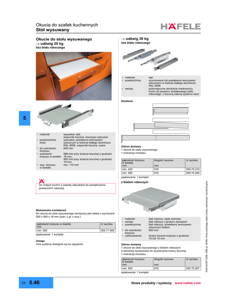Okucia do szafek kuchennych StóŽ wysuwany Firma zastrzega sobie zmiany wymiarowe i konstrukcyjne. ›"udawig 30 kg Wyposacenie mebli kuchennych i ŽazienkowychOkucia do szafek kuchennychStóŽ wysuwanyNowe produkty i systemyNowe produkty i systemyPlanowanie, konstrukcja Okucie do stoŽu wysuwanego ›"udawig 20 kg bez blatu roboczego bez blatu roboczego • materiaŽ: • powierzchnia: • wersja: stal ocynkowana lub powlekana tworzywem sztucznym w kolorze biaŽego aluminium, RAL 9006 automatyczne obnicanie maskownicy frontu do poziomu dodatkowego blatu roboczego, z boczn> osŽon> systemu oku5 DziaŽanie 5 • materiaŽ: • powierzchnia/ kolor: wysuwka: stal, wsporniki boczne: tworzywo sztuczne wysuwka: powlekana tworzywem sztucznym w kolorze biaŽego aluminium, RAL 9006, wsporniki boczne: szare 600 mm • do szerokoWci korpusu: • szerokoW5 568 mm przy Wciance bocznej o gruboWci korpusu w Wwietle: 16 mm, 562 mm przy Wciance bocznej o gruboWci 19 mm • wys. korpusu min. 110 mm w Wwietle: Zakres dostawy 1 okucie do stoŽu wysuwanego 1 instrukcja montacu gŽCbokoW5 korpusu w Wwietle mm min. 420 min. 500 dŽugoW5 wysuwu nr wyrobu mm 610 810 505.70.210 505.70.200 z blatem roboczym Do maŽych kuchni o zwartej zabudowie do powiCkszenia powierzchni roboczej. Wskazówka montacowa Do okucia do stoŽu wysuwanego konieczny jest wkŽad o wymiarach 555 x 460 x 16 mm (szer. x gŽ. x wys.). gŽCbokoW5 korpusu w Wwietle mm min. 500 opakowanie: 1 komplet Uwaga Inne systemy dostCpne s> na zapytanie. nr wyrobu 505.71.900 • materiaŽ: • wersja: • powierzchnia: • do szerokoWci korpusu: • zastosowanie: blat roboczy: pŽyta wiórowa blat roboczy z grubym obrzecem blat roboczy: powlekany tworzywem sztucznym biaŽym 600 mm Wciany boczne korpusu o grubosci 16 lub 19 mm Zakres dostawy 1 okucie do stoŽu wysuwanego z blatem roboczym 2 elementy dystansowe do wyrównania Wciany bocznej 1 instrukcja montacu gŽCbokoW5 korpusu w Wwietle mm min. 500 dŽugoW5 wysuwu nr wyrobu mm 810 505.70.207 opakowanie: 1 komplet FF 5.46 Nowe produkty i systemy www.hafele.com DGH-M-INT 2008, HDE-pl, 09/08; Firma zastrzega sobie zmiany wymiarowe i konstrukcyjne. opakowanie: 1 komplet