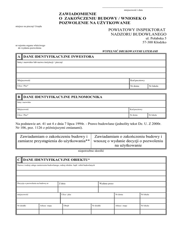 _________________________________ miejscowość i data ZAWIADOMIENIE O ZAKOŃCZENIU BUDOWY / WNIOSEK O POZWOLENIE NA UŻYTKOWANIE miejsce na pieczęć Urzędu POWIATOWY INSPEKTORAT NADZORU BUDOWLANEGO ul. Połabska 5 57-300 Kłodzko nr rejestru organu właściwego do wydania pozwolenia WYPEŁNIĆ DRUKOWANYMI LITERAMI A DANE IDENTYFIKACYJNE INWESTORA Imię i nazwisko lub nazwa instytucji / pieczęć Miejscowość Kod pocztowy Ulica / Plac* Nr domu Nr lokalu B DANE IDENTYFIKACYJNE PEŁNOMOCNIKA Imię i nazwisko Miejscowość Kod pocztowy Ulica / Plac* Nr domu Nr lokalu Na podstawie art. 41 ust 4 z dnia 7 lipca 1994r. - Prawo budowlane (jednolity tekst Dz. U. Z 2000r. Nr 106, poz. 1126 z późniejszymi zmianami). Zawiadamiam o zakończeniu budowy i Zawiadamiam o zakończeniu budowy i zamiarze przystąpienia do użytkowania** wnoszę o wydanie decyzji o pozwoleniu na użytkowanie niepotrzebne skreślić C DANE IDENTYFIKACYJNE OBIEKTU* Nazwa i rodzaj całego zamierzenia budowlanego, rodzaj obiektu bądź robót budowlanych Decyzja o pozwoleniu na budowę nr miejscowość Nr działki Z dnia Wydana przez Ulica / plac Arkusz mapy Obręb Nr działki Nr domu Nr lokalu Arkusz mapy Nr lokalu DO WNIOSKU DOŁĄCZAM: ILOŚĆ: 1 Oryginał dziennika budowy 1 2 Oświadczenie kierownika budowy (w przypadku nieistotnych zmian potwierdzone przez projektanta i inspektora nadzoru inwestorskiego) 1 3 Oświadczenie braku sprzeciwu organów wymienionych w art. 56 (w przypadku obowiązku uzyskania pozwolenia na użytkowanie) 4 Oświadczenie inwestora o właściwym zagospodarowaniu terenów przyległych, jeżeli eksploatacja wybudowanego obiektu jest uzależniona od ich odpowiedniego zagospodarowania Protokoły badań i sprawdzeń: ✔ przewodów kominowych ✔ instalacji gazowej ✔ instalacji elektrycznej i odgromowej 5 ✔ instalacji wodno - kanalizacyjnej 6 Inwentaryzację geodezyjną powykonawczą 7 Dokumenty potwierdzające zastosowanie wyrobów budowlanych dopuszczonych do powszechnego lub jednostkowego stosowania w budownictwie (art. 10) Prawa budowlanego) 8 Kopie rysunków wchodzących w skład zatwierdzonego projektu budowlanego, z naniesionymi zmianami, w razie potrzeby także uzupełniający opis 9 Pełnomocnictwo udzielone osobie działającej w imieniu inwestora (opłata skarbowa 15 zł) ...................................................................... (podpis inwestora lub pełnomocnika) Dane o budynku zgłoszonym do użytku potrzebne do ewidencji GUS Inwestor: (adres: miejscowość, ulica, nr. budynku) 1 Adres budowy (miejscowość, ulica, nr. budynku, nr. działki) 2 3 Który budynek na posesji: 4 Obiekt*: zamknięty, nie zamknięty 5 Oddanie do użytku*: całości, części 6 Użytkowanie*: własne, na wynajem 7 Budowa*: nowy, rozbudowa, adaptacja 8 Wyposażenie budynku*:sanitariaty; C.O., gaz, wodociąg (sieć, studnia), elektryczność 9 Technologia wznoszenia: 10 Rodzaj ścian*: drewniane, murowane, inne......................................................... Data rozpoczęcia budowy......................................(miesiąc, rok) 11 Data zakończenia budowy.....................................(miesiąc, rok) Powierzchnia zabudowy:.................................. Powierzchnia użytkowy:................................... Kubatura:.......................................................... Liczba mieszkań:.............................................. Ilość izb mieszkalnych – pokoje + kuchnia (dla każdego mieszkania oddzielnie): 12 ....................................................................................................................................................... Ilość kondygnacji........................................................................................................................... * właściwe podkreślić ............................................................... (pieczęć i podpis kierownika budowy)