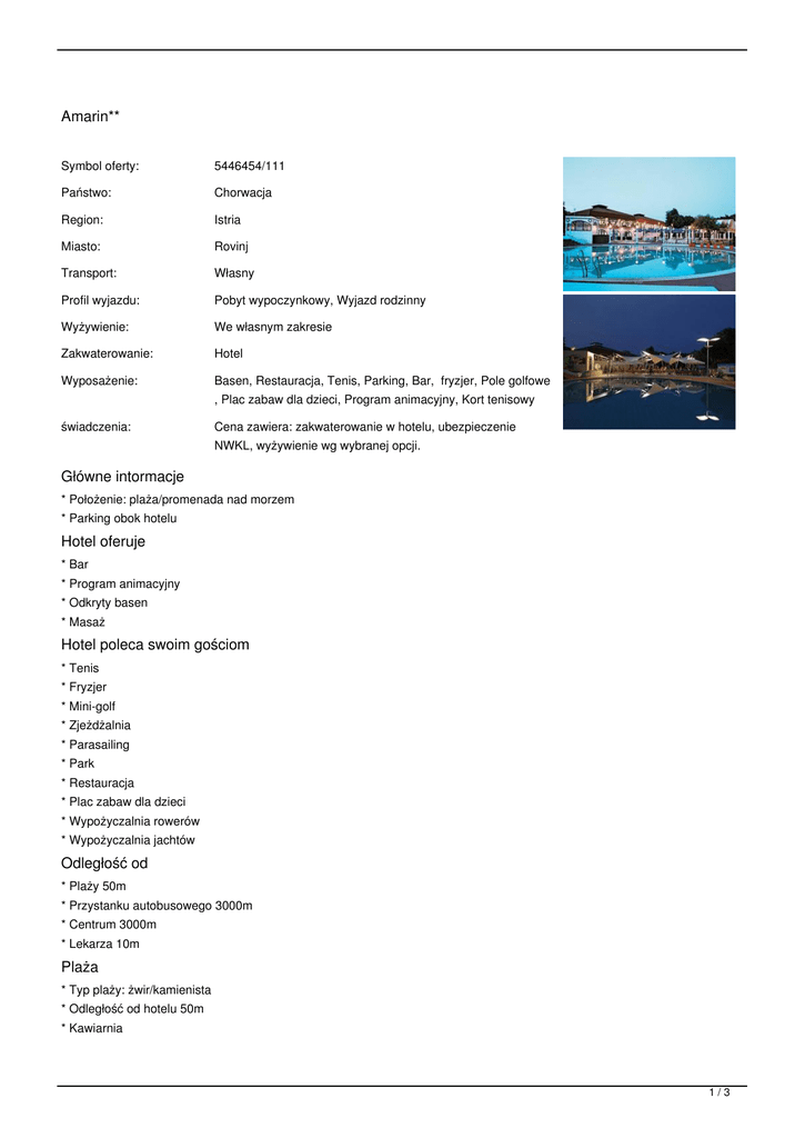 Amarin** Symbol oferty: 5446454/111 Państwo: Chorwacja Region: Istria Miasto: Rovinj Transport: Własny Profil wyjazdu: Pobyt wypoczynkowy, Wyjazd rodzinny Wyżywienie: We własnym zakresie Zakwaterowanie: Hotel Wyposażenie: Basen, Restauracja, Tenis, Parking, Bar, fryzjer, Pole golfowe świadczenia: Cena zawiera: zakwaterowanie w hotelu, ubezpieczenie , Plac zabaw dla dzieci, Program animacyjny, Kort tenisowy NWKL, wyżywienie wg wybranej opcji. Główne intormacje * Położenie: plaża/promenada nad morzem * Parking obok hotelu Hotel oferuje * Bar * Program animacyjny * Odkryty basen * Masaż Hotel poleca swoim gościom * Tenis * Fryzjer * Mini-golf * Zjeżdżalnia * Parasailing * Park * Restauracja * Plac zabaw dla dzieci * Wypożyczalnia rowerów * Wypożyczalnia jachtów Odległość od * Plaży 50m * Przystanku autobusowego 3000m * Centrum 3000m * Lekarza 10m Plaża * Typ plaży: żwir/kamienista * Odległość od hotelu 50m * Kawiarnia 1/3 Uwagi Istnieje możliwość jednej dostawki w pokoju 2 osobowym. Pokój klasy A - 4 gwiazdkowy, niedawno odnowiony. Pokój klasy B - 2 gwiazdkowy, nieodnawiany. TERMINY: od: 2017-04-12 do: 2017-04-19 (8 dni), miejsca: zamów cena od: 880 PLN = 202 EUR od: 2017-04-12 do: 2017-04-26 (15 dni), miejsca: zamów cena od: 1761 PLN = 404 EUR od: 2017-04-19 do: 2017-04-26 (8 dni), miejsca: zamów cena od: 880 PLN = 202 EUR od: 2017-04-19 do: 2017-05-03 (15 dni), miejsca: zamów cena od: 1761 PLN = 404 EUR od: 2017-04-26 do: 2017-05-03 (8 dni), miejsca: zamów cena od: 880 PLN = 202 EUR od: 2017-04-26 do: 2017-05-10 (15 dni), miejsca: zamów cena od: 1761 PLN = 404 EUR od: 2017-05-03 do: 2017-05-10 (8 dni), miejsca: zamów cena od: 880 PLN = 202 EUR od: 2017-05-03 do: 2017-05-17 (15 dni), miejsca: zamów cena od: 1761 PLN = 404 EUR od: 2017-05-10 do: 2017-05-17 (8 dni), miejsca: zamów cena od: 880 PLN = 202 EUR od: 2017-05-10 do: 2017-05-24 (15 dni), miejsca: zamów cena od: 1761 PLN = 404 EUR od: 2017-05-17 do: 2017-05-24 (8 dni), miejsca: zamów cena od: 880 PLN = 202 EUR od: 2017-05-17 do: 2017-05-31 (15 dni), miejsca: zamów cena od: 2136 PLN = 490 EUR od: 2017-05-24 do: 2017-05-31 (8 dni), miejsca: zamów cena od: 1255 PLN = 288 EUR od: 2017-05-24 do: 2017-06-07 (15 dni), miejsca: zamów cena od: 2510 PLN = 576 EUR od: 2017-05-31 do: 2017-06-07 (8 dni), miejsca: zamów cena od: 1255 PLN = 288 EUR od: 2017-05-31 do: 2017-06-14 (15 dni), miejsca: zamów cena od: 2510 PLN = 576 EUR od: 2017-06-07 do: 2017-06-14 (8 dni), miejsca: zamów cena od: 1255 PLN = 288 EUR od: 2017-06-07 do: 2017-06-21 (15 dni), miejsca: zamów cena od: 2510 PLN = 576 EUR od: 2017-06-14 do: 2017-06-21 (8 dni), miejsca: zamów cena od: 1255 PLN = 288 EUR od: 2017-06-14 do: 2017-06-28 (15 dni), miejsca: zamów cena od: 2750 PLN = 631 EUR od: 2017-06-21 do: 2017-06-28 (8 dni), miejsca: zamów cena od: 1495 PLN = 343 EUR od: 2017-06-21 do: 2017-07-05 (15 dni), miejsca: zamów cena od: 2990 PLN = 686 EUR od: 2017-06-28 do: 2017-07-05 (8 dni), miejsca: zamów cena od: 1495 PLN = 343 EUR od: 2017-06-28 do: 2017-07-12 (15 dni), miejsca: zamów cena od: 2990 PLN = 686 EUR od: 2017-07-05 do: 2017-07-12 (8 dni), miejsca: zamów cena od: 1495 PLN = 343 EUR od: 2017-07-05 do: 2017-07-19 (15 dni), miejsca: zamów cena od: 2990 PLN = 686 EUR od: 2017-07-12 do: 2017-07-19 (8 dni), miejsca: zamów cena od: 1495 PLN = 343 EUR od: 2017-07-12 do: 2017-07-26 (15 dni), miejsca: zamów cena od: 3147 PLN = 722 EUR od: 2017-07-19 do: 2017-07-26 (8 dni), miejsca: zamów cena od: 1652 PLN = 379 EUR od: 2017-07-19 do: 2017-08-02 (15 dni), miejsca: zamów cena od: 3304 PLN = 758 EUR od: 2017-07-26 do: 2017-08-02 (8 dni), miejsca: zamów cena od: 1652 PLN = 379 EUR od: 2017-07-26 do: 2017-08-09 (15 dni), miejsca: zamów cena od: 3304 PLN = 758 EUR od: 2017-08-02 do: 2017-08-09 (8 dni), miejsca: zamów cena od: 1652 PLN = 379 EUR od: 2017-08-02 do: 2017-08-16 (15 dni), miejsca: zamów cena od: 3304 PLN = 758 EUR od: 2017-08-09 do: 2017-08-16 (8 dni), miejsca: zamów cena od: 1652 PLN = 379 EUR od: 2017-08-09 do: 2017-08-23 (15 dni), miejsca: zamów cena od: 3147 PLN = 722 EUR od: 2017-08-16 do: 2017-08-23 (8 dni), miejsca: zamów cena od: 1495 PLN = 343 EUR od: 2017-08-16 do: 2017-08-30 (15 dni), miejsca: zamów cena od: 2990 PLN = 686 EUR od: 2017-08-23 do: 2017-08-30 (8 dni), miejsca: zamów cena od: 1495 PLN = 343 EUR od: 2017-08-23 do: 2017-09-06 (15 dni), miejsca: zamów cena od: 2750 PLN = 631 EUR od: 2017-08-30 do: 2017-09-06 (8 dni), miejsca: zamów cena od: 1255 PLN = 288 EUR od: 2017-08-30 do: 2017-09-13 (15 dni), miejsca: zamów cena od: 2510 PLN = 576 EUR od: 2017-09-06 do: 2017-09-13 (8 dni), miejsca: zamów cena od: 1255 PLN = 288 EUR 2/3 od: 2017-09-06 do: 2017-09-20 (15 dni), miejsca: zamów cena od: 2136 PLN = 490 EUR od: 2017-09-13 do: 2017-09-20 (8 dni), miejsca: zamów cena od: 880 PLN = 202 EUR CENNIK: Długość pobytu: 15 dni 8 dni 15 dni 8 dni 8 dni 15 dni 8 dni 15 dni Grupa cenowa: A A D D C C B B (-) (-) (-) (-) (-) (-) (-) (-) -176 -88 -176 -88 -88 -176 -88 -176 176 88 176 88 88 176 88 176 285 275 550 221 442 (-) (-) (-) (-) (-) (-) (-) (-) (-) (-) 427 413 826 331 662 Wyżywienie (do wyboru) (*) śniadania i obiadokolacje śniadanie Inne (opcjonalne) zwierzę domowe Pobyt w obiekcie (do wyboru) Pokój 2 osobowy kategorii A standardowo dla osób: 2 220 110 570 Pokój 2 os. klasy B, z dostawką standardowo dla osób: 3 (-) (-) (-) (*) Pokój 2 osobowy kategorii B standardowo dla osób: 2 (-) (-) (-) Pokój 2 os. klasy A, z dostawką standardowo dla osób: 3 330 165 854 Ubezpieczenie (do wyboru) (*) ubezpieczenie NW KL Inne (opcjonalne) łóżeczko dla dziecka 14 7 14 7 7 14 7 14 88 44 88 44 44 88 44 88 -20 % -20 % -20 % -20 % -20 % -20 % -50 % -50 % -50 % -50 % -50 % -50 % -100 % -100 % -100 % -100 % -100 % -100 % (-) (-) (-) (-) (-) (-) -25 % -25 % -25 % -25 % -25 % -25 % 2.4 % 2.4 % 2.4 % 2.4 % 2.4 % 2.4 % 2.4 % 362 181 716 358 322 644 267 534 28 14 28 14 14 28 14 28 Rodzaj osoby 