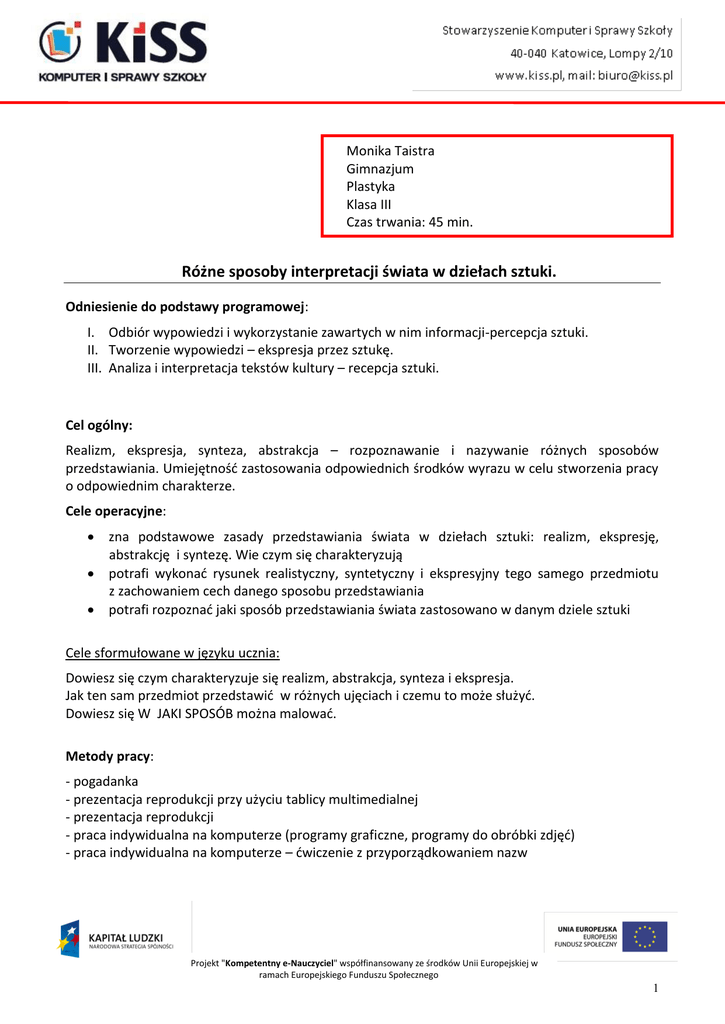 Monika Taistra Gimnazjum Plastyka Klasa III Czas trwania: 45 min. Różne sposoby interpretacji świata w dziełach sztuki. Odniesienie do podstawy programowej: I. Odbiór wypowiedzi i wykorzystanie zawartych w nim informacji-percepcja sztuki. II. Tworzenie wypowiedzi – ekspresja przez sztukę. III. Analiza i interpretacja tekstów kultury – recepcja sztuki. Cel ogólny: Realizm, ekspresja, synteza, abstrakcja – rozpoznawanie i nazywanie różnych sposobów przedstawiania. Umiejętność zastosowania odpowiednich środków wyrazu w celu stworzenia pracy o odpowiednim charakterze. Cele operacyjne: zna podstawowe zasady przedstawiania świata w dziełach sztuki: realizm, ekspresję, abstrakcję i syntezę. Wie czym się charakteryzują potrafi wykonać rysunek realistyczny, syntetyczny i ekspresyjny tego samego przedmiotu z zachowaniem cech danego sposobu przedstawiania potrafi rozpoznać jaki sposób przedstawiania świata zastosowano w danym dziele sztuki Cele sformułowane w języku ucznia: Dowiesz się czym charakteryzuje się realizm, abstrakcja, synteza i ekspresja. Jak ten sam przedmiot przedstawić w różnych ujęciach i czemu to może służyć. Dowiesz się W JAKI SPOSÓB można malować. Metody pracy: - pogadanka - prezentacja reprodukcji przy użyciu tablicy multimedialnej - prezentacja reprodukcji - praca indywidualna na komputerze (programy graficzne, programy do obróbki zdjęć) - praca indywidualna na komputerze – ćwiczenie z przyporządkowaniem nazw Projekt "Kompetentny e-Nauczyciel" współfinansowany ze środków Unii Europejskiej w ramach Europejskiego Funduszu Społecznego 1 Formy pracy: praca z klasą Środki dydaktyczne: reprodukcje w formie cyfrowej, reprodukcje na planszach (dołączone do podręcznika), prezentacja, tablet graficzny, tablica multimedialna, farby- tempery lub akryle) Przebieg lekcji: Część Przebieg Uwagi Prolog Ćwiczenie wprowadzające: (Opcjonalnie 1. Prezentacja kilku reprodukcji obrazów (portretów) jeśli np. uczniowie -uczniowie dzielą obrazy na trzy grupy, według mają już być sposobu przedstawiania (podobny sposób przygotowani do malowania). lekcji) 1.Wprowadzenie 5-10 min 2. Wprowadzenie pojęć: SYNTEZA, ABSTRAKCJA. REALIZM, EKSPRESJA, 3. Prezentacja obrazu abstrakcyjnego. 4. Przyporządkowanie wyżej wymienionych pojęć do każdej grupy obrazów. 5. Prezentacja reprodukcji (teczka reprodukcji dołączona do podręcznika „Kraina sztuki”)wspólne nazywanie danego sposobu przedstawiania. Reprodukcja na planszy dołączonej do podręcznika Kraina Sztuki PWN 6. Ćwiczenie- interpretacja obrazu: pozostawiamy jeden obraz z każdego sposobu przedstawiania uczniowie wskazują cechy charakterystyczne danego sposobu malowania (dyskusja) ćwiczenie utrwalające: uczniowie umieszczają odpowiednie hasła związane ze sposobem malowania pod pojęciami poznanymi na lekcji i reprodukcjami. 2.Część zasadnicza ok.35 min 7. Praca twórcza: Wykonanie pracy plastycznej na wybrany przez nauczyciela temat: „Roztargnienie”, „Jesienne drzewo na wietrze”, „W promieniach wschodzącego słońca-kwiat” (w zależności od klasy) Grupa I- wykonanie ekspresyjnej pracy malarskiej Grupa II- wykonanie ekspresyjnej pracy Projekt "Kompetentny e-Nauczyciel" współfinansowany ze środków Unii Europejskiej w ramach Europejskiego Funduszu Społecznego 2 graficznej przy pomocy tabletu graficznego Grupa III- edycja fotografii (zmiana saturacji, barw, nałożenia filtrów etc.)- stworzenie obrazu ekspresyjnego i syntetycznego. 3.Ewaluacja/pods umowanie ok. 5 min 8. Wspólne omówienie wybranych prac. 9. Zadanie domowe: Stwórz emotikona, który będzie Twoją wizytówką (powinien oddawać Twój charakter, zainteresowania itp.). Pamiętaj jakich środków wyrazu musisz użyć by stworzyć obraz syntetyczny. Załączniki: Prezentacja Bibliografia: ikona http://szumimi.blogspot.com/2010/03/ikona-droga-do-piekna.html jerzy-nowosielskihttp://areopag21.pl/prawoslawny_areopag/artykul_294_zapisy-navirgin-of-czestochowa kolokwium-u-prof-nowosielskiego-rozpoczete.html Jerzy Nowosielski Akt http://www.4beauty.com/pl/aukcje_dzielo_szczegoly.aspx?adsid=7 7&auid=1&pid=938&Page= modigliani-jeanne http://www.google.pl/imgres?imgurl=http%3A%2F%2Fwww.artstor e.pl%2Fwp-content%2Fgfx%2Fmodiglianijeanne.jpg&imgrefurl=http%3A%2F%2Fartstore.pl%2Fdostojnetwarze-modiglianiego&h=709&w=591&tbnid=y2gplM3_7L2DM%3A&zoom=1&docid=LgOejLUi9DTwmM&ei=u0yE U9zoEOw7Ab8tYHQBQ&tbm=isch&ved=0CFYQMygCMAI&iact=rc&uact=3& dur=953&page=1&start=0&ndsp=42 Modigliani 02 http://www.google.pl/imgres?imgurl=http%3A%2F%2F1.bp.blogspo t.com%2FUu1Df3_21YI%2FT1p9CxBh0vI%2FAAAAAAAAKyw%2F8pWMUlquBC w%2Fs1600%2FModigliani-02.jpg&imgrefurl=http%3A%2F%2Frespicta.blogspot.com%2F2012%2F03%2Fblogpost.html&h=1017&w=800&tbnid=TGOxOJupxczjM%3A&zoom=1&docid=SitNkWRmBRFnzM&ei=u0yE U9zoEOw7Ab8tYHQBQ&tbm=isch&ved=0CF0QMygJMAk&iact=rc&uact=3& Projekt "Kompetentny e-Nauczyciel" współfinansowany ze środków Unii Europejskiej w ramach Europejskiego Funduszu Społecznego 3 dur=1040&page=1&start=0&ndsp=42 Mona Lisa http://www.abm-enterprises.net/mona_lisa.htm Girl_with_a_Pearl_Ea rring http://www.google.pl/imgres?imgurl=http%3A%2F%2F3.bp.blogspo t.com%2FPVXHLLq84nw%2FTgTEPkPupCI%2FAAAAAAAAC4U%2FbeSJAcQ3jOo %2Fs1600%2FGirl_with_a_Pearl_Earring.jpg&imgrefurl=http%3A%2 F%2Fryszardalpelc.blogspot.com%2F2011%2F06%2Fdziewczyna-zperla.html&h=1600&w=1353&tbnid=B3Jga77KheVdNM%3A&zoom= 1&docid=RzLC1NDfcCwkFM&ei=uEuEU_KnAciP7AazmYGgBw&tbm=i sch&ved=0CF8QMygLMAs&iact=rc&uact=3&dur=2664&page=1&sta rt=0&ndsp=30 Witkacy_Nena_Stach urska_3 http://www.google.pl/imgres?imgurl=http%3A%2F%2Fupload.wiki media.org%2Fwikipedia%2Fcommons%2Fe%2Fed%2FWitkacy_Nena _Stachurska_3.jpg&imgrefurl=http%3A%2F%2Fpl.wikipedia.org%2F wiki%2FStanis%25C5%2582aw_Ignacy_Witkiewicz&h=800&w=587& tbnid=vOJ341u1FTSEgM%3A&zoom=1&docid=YOL9hC3FIrtKM&ei=NEuEUCvJ4mN7Ab2x4GgDw&tbm=isch&ved=0CG8QMygEMAQ&iact=rc&u act=3&dur=551&page=1&start=0&ndsp=25 Dominika 