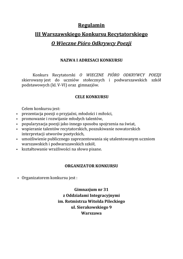 Regulamin III Warszawskiego Konkursu Recytatorskiego O Wieczne Pióro Odkrywcy Poezji NAZWA I ADRESACI KONKURSU Konkurs Recytatorski O WIECZNE PIÓRO ODKRYWCY POEZJI skierowany jest do uczniów stołecznych i podwarszawskich szkół podstawowych (kl. V-VI) oraz gimnazjów. CELE KONKURSU Celem konkursu jest: prezentacja poezji o przyjaźni, młodości i miłości, promowanie i rozwijanie młodych talentów, popularyzacja poezji jako innego sposobu spojrzenia na świat, wspieranie talentów recytatorskich, poszukiwanie nowatorskich interpretacji utworów poetyckich, umożliwienie publicznego zaprezentowania się utalentowanym uczniom warszawskich i podwarszawskich szkół, kształtowanie wrażliwości na słowo pisane. ORGANIZATOR KONKURSU Organizatorem konkursu jest : Gimnazjum nr 31 z Oddziałami Integracyjnymi im. Rotmistrza Witolda Pileckiego ul. Sierakowskiego 9 Warszawa ZASADY UCZESTNICTWA Udział w konkursie jest bezpłatny. Warunkiem uczestnictwa jest zgłoszenie udziału w konkursie w wyznaczonym terminie oraz przygotowanie właściwego repertuaru. Zgłoszoną szkołę może reprezentować maksymalnie pięciu uczestników. W przypadku zespołu szkół również maksymalnie pięciu uczniów z zespołu szkół Uczestnicy zobowiązani są do przesłania kart zgłoszeń do organizatora w nieprzekraczalnym terminie do 20 listopada 2015 r. do godz. 16.00 faksem pod numer szkoły: 22 619 21 86 ZASADY PREZENTACJI UTWORÓW Uczestnicy konkursu występują w dwóch kategoriach wiekowych: - kl. V i VI szkoły podstawowej, - gimnazjum. Wystąpienie nie może być dłuższe niż 5 minut. Można zaprezentować jeden lub dwa utwory. Akceptowane są jedynie wiersze prezentowane w całości. Wykonawcy mogą zaprezentować utwory wyłącznie w języku polskim. Dopuszczalne są jednak wiersze przetłumaczone z języków obcych na język polski. Osoby zakwalifikowane do finału prezentują jeden utwór - wiersz prezentowany podczas eliminacji lub można też przygotować nowy materiał. Prezentacja utworów odbędzie się przed jury oraz innymi uczestnikami konkursu. ZASADY OCENY RECYTACJI Organizator zastrzega sobie prawo ustalenia kolejności występu poszczególnych osób biorących udział w konkursie. W pracach komisji konkursowej wezmą udział specjaliści współpracujący z organizatorami. Jury oceniać będzie: - dobór repertuaru (wartości artystyczne utworów, ich dostosowanie do możliwości wykonawczych uczestnika oraz jego wieku), - interpretacja utworu, - kulturę słowa (dykcja oraz emisja głosu), - ogólny wyraz artystyczny, - nawiązanie kontaktu z publicznością. Jury przyzna nagrody i wyróżnienia w każdej kategorii wiekowej oraz wytypuje laureatów. Karty oceny recytatora są tajne i dostępne tylko dla członków jury. Jury przygotuje protokół pokonkursowy, który zostanie umieszczony na stronie szkoły www.gimnazjum31waw.ehost.pl w zakładce Konkurs Recytatorski. PRZEBIEG KONKURSU Konkurs przeprowadzony będzie metodą dwustopniową: I etap - przesłuchania wstępne (27 listopada 2015 r. od godz. 10.00) II etap - wyłonienie laureatów (11 grudnia 2015 r.) Zakończeniem konkursu będzie Gala Finałowa, która odbędzie się w styczniu 2016r. Do drugiego etapu konkursu zostanie zakwalifikowanych po 15 osób z obu kategorii wiekowych. Organizator zastrzega sobie możliwość zmiany ilości finalistów w zależności od ilości zgłoszeń do konkursu. Harmonogram przesłuchań I etapu konkursu zostanie zamieszczony na stronie internetowej Gimnazjum nr 31 w Warszawie do dnia 24.11.2015 r. Komunikat jury z listą osób, które zakwalifikowały się do drugiego etapu konkursu zostanie opublikowany na stronie internetowej placówki 1. 12. 2015 do godz. 15.00. NAGRODY DLA LAUREATÓW Główną nagrodą Konkursu jest pióro firmy Parker. Przewidziane są dwie nagrody główne – po jednej w obu kategoriach wiekowych. Pozostali laureaci otrzymają inne nagrody rzeczowe. Wszystkim laureatom zostaną wręczone pamiątkowe dyplomy. INFORMACJE DODATKOWE Ostateczna interpretacja regulaminu należy do jury. Nauczyciele przygotowujący młodzież do udziału w Konkursie otrzymają zaświadczenia. Wszelkie pytania mogą Państwo kierować pod nr tel. 511 160 926 lub mail [email protected] Opiekunowie projektu: p. Małgorzata Laszecka, p. Alina Rozmus, p. Tomasz Kurczewski.