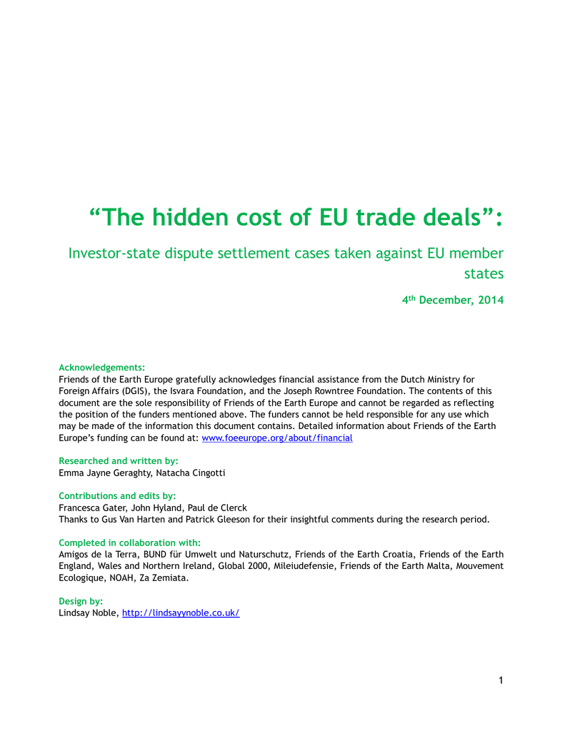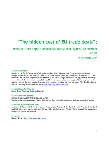 ! ! ! ! ! “The hidden cost of EU trade deals”: Investor-state dispute settlement cases taken against EU member states 4th December, 2014 !! ! ! Acknowledgements: Friends of the Earth Europe gratefully acknowledges financial assistance from the Dutch Ministry for Foreign Affairs (DGIS), the Isvara Foundation, and the Joseph Rowntree Foundation. The contents of this document are the sole responsibility of Friends of the Earth Europe and cannot be regarded as reflecting the position of the funders mentioned above. The funders cannot be held responsible for any use which may be made of the information this document contains. Detailed information about Friends of the Earth Europe’s funding can be found at: www.foeeurope.org/about/financial ! Researched and written by: Emma Jayne Geraghty, Natacha Cingotti ! Contributions and edits by: Francesca Gater, John Hyland, Paul de Clerck Thanks to Gus Van Harten and Patrick Gleeson for their insightful comments during the research period. ! Completed in collaboration with: Amigos de la Terra, BUND für Umwelt und Naturschutz, Friends of the Earth Croatia, Friends of the Earth England, Wales and Northern Ireland, Global 2000, Mileiudefensie, Friends of the Earth Malta, Mouvement Ecologique, NOAH, Za Zemiata. ! Design by: Lindsay Noble, http://lindsayynoble.co.uk/ ! !1 ! Contents Acknowledgements Executive Summary Introduction Methodology Key Findings General trends in ISDS claims against member states at the EU level Striking features in ISDS claims initiated against EU member states Environment under attack • Germany case study: a ’’settled case“ resulting in lower environmental standards Pressure on Eastern Europe • Czech Republic case study: The unbearable costs of the unpredictable arbitration system • Poland case study: Taxpayers can only see the bill they have to foot • Poland case study: The high costs of settlements arising from investor-state disputes • Romania case study: European Commission tries in vain to intervene in investment treaty arbitration Slovak Republic case study: The high price of affordable health insurance for everybody ! Conclusion ! ! ! !2 ! Executive Summary ! Investor-state dispute settlement (ISDS) is nothing new, but the recent and ongoing trade negotiations between the EU and US (TTIP) and the EU and Canada (CETA), have given rise to mounting public criticism of the mechanism. Investor-state arbitration provides foreign investors with a privileged mechanism (that domestic investors or other parts of society cannot use). Foreign investors can circumvent domestic court systems and claim financial compensation from host governments in secret business friendly international tribunals, if they deem their investment potentials (including their profits) are affected by the introduction of regulatory and/or policy changes in the host state. These private tribunals are comprised of three for-profit arbitrators who issue their decisions behind closed doors and often have a conflict of interest as they have a commercial interest in keeping the system alive and they often work for the same companies that file cases. Claims for compensation can – and do – amount to billions of euro. However, ISDS cases themselves, as well as the awards, and other outcome documents for these cases are not fully disclosed to the public even when cases may relate to public interests, such as the environment. ! Friends of the Earth Europe compiled available data on ISDS cases taken against EU member states since 1994, and for which documentation is available in the public domain. Considering the enormous lack of transparency around investor-state arbitration, this research exercise can only provide an insight into the overall scale of the phenomenon. However, it highlights the irrefutable attack on recent EU accession countries and the environment, as well as the cost this system has already had on EU taxpayers and European democracy. ! ! Key Findings • • • • • • • • • 127 known ISDS cases have been brought against 20 EU member states since 1994. Details of the compensation sought by foreign investors was publicly available for only 62 out of the 127 cases (48%). The compensation sought for in these 62 cases amounts to almost €30 billion. The total amount awarded to foreign investors – inclusive of known interest, arbitration fees, and other expenses and fees, as well as the only known settlement payment made by an EU member state – was publicly available for 14 out of the 127 cases (11%) and amounts to €3.5 billion. The largest known amount to be awarded by a tribunal against an EU member state was €553 million in the Ceskoslovenska Obchodni Banka vs. Slovak Republic case (1997). 76% of known cases (97 out of the 127) were taken against new member states that acceded to the EU between 2004 and 2007. 26 ISDS claims have targeted the Czech Republic (20% of the total), making it the EU member state with the most cases filed against it. Almost 60% of cases (75 out of the 127) concern environmentally relevant sectors. The total number of known closed cases for which outcomes are publicly available (63 out of the 127 cases) show full or partial success for investors in 44% (28 out of 63 cases) of cases – with 15 cases in favour of the investors and 13 cases resulting in settlements. While settlements tend to have a positive connotation, because both parties come to an agreement that puts an end to the dispute, without one ‘winning’ over the other, these can still be very costly to the taxpayer. For instance, the largest known amount to have been paid out by an EU member state relates to a settlement (Eureko vs Poland, August 2005). As a result of the settlement agreement reached with Eureko over an insurance enterprise, over €2 billion was paid by Poland. ! Introduction !3 The ‘Investor-state dispute settlement’ mechanism – (ISDS) has been coming under growing public scrutiny due to its inc