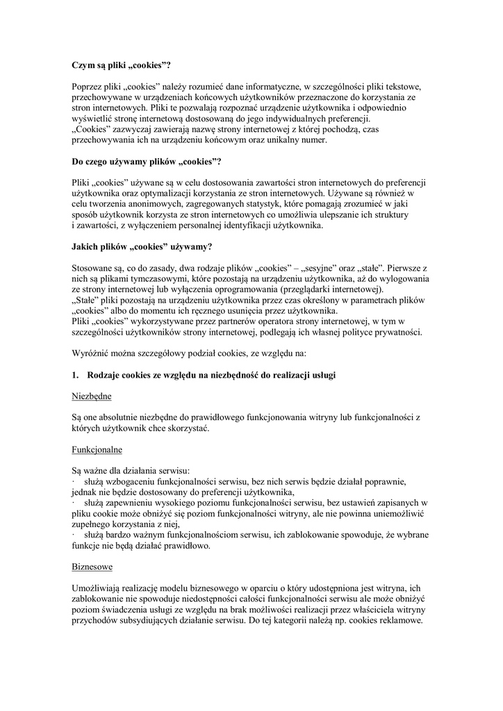 Czym są pliki „cookies”? Poprzez pliki „cookies” należy rozumieć dane informatyczne, w szczególności pliki tekstowe, przechowywane w urządzeniach końcowych użytkowników przeznaczone do korzystania ze stron internetowych. Pliki te pozwalają rozpoznać urządzenie użytkownika i odpowiednio wyświetlić stronę internetową dostosowaną do jego indywidualnych preferencji. „Cookies” zazwyczaj zawierają nazwę strony internetowej z której pochodzą, czas przechowywania ich na urządzeniu końcowym oraz unikalny numer. Do czego używamy plików „cookies”? Pliki „cookies” używane są w celu dostosowania zawartości stron internetowych do preferencji użytkownika oraz optymalizacji korzystania ze stron internetowych. Używane są również w celu tworzenia anonimowych, zagregowanych statystyk, które pomagają zrozumieć w jaki sposób użytkownik korzysta ze stron internetowych co umożliwia ulepszanie ich struktury i zawartości, z wyłączeniem personalnej identyfikacji użytkownika. Jakich plików „cookies” używamy? Stosowane są, co do zasady, dwa rodzaje plików „cookies” – „sesyjne” oraz „stałe”. Pierwsze z nich są plikami tymczasowymi, które pozostają na urządzeniu użytkownika, aż do wylogowania ze strony internetowej lub wyłączenia oprogramowania (przeglądarki internetowej). „Stałe” pliki pozostają na urządzeniu użytkownika przez czas określony w parametrach plików „cookies” albo do momentu ich ręcznego usunięcia przez użytkownika. Pliki „cookies” wykorzystywane przez partnerów operatora strony internetowej, w tym w szczególności użytkowników strony internetowej, podlegają ich własnej polityce prywatności. Wyróżnić można szczegółowy podział cookies, ze względu na: 1. Rodzaje cookies ze względu na niezbędność do realizacji usługi Niezbędne Są one absolutnie niezbędne do prawidłowego funkcjonowania witryny lub funkcjonalności z których użytkownik chce skorzystać. Funkcjonalne Są ważne dla działania serwisu: · służą wzbogaceniu funkcjonalności serwisu, bez nich serwis będzie działał poprawnie, jednak nie będzie dostosowany do preferencji użytkownika, · służą zapewnieniu wysokiego poziomu funkcjonalności serwisu, bez ustawień zapisanych w pliku cookie może obniżyć się poziom funkcjonalności witryny, ale nie powinna uniemożliwić zupełnego korzystania z niej, · służą bardzo ważnym funkcjonalnościom serwisu, ich zablokowanie spowoduje, że wybrane funkcje nie będą działać prawidłowo. Biznesowe Umożliwiają realizację modelu biznesowego w oparciu o który udostępniona jest witryna, ich zablokowanie nie spowoduje niedostępności całości funkcjonalności serwisu ale może obniżyć poziom świadczenia usługi ze względu na brak możliwości realizacji przez właściciela witryny przychodów subsydiujących działanie serwisu. Do tej kategorii należą np. cookies reklamowe. 2. Ze względu na czas przez jaki cookie będzie umieszczone w urządzeniu końcowym użytkownika: Cookies tymczasowe (session cookies) Cookie umieszczone na czas korzystania z przeglądarki (sesji), zostaje wykasowane po jej zamknięciu. Cookies stałe (persistent cookie) Nie jest kasowane po zamknięciu przeglądarki i pozostaje w urządzeniu użytkownika na określony czas lub bez okresu ważności w zależności od ustawień właściciela witryny. 3. Ze względu na pochodzenie – administratora serwisu, który zarządza cookies: Cookie własne (first party cookie) Cookie umieszczone bezpośrednio przez właściciela witryny jaka została odwiedzona. Cookie zewnętrzne (third-party cookie) Cookie umieszczone przez zewnętrzne podmioty, których komponenty stron zostały wywołane przez właściciela witryny. Uwaga: cookie mogą być wywołane przez administratora za pomocą skryptów, komponentów, które znajdują się na serwerach partnera, umiejscowionych w innej lokalizacji - innym kraju lub nawet zupełnie innym systemie prawnym. W przypadku wywołania przez administratora witryny komponentów serwisu pochodzących spoza systemu administratora mogą obowiązywać inne standardowe zasady polityki cookies niż polityka prywatności / cookies administratora witryny. 4. Ze względu na cel jakiemu służą: Konfiguracja serwisu Umożliwiają ustawienia funkcji i usług w serwisie. Bezpieczeństwo i niezawodność serwisu Umożliwiają weryfikację autentyczności oraz optymalizację wydajności serwisu. Uwierzytelnianie Umożliwiają informowanie gdy użytkownik jest zalogowany, dzięki czemu witryna może pokazywać odpowiednie informacje i funkcje. Stan sesji Umożliwiają zapisywanie informacji o tym, jak użytkownicy korzystają z witryny. Mogą one dotyczyć najczęściej odwiedzanych stron lub ewentualnych komunikatów o błędach wyświetlanych na niektórych stronach. Pliki cookie służące do zapisywania tzw. „stanu sesji” pomagają ulepszać usługi i zwiększać komfort przeglądania stron. Procesy Umożliwiają sprawne działanie samej witryny oraz dostępnych na niej funkcji. Reklamy Umożliwiają wyświetlać reklamy, które są bardziej interesujące dla użytkowników, a jednocześnie bardziej wartościowe dla wydawców i reklamodawców, personalizować reklamy, mogą być używane również do wyświetlania reklam poza stronami witryny (domeny). Lokalizacja Umożliwiają dostosowanie wyświetlanych informacji do lokalizacji użytkownika. Analizy i badania, audyt oglądalności Umożliwiają właścicielom witryn lepiej zrozumieć preferencje ich użytkowników i poprzez analizę ulepszać i rozwijać produkty i usługi. Zazwyczaj właściciel witryny lub firma badawcza zbiera anonimowo informacje i przetwarza dane na temat trendów bez identyfikowania danych osobowych poszczególnych użytkowników. 5. Rodzaje cookies ze względu na ingerencję w prywatność użytkownika Nieszkodliwe Obejmuje cookies: · niezbędne do poprawnego działania witry
