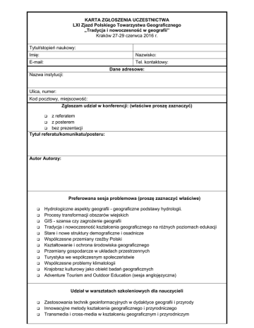 KARTA ZGŁOSZENIA UCZESTNICTWA LXI Zjazd Polskiego Towarzystwa Geograficznego „Tradycja i nowoczesność w geografii” Kraków 27-29 czerwca 2016 r. Tytuł/stopień naukowy: Imię: Nazwisko: E-mail: Tel. kontaktowy: Dane adresowe: Nazwa instytucji: Ulica, numer: Kod pocztowy, miejscowość: Zgłaszam udział w konferencji: (właściwe proszę zaznaczyć) z referatem z posterem bez prezentacji Tytuł referatu/komunikatu/posteru: Autor Autorzy: Preferowana sesja problemowa (proszę zaznaczyć właściwe) Hydrologiczne aspekty geografii - geograficzne podstawy hydrologii. Procesy transformacji obszarów wiejskich GIS - szansa czy zagrożenie geografii Tradycja i nowoczesność kształcenia geograficznego na różnych poziomach edukacji Stare i nowe struktury demograficzne i osadnicze Współczesne przemiany rzeźby Polski Kształtowanie i ochrona środowiska geograficznego Przemiany gospodarcze w układach przestrzennych Turystyka we współczesnym społeczeństwie Współczesne problemy klimatologii Krajobraz kulturowy jako obiekt badań geograficznych Adventure Tourism and Outdoor Education (sesja anglojęzyczna) Udział w warsztatach szkoleniowych dla nauczycieli Zastosowania technik geoinformacyjnych w dydaktyce geografii i przyrody Innowacyjne metody kształcenia geograficznego i przyrodniczego Transmedia i cross-media w kształceniu geograficznym i przyrodniczym Opłata konferencyjna (właściwe proszę zaznaczyć) Opłata podstawowa: 250 PLN; obejmuje udział w obradach, materiały konferencyjne, przerwy kawowe Dodatkowo: Lunch w dn. 28.06 i 29.06.2016 TAK 70 zł NIE Spotkanie towarzyskie 28.06.2016 TAK 130 zł NIE Udział w sesjach terenowych: opłata 29.06 Rejon Rynku Krakowskiego w świetle najnowszych badań archeologicznych 30 zł 29.06 Środowisko, obiekty turystyczne i antropogeniczne okolic Tyńca 50 zł 30.06 Atrakcje Ziemi Bocheńskiej 100 zł 30.06 Dziedzictwo przyrodnicze i kulturowe Wyżyny Krakowsko-Częstochowskiej 185 zł 30.06 Aktywnie w Pieninach 200 zł 30.06 - 1.07 Rzeźba Zachodnich Beskidów 240 zł 30.06 - 1.07 Tatry – człowiek w górskim środowisku przyrodniczym 320 zł TAK Łączna wniesiona opłata konferencyjna wraz z opłatą za sesje terenowe: Płatności należy dokonać przelewem do dnia 10 maja 2016 roku na konto: Uniwersytet Pedagogiczny im. Komisji Edukacji Narodowej Bank Pekao SA oddział w Krakowie przelew krajowy 71 1240 4722 1111 0000 4852 4687 przelew zagraniczny PL 71 1240 4722 1111 0000 4852 4687, Kod SWIFT: PKOPPLPW z dopiskiem: DK – 114, imię i nazwisko uczestnika (np. DK-114 Jan Kowalski) Po 1 maja opłata podstawowa wzrasta o 50 zł. W razie rezygnacji wpłata nie podlega zwrotowi. Żądanie faktury Zgodnie z obowiązującymi przepisami, organizator konferencji zobowiązany jest do wystawienia faktury nie później niż 15 dnia miesiąca następującego po miesiącu, w którym podmiot dokonał wpłaty na konto UP. Faktury dla osób fizycznych nieprowadzących działalności gospodarczej oraz dotyczące sprzedaży zwolnionej od podatku VAT wystawia się tylko i wyłącznie na żądanie. Fakturę wystawia się na żądanie zgłoszone w ciągu 3 miesięcy licząc od końca miesiąca, w którym dokonano wpłaty. Jeżeli wpłaca osoba fizyczna, a faktura ma być wystawiona na instytucję (pracodawcę osoby fizycznej) do żądania faktury należy dołączyć skierowanie z instytucji (pracodawcy) podpisane przez upoważnioną osobę do reprezentowania w/w instytucji. Żądanie można kierować na adres: [email protected] Dane do wystawienia faktury: NIP................................................. Nazwa instytucji lub imię i nazwisko (w przypadku wpłaty indywidualnej) ……………………………………………………………………………………………………………...…………… …………………………………………………………………………………………………………………………… Adres płatnika ……………………………………………………………………………………………………………...…………… …………………………………………………………………………………………………………………………… Adres, na który ma być przesłana faktura …………………………………………………………………………………………………………...……………… …………………………………………………………………………………………………………………………… Wyrażam zgodę na przetwarzanie moich danych osobowych dla potrzeb niezbędnych do organizacji Zjazdu PTG (zgodnie z Ustawą z dnia 29.08.1997 roku o Ochronie Danych Osobowych; tekst jednolity: Dz. U. z 2002r. Nr 101, poz. 926 ze zm.) Miejscowość, data: Podpis: Zgłoszenie abstraktu prezentacji (proszę wpisać wg wzoru – treść abstraktu do 250 słów) TYTUŁ REFEREATU/POSTERU Imię i nazwisko1, Imię i nazwisko2, …. 1 Afiliacja (nazwa instytucji, adres) Afiliacja (nazwa instytucji, adres) 2 adres e-mail autora korespondencyjnego Treść abstraktu Treść abstraktu Treść abstraktu Treść abstraktu Treść abstraktu Treść abstraktu abstraktu Treść abstraktu Treść abstraktu Treść abstraktu Treść abstraktu Treść abstraktu Treść abstraktu Treść abstraktu Treść abstraktu Treść abstraktu Treść abstraktu Treść abstraktu Treść abstraktu Treść abstraktu Treść abstraktu Treść abstraktu Treść abstraktu Treść abstraktu Treść abstraktu Treść abstraktu Treść abstraktu Treść abstraktu Treść abstraktu Treść abstraktu Treść abstraktu Treść abstraktu Treść abstraktu Treść abstraktu Treść abstraktu Treść abstraktu Treść abstraktu Treść abstraktu Treść abstraktu Treść abstraktu Treść abstraktu Treść abstraktu Treść abstraktu Treść abstraktu Treść abstraktu Treść abstraktu Treść abstraktu Treść abst