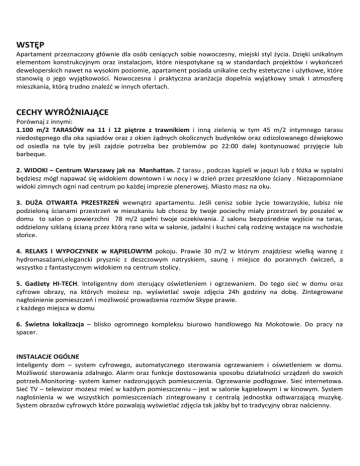 WSTĘP Apartament przeznaczony głównie dla osób ceniących sobie nowoczesny, miejski styl życia. Dzięki unikalnym elementom konstrukcyjnym oraz instalacjom, które niespotykane są w standardach projektów i wykończeń deweloperskich nawet na wysokim poziomie, apartament posiada unikalne cechy estetyczne i użytkowe, które stanowią o jego wyjątkowości. Nowoczesna i praktyczna aranżacja dopełnia wyjątkowy smak i atmosferę mieszkania, którą trudno znaleźć w innych ofertach. CECHY WYRÓŻNIAJĄCE Porównaj z innymi: 1.100 m/2 TARASÓW na 11 i 12 piętrze z trawnikiem i inną zielenią w tym 45 m/2 intymnego tarasu niedostępnego dla oka sąsiadów oraz z okien żądnych okolicznych budynków oraz odizolowanego dźwiękowo od osiedla na tyle by jeśli zajdzie potrzeba bez problemów po 22:00 dalej kontynuować przyjęcie lub barbeque. 2. WIDOKI – Centrum Warszawy jak na Manhattan. Z tarasu , podczas kąpieli w jaquzi lub z łóżka w sypialni będziesz mógł napawać się widokiem downtown i w nocy i w dzień przez przeszklone ściany . Niezapomniane widoki zimnych ogni nad centrum po każdej imprezie plenerowej. Miasto masz na oku. 3. DUŻA OTWARTA PRZESTRZEŃ wewnątrz apartamentu. Jeśli cenisz sobie życie towarzyskie, lubisz nie podzieloną ścianami przestrzeń w mieszkaniu lub chcesz by twoje pociechy miały przestrzeń by poszaleć w domu to salon o powierzchni 78 m/2 spełni twoje oczekiwania. Z salonu bezpośrednie wyjście na taras, oddzielony szklaną ścianą przez którą rano wita w salonie, jadalni i kuchni całą rodzinę wstające na wschodzie słońce. 4. RELAKS I WYPOCZYNEK w KĄPIELOWYM pokoju. Prawie 30 m/2 w którym znajdziesz wielką wannę z hydromasażami,elegancki prysznic z deszczowym natryskiem, saunę i miejsce do porannych ćwiczeń, a wszystko z fantastycznym widokiem na centrum stolicy. 5. Gadżety HI-TECH. Inteligentny dom sterujący oświetleniem i ogrzewaniem. Do tego sieć w domu oraz cyfrowe obrazy, na których możesz np. wyświetlać swoje zdjęcia 24h godziny na dobę. Zintegrowane nagłośnienie pomieszczeń i możliwość prowadzenia rozmów Skype prawie. z każdego miejsca w domu 6. Świetna lokalizacja – blisko ogromnego kompleksu biurowo handlowego Na Mokotowie. Do pracy na spacer. INSTALACJE OGÓLNE Inteligenty dom – system cyfrowego, automatycznego sterowania ogrzewaniem i oświetleniem w domu. Możliwość sterowania zdalnego. Alarm oraz funkcje dostosowania sposobu działalności urządzeń do swoich potrzeb.Monitoring- system kamer nadzorujących pomieszczenia. Ogrzewanie podłogowe. Sieć internetowa. Sieć TV – telewizor możesz mieć w każdym pomieszczeniu – jest w salonie kąpielowym i w kinowym. System nagłośnienia w we wszystkich pomieszczeniach zintegrowany z centralą jednostka odtwarzającą muzykę. System obrazów cyfrowych które pozwalają wyświetlać zdjęcia tak jakby był to tradycyjny obraz naścienny. ROZKŁAD POMIESZCZEŃ Pomieszczenia szczegółowo opisane poniżej. Rozkład metrażowy Salon 78 m/2( Kinowy, Kuchnia otwarta, Jadalnia) Pokój kąpielowy – 27 m/2 Sypialnia + biuro 23 m/2 Sypialnia druga – 14 m/2 WC 4 m/2 Garderoba 7 m/2 WYPOSAŻENIE POMIESZCZEŃ GARDEROBA Wejście do pomieszczenia nieco przysłonięte ,nie rzucające się w oczy. Wewnątrz duże obszerne szafy , które zaspokoją oczekiwania całej rodziny. Wysuwane szuflady , kosze , wieszaki oraz stopki na buty. HOL Zaczyna się już od windy , gdyż na piętrze jest wejście tylko do apartamentu , nie ma żadnych sąsiadów . Przed drzwiami wejściowymi dostępna jest powierzchnia ponad 10 m/2 , idealna do przetrzymywania np. rowerów, nart czy wózków. W apartamencie hol ma 4 m/2 , znajduje się w nim szeroka na 120 cm szafa z przesuwanymi przeszklonymi drzwiami, hooker na którym można usiąść zakładając buty oraz szafa wystawowa z wyeksponowanymi pamiątkami z podróży. Cyfrowy obraz na ścianie , na którym w zamiast tradycyjnych obrazów możesz wyświetlać wybrane przez ciebie w formie stałych widoków lub slideshow. JADALNIA Pomieszczenie jest częścią otwartego salonu. Nowoczesne , eleganckie dwa szklane stoły można dowolnie zaaranżować. W tej chwili stoją dwa razem tworząc płaszczyznę 4 m/2 . Można je ustawić również wzdłuż i posadzić przy nich ponad 16 osób – duże przyjęcie rodzinne. W rogu jadalni jest miejsce na ognisko rodzinne – koza przystosowana do palenia drewnem w chwili obecnej nie podłączona , oddziałuje jedynie wizualnie na estetykę pomieszczenia. W jadalni gniazdka internetowe. KĄPIELOWY Miejsce relaksu. 27 m/2 na których rozmieszczona została dwu osobowa Sauna fińska parowa, duża okrągła wanna z zespołem hydromasaży , podświetleniem i „wodospadami” górnymi oraz roślinnością , telewizor LCD HD + Internet ,dodatkowe nagłośnienie pomieszczeń – system zintegrowany i indywidualny. Prysznic ze specjalistycznym natryskiem „deszczownikiem” , który sprawia , że woda spada w postaci kropli deszczu dzięki czemu dostarcza wiele przyjemności stwarzając wrażenie kontaktu z naturą. Szeroka umywalka dla dwóch osób możliwość przełączania za pomocą pilota ., lustra i ukryta pralka wraz z szafkami na chemię i inne artykuły higieniczne oraz obszerne i pojemne kosze na brudne rzeczy . W pokoju rozbudowany system oświetlania ( 5 systemów ) pozwalający tworzyć nastrojowe i dobrane sceny świetlne w zależności od potrzeb użytkowników. Ogrzewanie podłogowe oraz grzejnik. Oświetlenie i ogrzewanie sterowane automatycznie w ramach inteligentnego domu , KINOWY Pomieszczenie jest częścią otwartego salonu. Ma zbudowany duży ekran ze specjalistycznego materiału stosowanego przy ekranach kinowych realistycznie oddający kolory podczas projekcji. Wyposażone w projektor HD oraz system wysokiej jakości nagłośnienia 5.1 THX . Telewizor 62” LCD Sharp Full HD. Cyfrowy dekoder do telewizji HD.3 gniazdka internetowe. Centrala sterowania