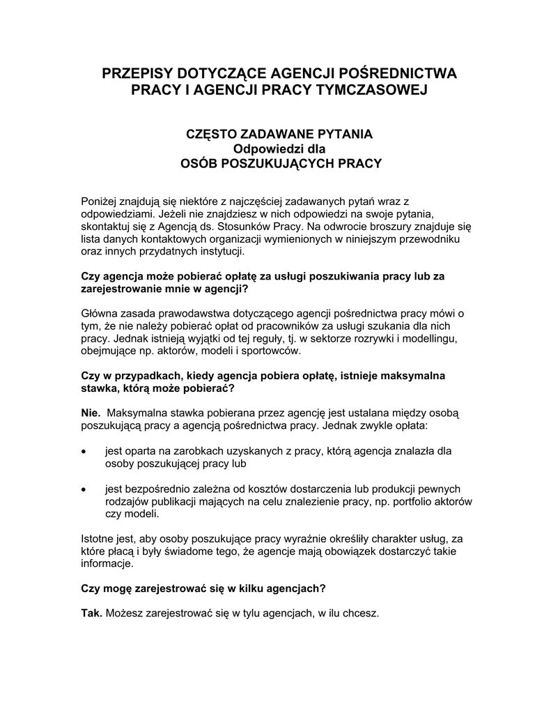 PRZEPISY DOTYCZĄCE AGENCJI POŚREDNICTWA PRACY I AGENCJI PRACY TYMCZASOWEJ CZĘSTO ZADAWANE PYTANIA Odpowiedzi dla OSÓB POSZUKUJĄCYCH PRACY Poniżej znajdują się niektóre z najczęściej zadawanych pytań wraz z odpowiedziami. Jeżeli nie znajdziesz w nich odpowiedzi na swoje pytania, skontaktuj się z Agencją ds. Stosunków Pracy. Na odwrocie broszury znajduje się lista danych kontaktowych organizacji wymienionych w niniejszym przewodniku oraz innych przydatnych instytucji. Czy agencja może pobierać opłatę za usługi poszukiwania pracy lub za zarejestrowanie mnie w agencji? Główna zasada prawodawstwa dotyczącego agencji pośrednictwa pracy mówi o tym, że nie należy pobierać opłat od pracowników za usługi szukania dla nich pracy. Jednak istnieją wyjątki od tej reguły, tj. w sektorze rozrywki i modellingu, obejmujące np. aktorów, modeli i sportowców. Czy w przypadkach, kiedy agencja pobiera opłatę, istnieje maksymalna stawka, którą może pobierać? Nie. Maksymalna stawka pobierana przez agencję jest ustalana między osobą poszukującą pracy a agencją pośrednictwa pracy. Jednak zwykle opłata: • jest oparta na zarobkach uzyskanych z pracy, którą agencja znalazła dla osoby poszukującej pracy lub • jest bezpośrednio zależna od kosztów dostarczenia lub produkcji pewnych rodzajów publikacji mających na celu znalezienie pracy, np. portfolio aktorów czy modeli. Istotne jest, aby osoby poszukujące pracy wyraźnie określiły charakter usług, za które płacą i były świadome tego, że agencje mają obowiązek dostarczyć takie informacje. Czy mogę zarejestrować się w kilku agencjach? Tak. Możesz zarejestrować się w tylu agencjach, w ilu chcesz. Szczegółowe wytyczne mówią o agencjach pośrednictwa pracy (EA – Employment Agency) oraz agencjach pracy tymczasowej (EB – Employment Business) – jaka jest między nimi różnica? Agencja pośrednictwa pracy przedstawia Cię pracodawcom, którzy oferują Ci stałą pracę (bądź kontrakt krótkoterminowy lub na czas określony). W takich przypadkach umowa o pracę zawierana jest z pracodawcą, a nie z agencją. Agencja pracy tymczasowej znajdzie Ci pracę u swoich klientów, lecz Twój stosunek umowny zawarty będzie z agencją pracy tymczasowej, która jest odpowiedzialna za wypłacanie Ci wynagrodzenia. Wiem, jaka jest różnica między agencją pośrednictwa pracy a agencją pracy tymczasowej. Jednak czy w praktyce stanowi to dla mnie jakąś różnicę? Tak. Jeżeli podpisałeś umowę z agencją pracy tymczasowej, to musi ona Ci płacić, nawet, jeżeli klient jeszcze jej nie zapłacił. Jeżeli podpisałeś umowę z agencją pośrednictwa pracy, będziesz otrzymywał wynagrodzenie w postaci pensji wypłacanej przez pracodawcę. Skąd mogę wiedzieć, czy agencja jest agencją pośrednictwa pracy czy agencją pracy tymczasowej? Większość agencji prowadzi oba rodzaje działalności. Upewnij się, że wiesz, jakich usług od nich oczekujesz, tj. znalezienia Ci pracy stałej lub tymczasowej, oraz że rozumiesz podpisywaną umowę, tj. zasady i warunki zatrudnienia. Jakie są moje obecne prawa jako pracownika agencji? Pracownicy agencji chronieni są przez prawodawstwo, między innymi prawo stanowiące o równouprawnieniu bez względu na rasę czy płeć, prawo o sprawiedliwości w zatrudnianiu, prawo chroniące przed dyskryminacją osób niepełnosprawnych oraz prawo dotyczące bezpieczeństwa i higieny pracy. Posiadają oni także uprawnienia określające wymiar czasu pracy, prawo do chronionego ujawniania informacji, prawo do tego, aby pracownicy zatrudnieni na niepełny etat nie byli traktowani gorzej niż ci, którzy pracują w pełnym wymiarze godzin, prawo do otrzymywania minimalnej krajowej stawki wynagrodzenia, prawo chroniące przed bezprawnymi potrąceniami z wynagrodzenia, prawo do osoby towarzyszącej podczas spotkań dyscyplinarnych i spotkań w sprawie zażaleń, prawo do członkostwa lub nieprzynależności do związku zawodowego, prawo do niepłacenia składek członkowskich w związkach zawodowych bez uprzedniego wyrażenia na to zgody oraz prawo do ochrony przed szkodą w przypadku korzystania z praw ustawowych. Pracownikom agencji mogą również przysługiwać prawa obejmujące pracujących rodziców, chociaż zależy to od rodzaju opłacanych składek ubezpieczenia społecznego. Co powinienem zrobić, jeżeli nie jestem pewien, jakie są zasady i warunki świadczenia usług przez agencję pośrednictwa pracy lub agencję pracy tymczasowej? Agencja pośrednictwa pracy lub agencja pracy tymczasowej musi ustalić z Tobą zasady i warunki zanim zacznie świadczyć na rzecz Ciebie usługi poszukiwania pracy. Zasady i warunki muszą określać, czy firma świadcząca usługi poszukiwania pracy funkcjonuje wobec pracownika jako agencja pośrednictwa pracy czy agencja pracy tymczasowej, a także określać rodzaj pracy, którą agencja stara się tej osobie znaleźć. Zasady i warunki agencji pracy tymczasowej powinny także zawierać m.in. zobowiązanie, że agencja będzie płacić pracownikowi za wykonaną przez niego pracę, jak również informacje na temat okresu wypowiedzenia, wysokości wynagrodzenia, częstotliwości wypłaty wynagrodzenia oraz należnego urlopu. Zasady i warunki należy podpisać tylko, jeżeli w pełni rozumie się, do czego one zobowiązują. W razie jakichkolwiek wątpliwości należy odłożyć podpisanie jakichkolwiek dokumentów do czasu uzyskania porady z innego źródła, np. Biura Porad Obywatelskich (Citizens Advice Bureau). Czy agencja pośrednictwa pracy lub agencja pracy tymczasowej może poprosić mnie o potwierdzenie mojej tożsamości lub uzyskanych przeze mnie kwalifikacji? Prawo wymaga od WSZYSTKICH osób poszukujących pracy przedstawienia dowodu potwierdzającego tożsamość. Można to uczynić okazując się paszportem, prawem jazdy lub dowodem osobistym (z kraju, w którym dowody takie są wydawane). Należy również