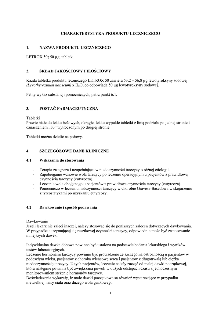 CHARAKTERYSTYKA PRODUKTU LECZNICZEGO 1. NAZWA PRODUKTU LECZNICZEGO LETROX 50; 50 µg, tabletki 2. SKŁAD JAKOŚCIOWY I ILOŚCIOWY Każda tabletka produktu leczniczego LETROX 50 zawiera 53,2 – 56,8 µg lewotyroksyny sodowej (Levothyroxinum natricum) x H2O, co odpowiada 50 µg lewotyroksyny sodowej. Pełny wykaz substancji pomocniczych, patrz punkt 6.1. 3. POSTAĆ FARMACEUTYCZNA Tabletki Prawie białe do lekko beżowych, okrągłe, lekko wypukłe tabletki z linią podziału po jednej stronie i oznaczeniem „50” wytłoczonym po drugiej stronie. Tabletki można dzielić na połowy. 4. SZCZEGÓŁOWE DANE KLINICZNE 4.1 Wskazania do stosowania - 4.2 Terapia zastępcza i uzupełniająca w niedoczynności tarczycy o różnej etiologii. Zapobieganie wznowie wola tarczycy po leczeniu operacyjnym u pacjentów z prawidłową czynnością tarczycy (eutyreoza). Leczenie wola obojętnego u pacjentów z prawidłową czynnością tarczycy (eutyreoza). Pomocniczo w leczeniu nadczynności tarczycy w chorobie Gravesa-Basedowa w skojarzeniu z tyreostatykami po uzyskaniu eutyreozy. Dawkowanie i sposób podawania Dawkowanie Jeżeli lekarz nie zaleci inaczej, należy stosować się do poniższych zaleceń dotyczących dawkowania. W przypadku utrzymującej się resztkowej czynności tarczycy, odpowiednie może być zastosowanie mniejszych dawek. Indywidualna dawka dobowa powinna być ustalona na podstawie badania lekarskiego i wyników testów laboratoryjnych. Leczenie hormonami tarczycy powinno być prowadzone ze szczególną ostrożnością u pacjentów w podeszłym wieku, pacjentów z chorobą wieńcową serca i pacjentów z długotrwałą lub ciężką niedoczynnością tarczycy. U tych pacjentów, leczenie należy zacząć od małej dawki początkowej, która następnie powinna być zwiększana powoli w dużych odstępach czasu z jednoczesnym monitorowaniem stężenie hormonów tarczycy. Doświadczenia wykazały, iż małe dawki początkowe są również wystarczające w przypadku niewielkiej masy ciała oraz dużego wola guzkowego. 1 Wskazanie Niedoczynność tarczycy Dawkowanie u dorosłych (dawkę należy zwiększać o 25-50 µg w odstępach 2-4 tygodni) Profilaktyka nawrotu wola Wole obojętne Terapia wspomagająca leczenie tyreostatyczne nadczynności tarczycy Liczba µg lewotyroksyny sodowej / dobę Dawka początkowa Dawka podtrzymująca 25 do 50 100 do 200 75 – 200 75 – 200 50 do 100 Dzieciom należy podawać 12,5 – 50 µg, noworodkom 25 – 50 µg lewotyroksyny sodowej na dobę. Wielkość dawki podtrzymującej, stosowanej przez dłuższy czas, ustalana jest między innymi na podstawie wieku i wagi dziecka. Wiek Dawka µg /dobę Dawka µg /kg/dobę 0-6 miesięcy 6-24 miesiące 2-10 lat 10-16 lat > 16 lat 25-50 50-75 75-125 100-200 100-200 10-15 8-10 4-6 3-4 2-3 W przypadku wrodzonej niedoczynności tarczycy jak najszybsze rozpoczęcie leczenia jest decydujące dla osiągnięcia normalnego rozwoju psychoruchowego. Wartości standardowe stężenia T4 należy osiągnąć podczas pierwszych 3 do 4 lat życia. Podczas pierwszych 6 miesięcy życia ocena stężenia T4, jako parametru kontrolnego, jest bardziej wymierna, niż stężenia TSH. Pomimo odpowiedniego dostarczenia T4 normalizacja stężenia TSH może trwać, w pojedynczych przypadkach, do 2 lat. Całkowitą dawkę dobową należy przyjmować rano, na czczo, co najmniej, ½ godziny przed śniadaniem, popijając niewielką ilością wody. Niemowlęta powinny otrzymywać dawkę dobową, co najmniej na ½ godziny przed pierwszym karmieniem. Tabletki należy rozpuścić w niewielkiej ilości wody, a powstałą w ten sposób zawiesinę podać z odpowiednią ilością płynów. Uwaga: za każdym razem tabletki muszą być rozpuszczane bezpośrednio przed podaniem! Czas trwania leczenia: - W przypadku niedoczynności tarczycy: zazwyczaj przez całe życie; - W przypadku profilaktyki nawrotu wola: kilka miesięcy lub lat, a nawet do końca życia; - W przypadku wola obojętnego: kilka miesięcy lub lat, a nawet do końca życia; Leczenie wola obojętnego powinno trwać od 6 miesięcy do 2 lat. Jeżeli w tym przedziale czasowym leczenie produktem LETROX 50 nie przynosi pożądanego efektu terapeutycznego należy rozważyć inne sposoby leczenia; - W terapii wspomagającej leczenie nadczynności tarczycy czas trwania leczenia zależy od długości leczenia tyreostatycznego. 4.3 Przeciwwskazania - Nadwrażliwość na substancję czynną lub na którąkolwiek substancję pomocniczą. Nieleczona nadczynność tarczycy, niezależnie od etiologii. 2 - 4.4 Nieleczona niedoczynność kory nadnerczy. Nieleczona niedoczynność przysadki. Ostry zawał mięśnia sercowego. Ostre zapalenie mięśnia sercowego. Ostre zapalenie serca. Jednoczesne przyjmowanie lewotyroksyny i leku tyreostatycznego jest przeciwwskazane u kobiet w ciąży. Specjalne ostrzeżenia i środki ostrożności dotyczące stosowania Przed rozpoczęciem terapii hormonem tarczycy należy wykluczyć lub wprowadzić odpowiednią terapię następujących chorób: - Choroba wieńcowa; - dusznica bolesna; - nadciśnienie; - niedoczynność przysadki lub kory nadnerczy; - guzek autonomiczny Należy szczególnie ostrożnie ustalać lub zwiększać dawkę, aby uniknąć jatrogennej nadczynności tarczycy u pacjentów z chorobą wieńcową, niewydolnością serca lub zaburzeniami rytmu serca (tachyarytmia). W związku z tym, w tych przypadkach może być konieczna częstsza kontrola stężenia hormonów tarczycy (patrz: Stosowanie). W przypadku wtórnej niedoczynności tarczycy, należy wykluczyć jednoczesną niedoczynność kory nadnerczy. Jeśli niedoczynność kory nadnerczy zostanie potwierdzona, w pierwszej kolejności należy zastosować hydrokortyzon. U kobiet z niedoczynnością tarczycy, w okresie pomenopauzalnym, ze zwiększonym ryzykiem wystąpienia osteoporozy, należy częściej kontrolować czynność tarczycy, w celu uniknięcia zbyt dużych stężeń lewotyroksyny w surowicy krwi. 