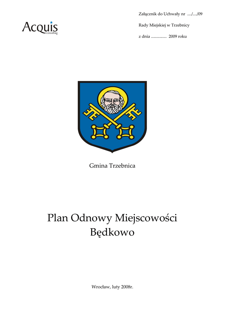Załącznik do Uchwały nr ..../..../09 Rady Miejskiej w Trzebnicy z dnia ............... 2009 roku Gmina Trzebnica Plan Odnowy Miejscowości Będkowo Wrocław, luty 2008r. 2 Będkowo. Plan Odnowy Miejscowości Spis treści 1. Wstęp ....................................................................................................................................................... 4 1. Krótka charakterystyka Gminy............................................................................................................ 6 2. 1.1. Położenie.......................................................................................................................................... 6 1.2. Rys historyczny............................................................................................................................. 10 1.3. Środowisko .................................................................................................................................... 11 1.4. Infrastruktura techniczna i komunikacyjna.............................................................................. 12 1.5. Sfera społeczna.............................................................................................................................. 17 1.6. Gospodarka i rolnictwo. .............................................................................................................. 22 Inwentaryzacja zasobów wsi Będkowo ............................................................................................ 26 2.1. Położenie........................................................................................................................................ 26 2.2. Środowisko .................................................................................................................................... 27 2.2.1. Wody ...................................................................................................................................... 27 2.2.2. Gleby....................................................................................................................................... 27 2.2.3. Lasy......................................................................................................................................... 27 2.3. Infrastruktura techniczna i komunikacyjna.............................................................................. 28 2.3.1. Transport i komunikacja...................................................................................................... 28 2.3.2. Telekomunikacja ................................................................................................................... 28 3 Będkowo. Plan Odnowy Miejscowości 2.3.3. Ciepłownictwo i gazownictwo ........................................................................................... 28 2.3.4. Zaopatrzenie w wodę i kanalizacja.................................................................................... 29 2.3.5. Energetyka ............................................................................................................................. 29 2.3.6. Gospodarka odpadami ........................................................................................................ 29 2.4. 2.4.1. Oświata .................................................................................................................................. 29 2.4.2. Zdrowie.................................................................................................................................. 30 2.4.3. Rekreacja i sport.................................................................................................................... 30 2.4.4. Kultura i dziedzictwo kulturowe ....................................................................................... 31 2.5. 3. 4. 5. Sfera społeczna.............................................................................................................................. 29 Gospodarka ................................................................................................................................... 31 2.5.1. Bezrobocie.............................................................................................................................. 32 2.5.2. Turystyka ............................................................................................................................... 32 Analiza SWOT ...................................................................................................................................... 33 3.1. Mocne i słabe strony miejscowości ............................................................................................ 33 3.2. Szanse i zagrożenia zewnętrzne ................................................................................................. 34 3.3. Zidentyfikowane problemy ........................................................................................................ 35 Wizja rozwoju wsi ............................................................................................................................... 37 4.1. Wizja i cele strategiczne ............................................................................................................... 37 4.2. Odniesienia do lokalnych dokumentów strategicznych......................................................... 38 Planowane przedsięwzięcia ............................................................................................................... 41 5.1. Plan działań ................................................................................................................................... 41 5.2. Harmonogram zadań ................................................................................................................... 42 6. Wdrażanie i monitorowanie Planu Odnowy Wsi .............................................................