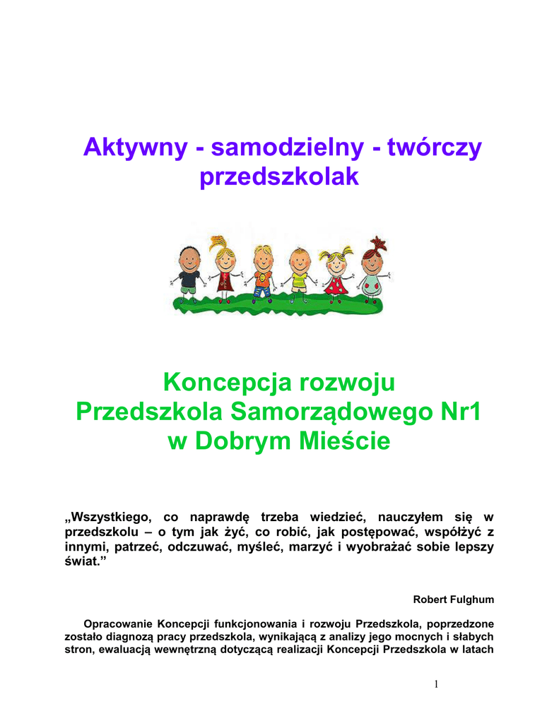 Aktywny - samodzielny - twórczy przedszkolak Koncepcja rozwoju Przedszkola Samorządowego Nr1 w Dobrym Mieście „Wszystkiego, co naprawdę trzeba wiedzieć, nauczyłem się w przedszkolu – o tym jak żyć, co robić, jak postępować, współżyć z innymi, patrzeć, odczuwać, myśleć, marzyć i wyobrażać sobie lepszy świat.” Robert Fulghum Opracowanie Koncepcji funkcjonowania i rozwoju Przedszkola, poprzedzone zostało diagnozą pracy przedszkola, wynikającą z analizy jego mocnych i słabych stron, ewaluacją wewnętrzną dotyczącą realizacji Koncepcji Przedszkola w latach 1 2012-2015, ponadto uwzględnione zostały: akty prawne, potrzeby środowiska lokalnego, możliwości przedszkola, kwalifikacje i zainteresowania nauczycieli, personelu, baza, Statut Przedszkola. NASZE PRZEDSZKOLE Mocne strony: dobra lokalizacja, duże zainteresowanie rodziców przedszkolem, bezpieczny, parterowy budynek z drzwiami na kod, kuchnia na miejscu, duże, przestronne sale częściowo odnowione i z nowymi meblami, szatnie i łazienki przy sali, dobrze wyposażone sale w TV, komputery, nowe kąciki zabaw, klocki, gabinet do terapii i logopedii, sprzęt nagłaśniający, projektor multimedialny różnorodne nowe przybory i sprzęty do zabaw ruchowych w sali i na powietrzu, duży plac zabaw i ogród przedszkolny, wykwalifikowana kadra pedagogiczna, przedszkole z tradycjami, rozwijanie zainteresowań i uzdolnień u dzieci, udział w różnorodnych konkursach, absolwenci osiągają wysokie wyniki w szkole, realizowane są programy autorskie- wychowawczy, adaptacyjny, profilaktyczny, strona internetowa, bardzo dobra współpraca z rodzicami i środowiskiem lokalnym, prężnie działające stowarzyszenie utworzone przy placówce. Słabe strony: stary, wyeksploatowany budynek( łazienki, szatnie, podłogi, ogrzewanie, okna) oraz otoczenie wokół przedszkola (ogrodzenie, płytki, chodniki brak wydzielonego placu zabaw dla dzieci młodszych, brak sali gimnastycznej, nie ma monitoringu, brak kwalifikacji nauczycieli do nauczania języka angielskiego, prowadzenia terapii logopedycznej, brak funduszy na zatrudnienie specjalistów- logopeda, pedagog, psycholog, brak pomocy nauczyciela w grupie 3-latków, 2 brak pracownika administracyjnego w przedszkolu. Zagrożenia: ograniczanie godzin pracy przez organ prowadzący - cięcie etatów, coraz mniej dzieci zgłasza się do przedszkola – niż demograficzny, wyeksploatowany budynek - kontrole SANEPiD - u duża konkurencja – przedszkola prywatne korzystające z wysokiej dotacji, dewastacja ogrodu przedszkolnego przez okoliczną młodzież i dzieci, małe szanse na zatrudnienie psychologa, pedagoga, logopedy, zbyt duże obciążenie wymaganą dokumentacją. Szanse: budowa nowego przedszkola i możliwość przeniesienia się, uzyskanie kwalifikacji w ramach dofinansowania organu prowadzącego, wsparcie ze strony rodziców – angażowanie się działania na rzecz przedszkola, pozyskiwanie środków od sponsorów. MODEL ABSOLWENTA Absolwent Przedszkola Samorządowego Nr 1 w Dobrym Mieście na miarę swoich możliwości rozwojowych jest dobrze przygotowany do roli ucznia i wykazuje: motywację do uczenia się oraz podejmowania wysiłku intelektualnego, umiejętność odkrycia i zdobycia nowych wiadomości, korzystania z posiadanej wiedzy umiejętność koncentracji, pracy przez dłuższy czas, wytrwałość, umiejętność współpracy w grupie, 3 umiejętność radzenia sobie z trudnościami, tolerancję wobec innych ludzi, odmiennych postaw, przekonań, samodzielność, zaradność, zdolność do obdarzania innych uwagą i porozumiewania się w zrozumiały dla nich sposób, ciekawość świata. Zna: prawa dziecka i respektuje prawa innych ludzi, swoją wartość, bo jest niepowtarzalną jednostką, podstawowe normy społeczne, zasady ekologicznego, zdrowego i bezpiecznego stylu życia, kulturę i dziedzictwo własnego regionu, symbole narodowe. Potrafi: wyrażać swoje emocje w sposób akceptowany przez otoczenie, cieszyć się z własnych osiągnięć i odczuwać satysfakcję, gdy samodzielnie wykona zadanie, dbać o swój wygląd, własne zdrowie i bezpieczeństwo, współdziałać w grupie i wykazywać inicjatywę w działaniu, przestrzegać ustalonych reguł i odróżniać dobro od zła, komunikować się z innymi, występować publicznie - reprezentować grupę, przedszkole, przestrzegać zasad bezpieczeństwa, zasad higieny, dbałości o zdrowie i sprawność ruchową. WIZJA PRZEDSZKOLA Przedszkole promuje zdrowy i aktywny styl życia. Przedszkole jest placówką bezpieczną, przyjazną dzieciom, rodzicom, pracownikom, otwartą na ich potrzeby. Praca przedszkola ukierunkowana jest na dziecko, jego potrzeby i wszechstronny rozwój osobowości. Przedszkole umożliwia wyrównywanie szans edukacyjnych wszystkim dzieciom i przygotowuje je do podjęcia nauki w szkole. Oferty edukacyjne stwarzają warunki do rozwijania zainteresowań, zdolności oraz twórczej ekspresji ruchowej, muzycznej, plastycznej i słownej. Wszyscy przestrzegają praw dziecka, dbają o dobre stosunki międzyludzkie i skuteczną komunikację interpersonalną. Rodzice są partnerami uczestniczącymi w życiu przedszkola. Przedszkole zatrudnia wykwalifikowaną, kompetentną, zaangażowaną i odpowiedzialną kadrę pedagogiczną. 4 Przedszkole uwzględnia w swoich działaniach potrzeby środowiska lokalnego. Promuje swoje osiągnięcia i ma dobrą opinię w środowisku. Stosowane aktywne metody pracy, programy i nowatorskie rozwiązania gwarantują wysoką jakość pracy przedszkola. Baza, wyposażenie, estetyka pomieszczeń i otoczenia wpływają na wysoki poziom pracy. MISJA PRZEDSZKOLA Każde dziecko jest dla nas ważne! Zrobimy wszystko, aby w naszym przedszkolu czuło się kochane, bezpieczne, traktowane indywidualnie i podmiotowo. Stworzymy warunki i pomożemy mu poznać swoje możliwości, być samodzielnym, aktywnym, twórczym i otwartym na nowe doświadczenia. Nasze przedszkole: k
