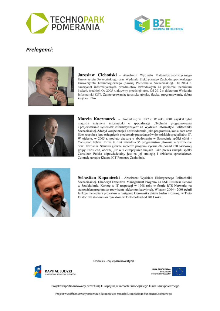 Prelegenci: Jarosław Cichoński - Absolwent Wydziału Matematyczno-Fizycznego Uniwersytetu Szczecińskiego oraz Wydziału Elektrycznego Zachodniopomorskiego Uniwersytetu Technologicznego (dawnej Politechniki Szczecińskiej). Od 2004 r. nauczyciel informatycznych przedmiotów zawodowych na poziomie technikum i szkoły średniej. Od 2005 r. aktywny przedsiębiorca. Od 2012 r. doktorant Wydziału Informatyki ZUT. Zainteresowania: turystyka górska, fizyka, programowanie, dobra książka i film. Marcin Kaczmarek – Urodził się w 1977 r. W roku 2001 uzyskał tytuł magistra inżyniera informatyki o specjalizacji „Techniki programowania i projektowanie systemów informatycznych" na Wydziale Informatyki Politechniki Szczecińskiej. Zdobył kompetencje i doświadczenia jako programista, konsultant oraz lider zespołu a jego osiągnięcia przekonały pracodawców do polskich specjalistów IT. W efekcie, w 2005 r. podjęto decyzję o zbudowaniu w Szczecinie spółki córki Consileon Polska. Firma ta dziś zatrudnia 35 programistów głównie w Szczecinie oraz Poznaniu. Stanowi główne zaplecze programistyczne dla ponad 250 osobowej grupy Consileon, obecnej już w 5 europejskich krajach. Jako prezes zarządu spółki Consileon Polska odpowiedzialny jest za jej strategię i działania sprzedażowe. Członek zarządu Klastra ICT Pomorze Zachodnie. Sebastian Kopaniecki - Absolwent Wydziału Elektrycznego Politechniki Szczecińskiej. Ukończył Executive Management Program na SSE Business School w Sztokholmie. Karierę w IT rozpoczął w 1998 roku w firmie RTS Networks na stanowisku programisty rozwiązań telekomunikacyjnych. W latach 2004 – 2008 pełnił funkcję menedżera projektów a następnie kierownika działu badań i rozwoju w Tieto Enator. Na stanowisku dyrektora w Tieto Poland od 2011 roku. Adam Kuźmiński - dr inż. Adam Kuźmiński ur. 10.06.1976 r. w Szczecinie, ukończył z wyróżnieniem Politechnikę Szczecińską na Wydziale Informatyki. W 2004 r. obronił tytuł doktora nauk technicznych z dziedziny rozpoznawania obrazu. W międzyczasie stażysta uniwersytetu École Centrale de Lyon we Francji. Po zakończeniu kariery naukowej rozpoczął współpracę z niemiecką firmą eLMID GmbH. W 2005r związał się z firmą Softline Polska, gdzie pełni rolę Członka Zarządu na stanowisku Dyrektora IT. Robert Rychcicki - jego pasją od dawna jest algorytmika. Ta pasja pchnęła go w stronę konkursów algorytmicznych i prowadzenia algorytmicznego koła naukowego na uczelni. Naturalną konsekwencją tych zainteresowań było założenie własnej firmy, w której przebył drogę od rzemieślnika (programisty) przez kierownika projektów do szczebli zarządczych mikroprzedsiębiorstwa biorącego udział w międzynarodowych przedsięwzięciach. Osiągnąwszy pewien pułap rozmiaru projektów, które był w stanie prowadzić, przekazał zarządzanie firmą i postanowił zmierzyć się z wyzwaniami z pogranicza nauki i biznesu IT. Prowadzenie własnego przedsiębiorstwa pozwoliło mu na wszechstronny rozwój w ramach swoich zainteresowań. Waldemar Ściesiek - Dyrektor Zarządzający Departamentu Systemów Informatycznych. Ukończył studia na Wydziale Informatyki Politechniki Szczecińskiej (specjalność: informatyka bankowa): magister inżynier informatyki. Od 1996 roku związany z sektorem finansowym. Zajmował się między innymi realizacją fuzji informatycznej czterech banków (Pekao SA, PBKS SA, BDK SA, PBG SA). Od 2005 roku zarządza rozwojem kluczowych systemów w Banku Pekao SA. Pracował w zespole odpowiedzialnym za integrację informatyczną i migrację z systemów BPH SA do systemów Pekao SA. Od 2010 r. Dyrektor Zarządzający Departamentem Systemów Informatycznych w Banku Pekao SA. Odpowiada między innymi za rozwój systemów w obszarach data integration, CRM, BPM, ERP, customer intelligence.