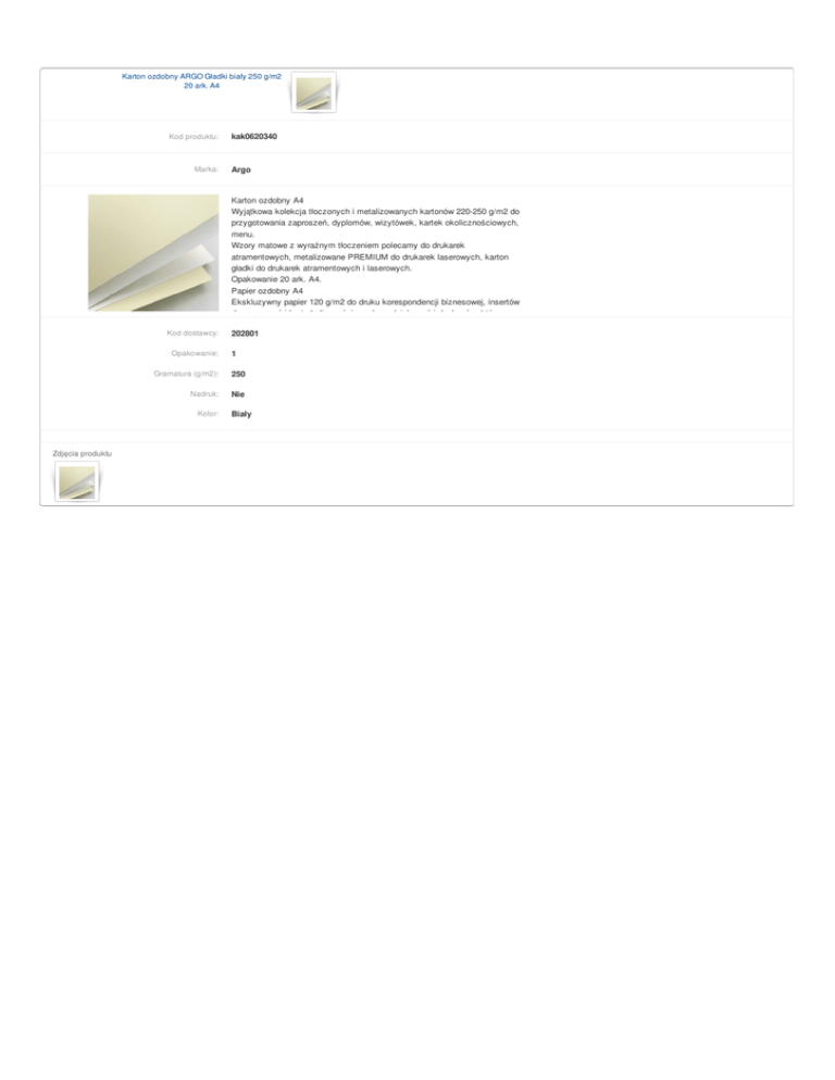 Karton ozdobny ARGO Gładki biały 250 g/m2 20 ark. A4 Kod produktu: Marka: kak0620340 Argo Karton ozdobny A4 Wyjątkowa kolekcja tłoczonych i metalizowanych kartonów 220-250 g/m2 do przygotowania zaproszeń, dyplomów, wizytówek, kartek okolicznościowych, menu. Wzory matowe z wyraźnym tłoczeniem polecamy do drukarek atramentowych, metalizowane PREMIUM do drukarek laserowych, karton gładki do drukarek atramentowych i laserowych. Opakowanie 20 ark. A4. Papier ozdobny A4 Ekskluzywny papier 120 g/m2 do druku korespondencji biznesowej, insertów do zaproszeń i kart okolicznościowych, podziękowań i dyplomów, które Kod dostawcy: Opakowanie: 1 Gramatura (g/m2): 250 Nadruk: Nie Kolor: Zdjęcia produktu 202801 Biały