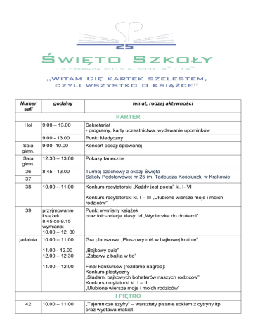 Numer sali temat, rodzaj aktywności godziny PARTER 9.00 – 13.00 Sekretariat - programy, karty uczestnictwa, wydawanie upominków 9.00 - 13.00 Punkt Medyczny Sala gimn. 9.00 -10.00 Koncert poezji śpiewanej Sala gimn. 12.30 – 13.00 Pokazy taneczne 8.45 - 13.00 Turniej szachowy z okazji Święta Szkoły Podstawowej nr 25 im. Tadeusza Kościuszki w Krakowie 10.00 – 11.00 Konkurs recytatorski „Każdy jest poetą” kl. I- VI Hol 36 37 38 Konkurs recytatorski kl. I – III „Ulubione wiersze moje i moich rodziców” 39 przyjmowanie książek 8.45 do 9.15 wymiana: 10.00 – 12. 30 Punkt wymiany książek oraz foto-relacja klasy 1d „Wycieczka do drukarni”. jadalnia 10.00 – 11.00 Gra planszowa „Pluszowy miś w bajkowej krainie” 11.00 - 12.00 12.00 – 12.30 „Bajkowy quiz” „Zabawy z bajką w tle” 11.00 – 12.00 Finał konkursów (rozdanie nagród): Konkurs plastyczny „Śladami bajkowych bohaterów naszych rodziców” Konkurs recytatorki kl. I – III „Ulubione wiersze moje i moich rodziców” I PIĘTRO 42 10.00 – 11.00 „Tajemnicze szyfry” – warsztaty pisanie sokiem z cytryny itp. oraz wystawa makiet 10.30 – 12.30 Prezentacja kronik i zdjęć 10.30 – 12.30 Od papirusu po e- booki- prezentacja oraz zadnia 48 10.30 – 12.00 Gry planszowe "Pieniądze na świecie" - rozgrywki 49 10.00 – 11.30 Prezentacja książek dla niewidomych i słabowidzących oraz maszyny brajlowskiej 47 11.30 - 12.30 Prezentacja „Dzieje dawnej książki” 41 Biblioteka 11.00 – 12.30 Prezentacja, ranking najpopularniejszych książek Czytelnia Wystawa „Fotorelacje ze spotkań z autorami” II PIĘTRO 55 10.00 – 12.00 Loteryjka 54 9.00 – 13.00 „Maraton bajek” 7 przedstawień teatralnych 9.00 „Wszystko smerfne co się smerfnie kończy” kl. Id 10.00 „Kopciuszek” kl. IV d 10.45 „Jaś i Małgosia” kl. III b 11.30 „Eko- Czerwony Kapturek” kl. I c 12.00 „Wakacje Nauczycielki” kl. III a 12.30 „Prawdziwa historia 7 krasnali i królewny Śnieżki” kl.IIa iIId 12.45 „O księciu, który szukał prawdziwej księżniczki” kl. II a i II d 53 10.30 – 12.00 Warsztaty kaligrafii 52 10.00 – 11.30 Fundacja Sztuki Nowej „Znaczy Się” warsztaty z typografii „TYPO ZOO” Wystawa "”Moja ulubiona książka z dzieciństwa” 59 10.00 – 11.00 Maraton czytania – głośne czytanie książek przez znane i nieznane osoby 60 10.00 – 11.30 Komiks też książka - warsztaty tworzenia komiksów - wystawa pokonkursowa - prezentacja rożnych typów komiksów (wystawa) 61 10.00 – 12.00 Księgi Święte -wystawa, czytanie Pisma Świętego, zagadki 62 10.00 – 11.00 Wystawa albumów w języku angielskim Quiz „Jedno pytanie - jedna odpowiedź” Boisko 10.00 – 14.00 Gry, zabawy, konkursy sportowe szkolne, Linarium tereny zielone 12.00 – 14.00 Pokazowy trening piłki nożnej Korytarz I i II piętra Kawiarenki Wydawanie poczęstunku dla uczniów szkoły Serdecznie zapraszamy do wspólnej zabawy!