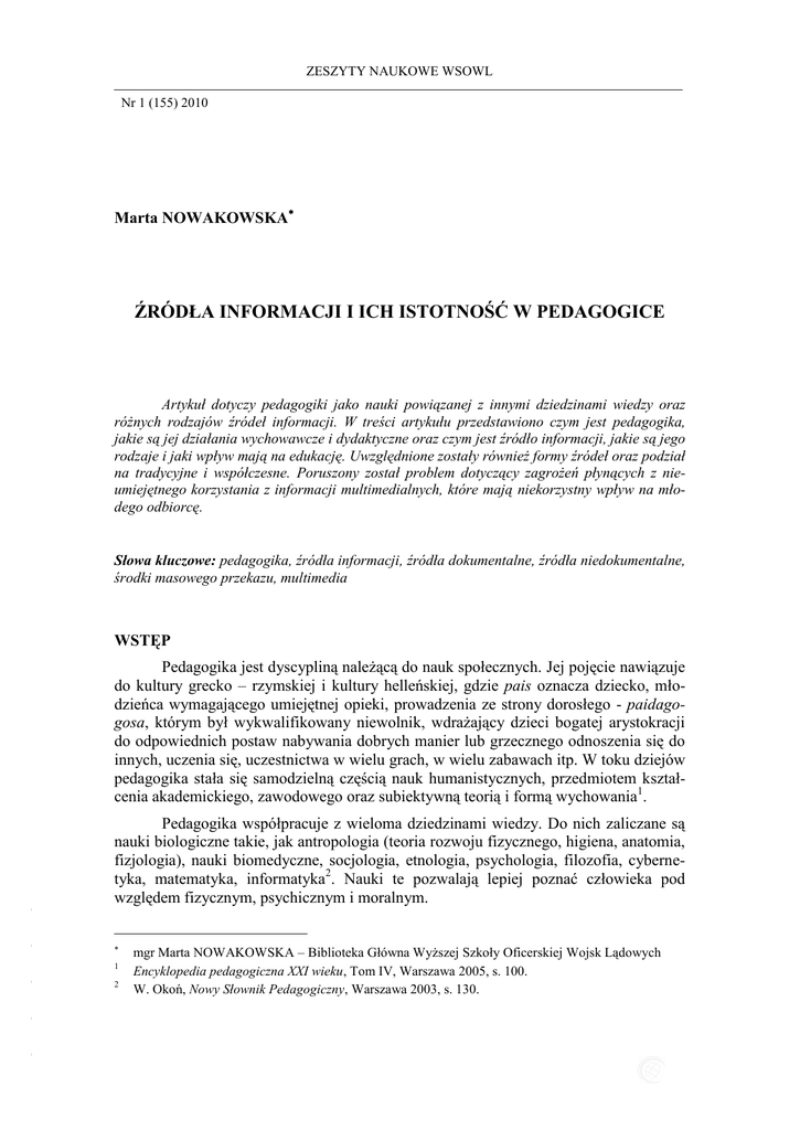 ZESZYTY NAUKOWE WSOWL Nr 1 (155) 2010 ISSN 1731-8157 Marta NOWAKOWSKA ŹRÓDŁA INFORMACJI I ICH ISTOTNOŚĆ W PEDAGOGICE Artykuł dotyczy pedagogiki jako nauki powiązanej z innymi dziedzinami wiedzy oraz różnych rodzajów źródeł informacji. W treści artykułu przedstawiono czym jest pedagogika, jakie są jej działania wychowawcze i dydaktyczne oraz czym jest źródło informacji, jakie są jego rodzaje i jaki wpływ mają na edukację. Uwzględnione zostały również formy źródeł oraz podział na tradycyjne i współczesne. Poruszony został problem dotyczący zagrożeń płynących z nieumiejętnego korzystania z informacji multimedialnych, które mają niekorzystny wpływ na młodego odbiorcę. Słowa kluczowe: pedagogika, źródła informacji, źródła dokumentalne, źródła niedokumentalne, środki masowego przekazu, multimedia WSTĘP Pedagogika jest dyscypliną należącą do nauk społecznych. Jej pojęcie nawiązuje do kultury grecko – rzymskiej i kultury helleńskiej, gdzie pais oznacza dziecko, młodzieńca wymagającego umiejętnej opieki, prowadzenia ze strony dorosłego - paidagogosa, którym był wykwalifikowany niewolnik, wdrażający dzieci bogatej arystokracji do odpowiednich postaw nabywania dobrych manier lub grzecznego odnoszenia się do innych, uczenia się, uczestnictwa w wielu grach, w wielu zabawach itp. W toku dziejów pedagogika stała się samodzielną częścią nauk humanistycznych, przedmiotem kształcenia akademickiego, zawodowego oraz subiektywną teorią i formą wychowania1. - - Pedagogika współpracuje z wieloma dziedzinami wiedzy. Do nich zaliczane są nauki biologiczne takie, jak antropologia (teoria rozwoju fizycznego, higiena, anatomia, fizjologia), nauki biomedyczne, socjologia, etnologia, psychologia, filozofia, cybernetyka, matematyka, informatyka2. Nauki te pozwalają lepiej poznać człowieka pod względem fizycznym, psychicznym i moralnym. - - - 1 2 mgr Marta NOWAKOWSKA – Biblioteka Główna Wyższej Szkoły Oficerskiej Wojsk Lądowych Encyklopedia pedagogiczna XXI wieku, Tom IV, Warszawa 2005, s. 100. W. Okoń, Nowy Słownik Pedagogiczny, Warszawa 2003, s. 130. Marta NOWAKOWSKA Przedmiotem badań pedagogiki jest przede wszystkim świadoma działalność pedagogiczna, a więc proces wychowywania i nauczania, samowychowania i uczenia się, ich cele, treści, przebieg, metody, środki i organizacja. Pedagogika dzieli się na pedagogikę ogólną – dział analizujący podstawy, strukturę i cele wychowania, metodologię badań i doktryn pedagogicznych oraz filozofię postawy wychowania; pedagogikę porównawczą - dział porównujący systemy edukacyjne różnych krajów w kontekście ich społeczno - chronologicznego rozwoju; pedagogikę specjalną – zajmującą się teorią kształcenia, wychowania jednostek odchylonych od normy fizycznej lub psychicznej; pedagogikę społeczną - dział analizujący środowiskowe uwarunkowania wychowania oraz ich wpływ na rozwój człowieka w różnych okresach jego życia; pedagogikę opiekuńczą prowadzoną przez instytucje opiekuńcze oraz stowarzyszenia i organizacje skupiające dzieci i młodzież; pedagogikę resocjalizacyjną- dział zajmujący się nauką praktyczno – teoretyczną obejmującą zagadnienia wychowania dzieci, młodzieży i dorosłych niedostosowanych społecznie oraz pedagogikę wczesnoszkolną – dział zajmujący się oddziaływaniami wychowawczymi w pierwszych klasach szkoły podstawowej oraz teorią i praktyką nauczania początkowego, jak i również pedagogikę dorosłych – andragogikę3. Ważnym elementem pedagogiki w procesie kształcenia i wychowywania są źródła informacji. Pozwalają one na poszerzenie horyzontów wiedzy z danej dziedziny nauki. Według W. Piroga źródłem informacji są materiały, które zaspokajają określone potrzeby informacyjne. W szerszym znaczeniu źródłami informacji mogą być dokumenty, osoby lub instytucje4. Za źródło informacji uważa się zarówno dokumenty, jak i zespół warunków (system, miejsce, organizacje, konferencje, spotkania), którymi mogą być przydatne wiadomości z dziedziny nauki, techniki, ekonomii5. Źródłami mogą być również książki i czasopisma elektroniczne, bazy danych oraz Internet. Źródła informacji powszechnie nazywa się mediami. Media6 to różnego rodzaju przedmioty, urządzenia, programy, a także instytucje przekazujące użytkownikowi informacje w formie komunikatów wyrażonych przez słowa, obrazy i dźwięki lub umożliwiające im samodzielne uzyskiwanie i przekazanie informacji. Urządzeniami przekazującymi informacje są np. telewizor, radio, magnetowid, komputer. Nośnikami przekazu informacji są np. kaseta wideo, płyta CD, Internet. Natomiast formami przekazu informacji jest np. dźwięk, obraz, grafika, film, plik7. Wszystkie wymienione media przenikają się i łączą, tworząc tzw. Multimedia8. Multimedia to zestaw pomocy dydaktycznych obejmujących materiały edukacyjne różnego typu (teksty, filmy, nagrania magnetofonowe itp.) Rozróżnia się multimedia klasyczne tj.: prasa, książki, czasopisma, taśmy audio i wideo, radio, telewizja, sprzęt audiowizualny, środki fotograficzne; multimedia jako nowoczesne środki techniczne służące do cyfrowego, interakcyjnego przetwarzania i prezentacji informacji 3 - 4 5 - 6 - 68 - 8 - 7 Encyklopedia powszechna Laroussa, Tom II, Warszawa 2003,s. 1144 . W. Piróg, Zagadnienia informacji i dokumentacji naukowej, Warszawa 1977, s. 22. W. Piróg, Poradnik pracownika informacji naukowej, technicznej i ekonomicznej, Warszawa 1977, s. 15. B. Siemieniecki, Pedagogika medialna podręcznik akademicki, Warszawa 2007, s. 9-11, 15-17, 21-28. Encyklopedia powszechna XXI wieku, Tom IV, Warszawa 2005, s. 168. [online]. [dostęp: 2009]. Dostępny w Internecie: http:/pl.wikipedia.org/wiki/Multimedia ŹRÓDŁA INFORMACJI I ICH ISTOTNOŚĆ W PEDAGOGICE w zintegrowanej postaci: tekstowej, graficznej i dźwiękowej. Do nich zal