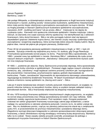 Dokąd prowadzisz nas Ameryko? Janusz Rygielski Bankierzy, część IV Jak podaje Wikipedia, w dziewiętnastym stuleciu zapoczątkowano w Anglii tworzenie instytucji finansowych o nazwie „building society” (towarzystwo budowlane, spółdzielnia mieszkaniowa), które miały pomóc klasie robotniczej w gromadzeniu oszczędności na kupno domów. W ślad za Anglią powstały w Stanach Zjednoczonych budowlane spółdzielnie oszczędnościowe, nazywane „thrift”, „building and loans” lub po prostu „B&Ls”. Instytucje te nie dążyły do uzyskania zysku. Kierowali nimi społecznie członkowie spółdzielni i lokalne instytucje. Liderzy wierzyli, że stanowiły one część szerszej reformy społecznej i nie identyfikowali się z sektorem finansowym, który służył biznesom. B&Ls nie tylko pomagały ludziom stać się lepszymi obywatelami (poprzez ułatwienie kupna domu), ale również uczyły zwyczaju systematycznego oszczędzania i wzajemnej współpracy, która wzmacniała dobre stosunki między ludźmi. Były to piękne idee, niemal tak piękne jak program pierwszej „Solidarności”. Przez 40 lat od powołania pierwszej spółdzielni mieszkaniowej w Anglii, w 1831 r. było ich niewiele. Sytuacja zmieniła się radykalnie przy końcu 19. stulecia, gdy Druga Rewolucja Przemysłowa spowodowała wzrost popytu na domy. Popularność B&Ls spowodowała, że w 1880 r. powstał nowy typ spółdzielni o nazwie „Narodowy B&Ls”, zakładanej dla zysku przez naszych dobrych znajomych – bankierów. „Narodowcy” obiecywali czterokrotnie wyższe zyski niż inne instytucje finansowe. W 1893. r., podobnie jak obecnie, Stany Zjednoczone przeżywały depresję, która spowodowała zmniejszenie liczby członków w spółdzielniach. Ponieważ ciągły napływ nowych członków był konieczny, aby „narodowcy” mogli wypłacać zarówno procenty członkom jak i wynagrodzenia dla pracowników i kierownictwa, przyhamowanie napływu gotówki doprowadzało do bankructwa. Fiasko „narodowców” doprowadziło do wprowadzenia stanowego ustawodawstwa, regulującego tę dziedzinę działalności finansowej. W latach trzydziestych dwudziestego stulecia zmieniono nazwę spółdzielni na „Saving and Loans” – S&Ls. Lata po II wojnie światowej były okresem rozkwitu pożyczek mieszkaniowych, ze względu na powrót milionów żołnierzy ze wszystkich frontów, którzy w szybkim tempie zakładali rodziny i potrzebowali domów. S&Ls finansowały większość tej ekspansji mieszkaniowej. W roku 1979 kondycja finansowa spółdzielni mieszkaniowych uległa pogorszeniu, ze względu na wzrost stopy procentowej oraz inflację spowodowaną wzrostem cen ropy naftowej. Setki spółdzielni zostały zagrożone bankructwem. Pod naciskiem rządu, Kongres postanowił uratować ten sektor gospodarki finansowej rozszerzając zakres jego działalności, a także nadając mu uprawnienia w zakresie udzielania pożyczek. Liczono na to, że sektor uratuje się sam. Aby mu dodatkowo pomóc, rząd po raz pierwszy jednoznacznie starał się o zwiększenie zysku firm, w przeciwieństwie do promocji mieszkalnictwa i posiadania własnego domu. Złagodzono wymogi dotyczące księgowości w zakresie sprawozdawczości dotyczącej sytuacji finansowej, a także zlikwidowano wymóg określający minimalną liczbę akcjonariuszy. Bankierzy tylko na to czekali. Nowe zasady ułatwiły przyszłe szwindle, prowadzące do jednego z największych kryzysów finansowych w historii Stanów Zjednoczonych. 1/5 Dokąd prowadzisz nas Ameryko? W 1986 r. wprowadzono reformę podatkową, która spowodowała obniżenie wartości nieruchomości i zakończyła boom mieszkaniowy. Natomiast firmy S&Ls otrzymały wiele uprawnień bankowych, bez restrykcji obowiązujących wówczas banki. Nie uratowało to jednak tych instytucji ponieważ już wcześniej wdały się one w ryzykowne pożyczki na kupno domów. Niespłacone długi mieszkaniowe wynosiły w USA 700 miliardów w 1976 r., a cztery lata później już 1,5 biliona. Jeden z głównych mechanizmów, który doprowadził do ówczesnego kryzysu, polegał na tym, że wprowadzono instytucję brokera, który otrzymywał prowizję od klientów, za lokatę ich inwestycji finansowej na najlepszych warunkach. Wcześniej banki i spółdzielnie mogły posiadać jedynie 5 proc. depozytów uzyskanych w ten sposób, ale to ograniczenie zostało zniesione. Dzięki temu mały oddział spółdzielni mógł zgromadzić ogromne kwoty, oferując wysoki procent. Aby móc cokolwiek zarobić na tak kosztownych depozytach musiał udzielać pożyczek na jeszcze wyższy procent, a to zwykle prowadzi do ryzykownych inwestycji. W rezultacie zbankrutowało 747 spółdzielni. Całkowity koszt kryzysu wyniósł około 160 miliardów, z czego 124 miliardy zapłacili bezpośrednio podatnicy. Innymi słowy 124 miliardy wydano na pomoc bankierom. W roku 2009 koszt niefrasobliwej gospodarki prowadzonej przez Freddie Mac wyniósł 160 miliardów, tyle co cały kryzys w roku 1986. A przecież to tylko jedna, wcale nie największa instytucja spośród bankrutujących tysięcy i to tylko w Stanach Zjednoczonych. Ten przykład ilustruje astronomiczne wręcz rozmiary obecnego kryzysu. Zdawać by się mogło, że doświadczenia roku 1986. uchronią przed podobnymi sytuacjami w przyszłości. Że państwo, a przede wszystkim prezydent i rząd, zrobią wszystko, aby uchronić społeczeństwo przed mechanizmem wykradania pieniędzy. Niestety, jak dowodzą fakty przedstawione w poprzednich odcinkach sagi o bankierach, obie te instytucje, z pełną świadomością, konsekwentnie przeciwstawiały się ochronie społeczeństwa. Czy tylko amerykańskiego? *** Pod koniec ubiegłego roku australijska prasa lokalna doniosła, że 40 gmin w Nowej Południowej Walii straciło fundusze zainwestowane w amerykańskiego olbrzyma finansowego Lehman Brothers. Nieco informacji na ten temat można wyłowić z październikowych numerów prowincjonalnych gaz