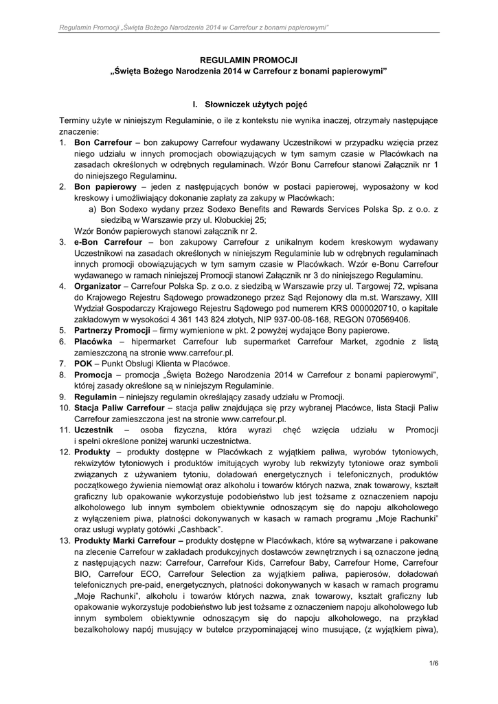 Regulamin Promocji „Święta Bożego Narodzenia 2014 w Carrefour z bonami papierowymi” REGULAMIN PROMOCJI „Święta Bożego Narodzenia 2014 w Carrefour z bonami papierowymi” I. Słowniczek użytych pojęć Terminy użyte w niniejszym Regulaminie, o ile z kontekstu nie wynika inaczej, otrzymały następujące znaczenie: 1. Bon Carrefour – bon zakupowy Carrefour wydawany Uczestnikowi w przypadku wzięcia przez niego udziału w innych promocjach obowiązujących w tym samym czasie w Placówkach na zasadach określonych w odrębnych regulaminach. Wzór Bonu Carrefour stanowi Załącznik nr 1 do niniejszego Regulaminu. 2. Bon papierowy – jeden z następujących bonów w postaci papierowej, wyposażony w kod kreskowy i umożliwiający dokonanie zapłaty za zakupy w Placówkach: a) Bon Sodexo wydany przez Sodexo Benefits and Rewards Services Polska Sp. z o.o. z siedzibą w Warszawie przy ul. Kłobuckiej 25; Wzór Bonów papierowych stanowi załącznik nr 2. 3. e-Bon Carrefour – bon zakupowy Carrefour z unikalnym kodem kreskowym wydawany Uczestnikowi na zasadach określonych w niniejszym Regulaminie lub w odrębnych regulaminach innych promocji obowiązujących w tym samym czasie w Placówkach. Wzór e-Bonu Carrefour wydawanego w ramach niniejszej Promocji stanowi Załącznik nr 3 do niniejszego Regulaminu. 4. Organizator – Carrefour Polska Sp. z o.o. z siedzibą w Warszawie przy ul. Targowej 72, wpisana do Krajowego Rejestru Sądowego prowadzonego przez Sąd Rejonowy dla m.st. Warszawy, XIII Wydział Gospodarczy Krajowego Rejestru Sądowego pod numerem KRS 0000020710, o kapitale zakładowym w wysokości 4 361 143 824 złotych, NIP 937-00-08-168, REGON 070569406. 5. Partnerzy Promocji – firmy wymienione w pkt. 2 powyżej wydające Bony papierowe. 6. Placówka – hipermarket Carrefour lub supermarket Carrefour Market, zgodnie z listą zamieszczoną na stronie www.carrefour.pl. 7. POK – Punkt Obsługi Klienta w Placówce. 8. Promocja – promocja „Święta Bożego Narodzenia 2014 w Carrefour z bonami papierowymi”, której zasady określone są w niniejszym Regulaminie. 9. Regulamin – niniejszy regulamin określający zasady udziału w Promocji. 10. Stacja Paliw Carrefour – stacja paliw znajdująca się przy wybranej Placówce, lista Stacji Paliw Carrefour zamieszczona jest na stronie www.carrefour.pl. 11. Uczestnik – osoba fizyczna, która wyrazi chęć wzięcia udziału w Promocji i spełni określone poniżej warunki uczestnictwa. 12. Produkty – produkty dostępne w Placówkach z wyjątkiem paliwa, wyrobów tytoniowych, rekwizytów tytoniowych i produktów imitujących wyroby lub rekwizyty tytoniowe oraz symboli związanych z używaniem tytoniu, doładowań energetycznych i telefonicznych, produktów początkowego żywienia niemowląt oraz alkoholu i towarów których nazwa, znak towarowy, kształt graficzny lub opakowanie wykorzystuje podobieństwo lub jest tożsame z oznaczeniem napoju alkoholowego lub innym symbolem obiektywnie odnoszącym się do napoju alkoholowego z wyłączeniem piwa, płatności dokonywanych w kasach w ramach programu „Moje Rachunki” oraz usługi wypłaty gotówki „Cashback”. 13. Produkty Marki Carrefour – produkty dostępne w Placówkach, które są wytwarzane i pakowane na zlecenie Carrefour w zakładach produkcyjnych dostawców zewnętrznych i są oznaczone jedną z następujących nazw: Carrefour, Carrefour Kids, Carrefour Baby, Carrefour Home, Carrefour BIO, Carrefour ECO, Carrefour Selection za wyjątkiem paliwa, papierosów, doładowań telefonicznych pre-paid, energetycznych, płatności dokonywanych w kasach w ramach programu „Moje Rachunki”, alkoholu i towarów których nazwa, znak towarowy, kształt graficzny lub opakowanie wykorzystuje podobieństwo lub jest tożsame z oznaczeniem napoju alkoholowego lub innym symbolem obiektywnie odnoszącym się do napoju alkoholowego, na przykład bezalkoholowy napój musujący w butelce przypominającej wino musujące, (z wyjątkiem piwa), 1/6 Regulamin Promocji „Święta Bożego Narodzenia 2014 w Carrefour z bonami papierowymi” preparatów do początkowego żywienia niemowląt zgodnie z definicją wskazaną w ustawie z dnia 25 sierpnia 2006 r. o bezpieczeństwie żywności i żywienia. II. Zasady ogólne 1. W ramach Promocji Uczestnik za zakup Produktów i Produktów Marki Carrefour dokonany przy użyciu Bonu papierowego w okresie trwania Promocji może otrzymać premię w postaci e-Bonu Carrefour. 2. Promocja obowiązuje w Placówkach w okresie od dnia 2 listopada 2014 roku do dnia 31 stycznia 2015 roku. 3. Promocja odbywać się będzie zgodnie z jej Regulaminem. Prawa i obowiązki Organizatora oraz Uczestników określone są wyłącznie w niniejszym Regulaminie oraz we właściwych przepisach prawa. 4. Wszelkie informacje o Promocji dostępne w materiałach reklamowych mają jedynie charakter informacyjny. III. Warunki otrzymania premii w postaci e-Bonu Carrefour 1. Warunkiem otrzymania przez Uczestnika premii w postaci e-Bonu Carrefour jest spełnienie łącznie poniższych warunków: a) dokonanie w Placówce, w okresie obowiązywania Promocji, zakupu Produktów o łącznej wartości przewyższającej lub równej 100 złotych brutto po uwzględnieniu rabatów naliczanych bezpośrednio przy kasie, w tym co najmniej jednego Produktu Marki Carrefour o wartości przewyższającej lub równej 5 złotych brutto po uwzględnieniu rabatów naliczanych bezpośrednio przy kasie; b) dokonanie płatności środkiem płatniczym w postaci Bonu papierowego na kwotę przewyższającą lub równą 100 złotych brutto. 2. Wartość otrzymanego e-Bonu Carrefour w ramach niniejszej Promocji stanowi 10% ostatecznej kwoty zapłaconej Bonem papierowym za zakup Produktów Marki Carrefour, z zastrzeżeniem postanowień ust.3 poniżej. Wartość ta jest zaokrąglana do pełnych groszy. 3. Maksymalna wartość e-Bonu Carrefour przyznanego w ramach niniejszej Promocji do jednego paragonu wynos