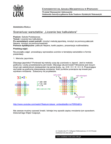 Wydział Matematyki i Informatyki Studenckie Interdyscyplinarne Koło Naukowe Dydaktyki Matematyki AGNIESZKA KUKLA Scenariusz warsztatów: „Liczenie bez kalkulatora” Poziom: Szkoła Podstawowa. Temat: Liczenie bez kalkulatora. Po warsztatach uczeń potrafi: mnożyć metodą japońską, mnożyć za pomocą pałeczek Nepera, mnożyć za pomocą kwadratu Pomoce dydaktyczne: pałeczki Nepera, kartki papieru, prezentacja multimedialna. Przebieg zajęć: Na początku zajęć prowadzący wprowadza uczniów w tematykę warsztatów w formie prezentacji. 1. Metoda japońska. Dlaczego japońska? Ponieważ tej metody uczą się uczniowie w Japonii. Jest to metoda graficzna. Liczby przedstawiamy jak kreski. Dlaczego akurat kreski? Mnożenie jest niczym innym jak wielokrotnym dodawaniem tej samej liczby, np. 4×6 = 6 + 6 + 6 + 6. Przecinające się kreski są graficzną interpretacją mnożenia. Ilość punktów przecięcia się kresek jest wynikiem mnożenia. Zobaczmy na przykładzie. http://www.youtube.com/watch?feature=player_embedded&v=e-P5RGdjICo Nie zawsze musimy rysować kreski. Istnieje inny sposób zapisu mnożenia tym sposobem. Dokonał tego Wątor Czajczyk. ul. Umultowska 87, Collegium Mathematicum, 61-614 Poznań [email protected] www.studmat.wmi.amu.edu.pl Wydział Matematyki i Informatyki Studenckie Interdyscyplinarne Koło Naukowe Dydaktyki Matematyki Liczby do wymnożenia: Klasa 4 23×24 (=552) 37×78 (=2886) 59×42 (=2478) 124×184 (=22816) Klasa 5 i 6 37×56 (=2072) 58×53 (=3074) 137×245 (=33565) 214×231 (=49434) 2. Pałeczki Nepera. Jest to przyrząd skonstruowany przez Johna Nepera, a właściwie Napiera. Był to szkocki matematyk. Ciekawostką może być to, że na podstawie Księgi Objawienia ten matematyk wyliczył koniec świata na rok 1688. W 1617 roku Neper przedstawił ten sposób mnożenia w swoim traktacie "Rebdologia". Urządzenie jego - w różnych wersjach - było niesłychanie popularne przez ok. 200 lat. Napier zapisał pewną wersję tabliczki mnożenia na zbiorze specjalnych pałeczek, czy też raczej prętów o przekroju kwadratowym. Na każdej płaszczyźnie takiego pręta figurował specjalnie pomysłowo zapisany iloczyn danej mnożnej przy mnożeniu przez 1, 2, 3, ..., 9. Chcąc wykonać mnożenie należało wybrać ze zbioru prętów te odpowiadające cyfrom mnożnej, ułożyć je obok siebie na podstawce i odczytać pewne iloczyny cząstkowe, aby je potem dodać do siebie. ul. Umultowska 87, Collegium Mathematicum, 61-614 Poznań [email protected] www.studmat.wmi.amu.edu.pl Wydział Matematyki i Informatyki Studenckie Interdyscyplinarne Koło Naukowe Dydaktyki Matematyki Jak liczymy? Popatrzmy na przykładzie: 25×25 Przykłady do obliczenia: Klasa 4 24×26 (=624) 36×17 (=617) 56×18 (=1008) 61×21 (=1281) ul. Umultowska 87, Collegium Mathematicum, 61-614 Poznań [email protected] www.studmat.wmi.amu.edu.pl Wydział Matematyki i Informatyki Studenckie Interdyscyplinarne Koło Naukowe Dydaktyki Matematyki Klasa 5 i 6 57×32 (=1824) 123×321 (=39483) 145×214 (=31030) 178×263 (=46814) 3. Mnożenie za pomocą kwadratu. A właściwie mnożenie kratowe. Polega ono na rozłożeniu mnożenia dwóch większych liczb na kilka mnożeń jednostkowych. Aby wykonać to mnożenie musimy zrobić tabelę. Zobaczmy na przykładzie: Teraz mnożymy liczbę, która jest nad daną kolumną przez liczbę, która jest przed danym wierszem. Cyfrę dziesiątek wpisujemy w kratce nad czerwoną kreską, a cyfrę jednostek pod nią. Tym sposobem mamy coś takiego: ul. Umultowska 87, Collegium Mathematicum, 61-614 Poznań [email protected] www.studmat.wmi.amu.edu.pl Wydział Matematyki i Informatyki Studenckie Interdyscyplinarne Koło Naukowe Dydaktyki Matematyki Teraz pozostaje nam tylko zsumować liczby na tych kolorowych przekątnych: Takie mnożenie jest już znane co najmniej od XV wieku. Wykonywanie przykładów: Klasa 4 65×54 (=3510) 136×212 (=28832) 248×279 (=69192) 172×321 (=55212) Klasa 5 i 6 345×29 (=10005) 1723×247 (=425581) 2405×689 (=1657045) 4. Konkurs. Kto najszybciej wykona poprawnie mnożenie dowolnym sposobem Klasa 4 45×67 (=3015) Klasa 5 149×216 (=32184) Klasa 6 1402×356 (=499112) ul. Umultowska 87, Collegium Mathematicum, 61-614 Poznań [email protected] www.studmat.wmi.amu.edu.pl