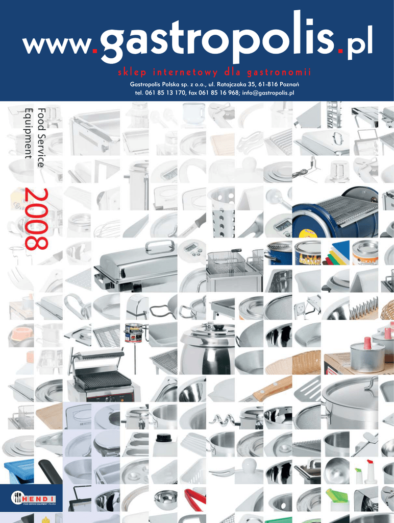 Gastropolis Polska sp. z o.o., ul. Ratajczaka 35, 61-816 Poznaƒ tel. 061 85 13 170, fax 061 85 16 968; [email protected] Szanowni Paƒstwo, Oddajemy w Paƒstwa r´ce nowy katalog gastro Hendi na rok 2008. Znajdziecie w nim Paƒstwo ponad 1600 produktów niezb´dnych do wyposa˝enia wszelkiego typu punktów gastronomicznych. Katalog powsta∏ na podstawie wieloletnich doÊwiadczeƒ ca∏ej Grupy Hendi w produkcji i dystrybucji profesjonalnego sprz´tu gastronomicznego. W Grupie Hendi w ostatnich latach nastàpi∏o wiele zmian. 8 lat temu Grupa Hendi otworzy∏a swój odzia∏ w Austrii, który jest odpowiedzialny za sprzeda˝ w Europie Po∏udniowej. W zesz∏ym roku koledzy z Austrii otworzyli nowe, du˝e centrum logistyczne w celu usprawnienia procesów logistycznych. W 2005 powsta∏ odzia∏ w Polsce, odpowiedzialny za sprzeda˝ w Europie Wschodniej i Rosji. Grupa Hendi od ponad 10 lat posiada w∏asnà fabryk´ sprz´tów gastronomicznych, a od 4 lat dysponujemy w∏asnà fabrykà pasty do podgrzewaczy. Wszystkie produkty umieszczone w katalogu znajdziecie Paƒstwo tak˝e na naszej stronie internetowej www.hendipolska.pl. Dzi´ki tej stronie mo˝ecie Paƒstwo uzyskiwaç wszystkie potrzebne, aktualne informacje dotyczàce poszczególnych produktów. Nale˝à do nich informacje na temat danych technicznych produktów, ich wymiarów, warunków dostawy, warunków gwarancji, instrukcji obs∏ugi i inne. Mo˝ecie Paƒstwo równie˝ pobraç z naszej strony internetowej zdj´cia produktów o wysokiej rozdzielczoÊci. Na naszej stronie internetowej umieÊciliÊmy dane teleadresowe naszych dystrybutorów. Dzi´ki temu klienci detaliczni mogà szybko i wygodnie uzyskaç informacje na temat sieci dystrybucji produktów firmy Hendi w ich okolicy. Wprawdzie katalog i strona internetowa sà wa˝nym narz´dziem w procesie sprzeda˝y, ale naszym zdaniem najwa˝niejsze jest dostarczanie na rynek wysokiej jakoÊci produktów po odpowiedniej cenie, zapewnienie sprawdzonej sieci us∏ug serwisowych i w koƒcu ws∏uchiwanie si´ w zg∏aszane przez Paƒstwa potrzeby. Wszyscy pracownicy firmy Hendi dok∏adajà staraƒ, aby codziennie s∏u˝yç Paƒstwu pomocà i radà. W myÊl tych zasad ˝yczymy Paƒstwu wielu sukcesów! Maksymilian Kultys Prezes Zarzàdu I Grupa Hendi Hendi Polska Hendi Holandia Hendi Austria II III Nasze magazyny wyposa˝one sà w rega∏y wysokiego sk∏adowania. Dzi´ki temu mo˝emy efektywnie obs∏ugiwaç naszych klientów. W naszym showroomie mo˝na zapoznaç si´ ze wszystkimi oferowanymi przez nas produktami. IV Specjalnie dla klientów posiadajàcych salony sprzeda˝y wi´kszoÊç z naszych produktów pakujemy w opakowania z blistrem lub w kolorowe kartony, zwi´kszajàce sprzeda˝. Wiele produktów mo˝emy zapakowaç równie˝ w specjalne opakowania z logo naszych dystrybutorów. Wszystkie nasze produkty posiadajà kody kreskowe, u∏atwiajàce póêniejszà sprzeda˝ i optymalne gospodarowanie zapasami magazynowymi. V Spis treÊci – profesjonalne podgrzewacze na past´ – Eco Line . . . . . . . 55 – akcesoria do podgrzewaczy . . . . . . . . . . . . . . . . . . . . . . . 57 – pasty do podgrzewaczy . . . . . . . . . . . . . . . . . . . . . . . . . . 58 – paliwo do podgrzewaczy z knotem . . . . . . . . . . . . . . . . . . 59 Index produktów . . . . . . . . . . . . . . . . . . . . . . . . . . . . VIII – profesjonalne kocio∏ki elektryczne . . . . . . . . . . . . . . . . . . 60 1. Naczynia kuchenne . . . . . . . . . . . . . . . . . . . . . . . . . 1-13 – profesjonalne podgrzewacze elektryczne . . . . . . . . . . . 61-62 – szybkowar Profi Line . . . . . . . . . . . . . . . . . . . . . . . . . . . . . 1 – profesjonalne dyspensery do soków i muesli . . . . . . . . . . . 63 – garnki Profi Line . . . . . . . . . . . . . . . . . . . . . . . . . . . . . . . 2-3 – dyspensery do zimnych sosów . . . . . . . . . . . . . . . . . . . . . 64 – garnki Profi Line z pokrywami . . . . . . . . . . . . . . . . . . . . . . 4 – pojemniki na sztuçce Eco Line . . . . . . . . . . . . . . . . . . . 65-66 – garnki aluminiowe Profi Line . . . . . . . . . . . . . . . . . . . . . . . 5 – pojemniki na sztuçce Profi Line . . . . . . . . . . . . . . . . . . . . . 65 – patelnie aluminiowe Profi Line z pow∏okà teflonowà „Platinum“ 6 – przybory do serwowania Profi Line . . . . . . . . . . . . . . . 67-68 – patelnie aluminiowe Profi Line z pow∏okà teflonowà „SilverStone“ 6 – przybory do serwowania Eco Line . . . . . . . . . . . . . . . . . . . 69 – patelnie z odlewu aluminium Profi Line powlekane tytanem . 7 – ∏y˝ki do sa∏atek, chochle z tworzywa . . . . . . . . . . . . . . . . . 70 – patelnie ze stali Profi Line . . . . . . . . . . . . . . . . . . . . . . . . . . 8 – patelnie ze stali z ràczkami Profi Line . . . . . . . . . . . . . . . . . 8 6. Porcelana . . . . . . . . . . . . . . . . . . . . . . . . . . . . . . . . 71-75 – wyroby ˝eliwne . . . . . . . . . . . . . . . . . . . . . . . . . . . . . . 9-10 – porcelana . . . . . . . . . . . . . . . . . . . . . . . . . . . . . . . . . 71-72 – brytfanny . . . . . . . . . . . . . . . . . . . . . . . . . . . . . . . . . . . . 11 – porcelana Andaluzja . . . . . . . . . . . . . . . . . . . . . . . . . 73-75 – miski . . . . . . . . . . . . . . . . . . . . . . . . . . . . . . . . . . . . . . . 12 – naczynia kuchenne . . . . . . . . . . . . . . . . . . . . . . . . . . . . . 13 7. Tace . . . . . . . . . . . . . . . . . . . . . . . . . . . . . . . . . . . . 76-89 – tace antypoÊlizgowe – mahoƒ . . . . . . . . . . . . . . . . . . . . . 76 2. Przybory kuchenne . . . . . . . . . . . . . . . . . . . . . . . . . 14-29 – tace antypoÊlizgowe – teak . . . . . . . . . . . . . . . . . . . . . . . 76 – chochle monoblok Profi Line . . . . . . . . . . . . . . . . . . . . . . 14 – tace antypoÊlizgowe – orzech . . . . . . . . . . . . . . . . . . . . . . 76 – ∏y˝ki cedzakowe Profi Line 