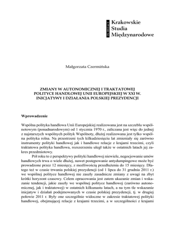 IX: 2012 nr 2 Małgorzata Czermińska ZMIANY W AUTONOMICZNEJ I TRAKTATOWEJ POLITYCE HANDLOWEJ UNII EUROPEJSKIEJ W XXI W. INICJATYWY I DZIAŁANIA POLSKIEJ PREZYDENCJI Wprowadzenie Wspólna polityka handlowa Unii Europejskiej realizowana jest na szczeblu wspólnotowym (ponadnarodowym) od 1 stycznia 1970 r., zaliczana jest więc do jednej z najstarszych wspólnych polityk Wspólnoty, dłużej realizowana jest tylko wspólna polityka rolna. Na przestrzeni tych kilkudziesięciu lat zmieniały się zarówno instrumenty polityki handlowej jak i handlowe relacje z krajami trzecimi, czyli traktatowa polityka handlowa, rozszerzeniu uległ także w ostatnich latach jej zakres przedmiotowy. Pół roku to z perspektywy polityki handlowej niewiele, negocjowanie umów handlowych trwa o wiele dłużej, nawet postępowanie antydumpingowe może być prowadzone przez 12 miesięcy, z możliwością przedłużenia do 15 miesięcy. Dlatego też w czasie trwania polskiej prezydencji (od 1 lipca do 31 grudnia 2011 r.) we wspólnej polityce handlowej nie zaszły zasadnicze zmiany z uwagi na zbyt krótki horyzont czasowy. Celem opracowania jest zatem ukazanie zmian i wskazanie tendencji, jakie zaszły we wspólnej polityce handlowej (zarówno autonomicznej, jak i traktatowej) w ostatnich kilkunastu latach, a na tym tle wskazanie inicjatyw i działań podejmowanych w czasie polskiej prezydencji, tj. w drugiej połowie 2011 r. Były one szczególnie widoczne w zakresie traktatowej polityki handlowej, obejmującej relacje z krajami trzecimi, a w szczególności z krajami 52 MAŁGORZATA CZERMIŃSKA sąsiadującymi z Unią Europejską. Chodzi tutaj o realizowanie idei otwartej Europy poprzez wzmocnienie Partnerstwa Wschodniego i rozszerzenia UE, a także o Europejską Politykę Sąsiedztwa w wymiarze południowym. Polska konsekwentnie dążyła zwłaszcza do wzmocnienia wschodniego wymiaru polityki sąsiedztwa. Zasady i zakres wspólnej polityki handlowej Unii Europejskiej w świetle traktatu z Lizbony Wejście w życie z dniem 1 stycznia 1958 r. traktatu rzymskiego, powołującego Europejską Wspólnotę Gospodarczą, oznaczało powstanie ugrupowania integracyjnego, opartego początkowo na zasadach unii celnej, a później wspólnego rynku. Integracja Wspólnoty w ramach unii celnej, po wprowadzeniu wspólnej taryfy celnej w handlu z krajami trzecimi w 1968 r. doprowadziła do ukształtowania wspólnej polityki handlowej (WPH). Ta ostatnia jest realizowana na szczeblu wspólnotowym od 1970 r. Podstawy traktatowe dla wspólnej polityki handlowej zostały pierwotnie określone w części III traktatu rzymskiego w Tytule VII – Wspólna polityka handlowa, w artykułach 110–116 oraz w części IV – Postanowienia ogólne i końcowe, w artykule 228 i 229. Główne jej zasady zawarte w traktacie rzymskim do dzisiaj nie uległy zasadniczej zmianie, obecnie są one określone w Tytule II, w artykułach 206 i 207 traktatu o funkcjonowaniu Unii Europejskiej (TFUE). Art. 206 TFUE (dawny 131 TWE) mówi o tym, że poprzez utworzenie unii celnej Unia Europejska przyczynia się do harmonijnego rozwoju handlu światowego, stopniowego zniesienia ograniczeń w handlu międzynarodowym i w bezpośrednich inwestycjach zagranicznych oraz do zmniejszenia barier celnych i innych barier1. Natomiast zgodnie z art. 207 ust. 1 (dawny art. 133 TWE) wspólna polityka handlowa, opiera się na jednolitych zasadach, w szczególności w zakresie: – zmian stawek celnych, – zawierania umów celnych i handlowych dotyczących handlu towarami i usługami oraz handlowych aspektów własności intelektualnej, bezpośrednich inwestycji zagranicznych, – ujednolicenia instrumentów liberalizacyjnych (np. autonomicznych środków taryfowych), – polityki eksportowej, – środków ochronnych w handlu, podejmowanych np. w przypadku dumpingu lub subsydiów. W traktacie lizbońskim rozszerzony został zakres przedmiotowy wspólnej polityki handlowej, która obejmuje również umowy dotyczące handlu usługami (poza towarami), handlowe aspekty własności intelektualnej oraz bezpośrednie inwestycje zagraniczne. 1 Art. 206 traktatu o funkcjonowaniu Unii Europejskiej, wersja skonsolidowana traktatu o funkcjonowaniu Unii Europejskiej, Dz.Urz. UE, C 83, 30.03.2010. ZMIANY W AUTONOMICZNEJ I TRAKTATOWEJ POLITYCE... 53 WPH realizowana jest w dwóch obszarach: autonomicznej i traktatowej polityki handlowej. Autonomiczna polityka handlowa obejmuje wszystkie narzędzia, które Wspólnota stosuje w eksporcie i imporcie, a które bezpośrednio nie wynikają z ustaleń traktatowych. Do takich instrumentów zaliczyć należy taryfę celną i cła (na ich wysokość wpływają jednak również decyzje podejmowane w ramach polityki traktatowej), autonomiczne środki taryfowe (gospodarcze kontyngenty taryfowe, zawieszenia poboru cła), środki protekcji uwarunkowanej, czyli takie, które mogą być wprowadzone po spełnieniu określonych przesłanek (środki antydumpingowe, antysubwencyjne i instrumenty ochrony przed nadmiernym importem). Decyzje w zakresie autonomicznej polityki handlowej są podejmowane jednostronnie przez Radę (zwykle kwalifikowaną większością głosów), zazwyczaj na wniosek Komisji Europejskiej. Traktatowa polityka handlowa kształtowana jest na mocy umów i porozumień międzynarodowych zawieranych przez Wspólnotę z krajami trzecimi i organizacjami międzynarodowymi (np. WTO). W tytule V w artykule. 218 TFUE (dawny art. 300 TWE) stwierdzono, że umowy pomiędzy Unią a państwami trzecimi lub organizacjami międzynarodowymi są negocjowane i zawierane zgodnie z określoną procedurą, z zastrzeżeniem postanowień szczególnych art. 207 TFUE. Rokowania prowadzi Komisja na podstawie mandatu Rady, w konsultacji ze specjalnym Komitetem ds. Polityki Handlowej (dawny Komitet Artykułu 133). Poza ogólnie obowiązującą zasadą kwalifikowanej większości głosów, w podejmowaniu decyzji przez Radę jednomyślność jest wymagana przy podpisywani