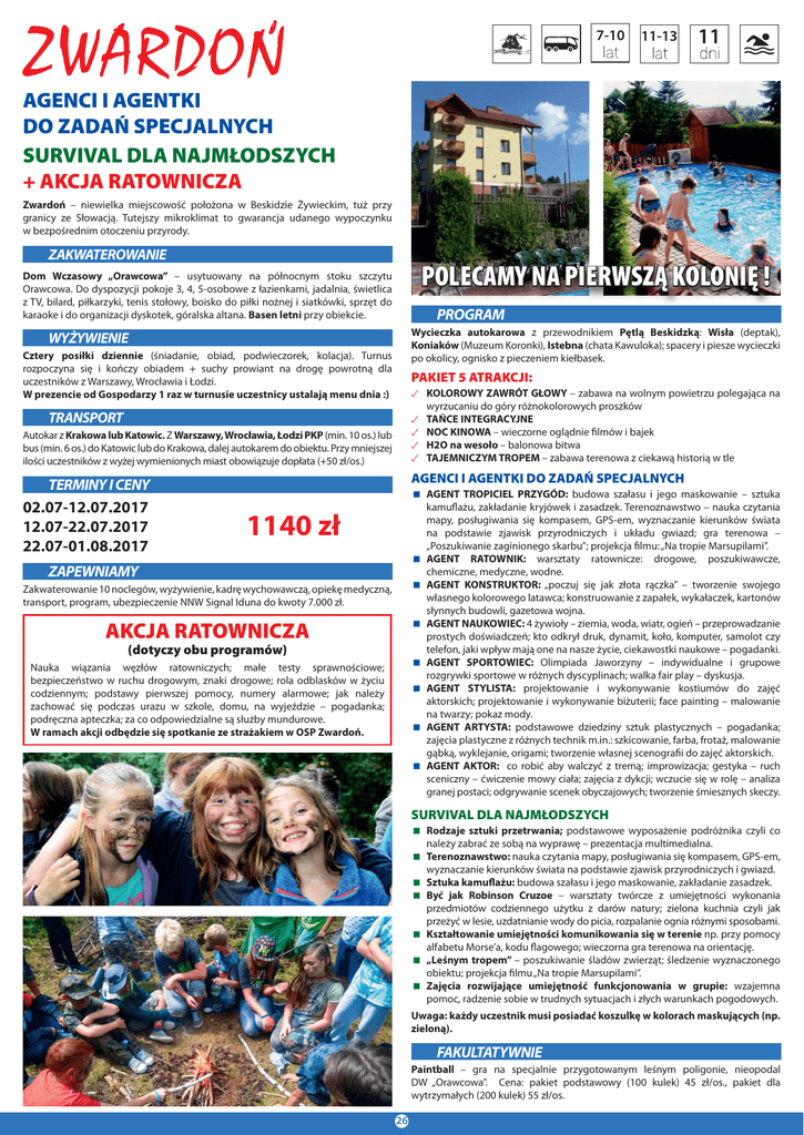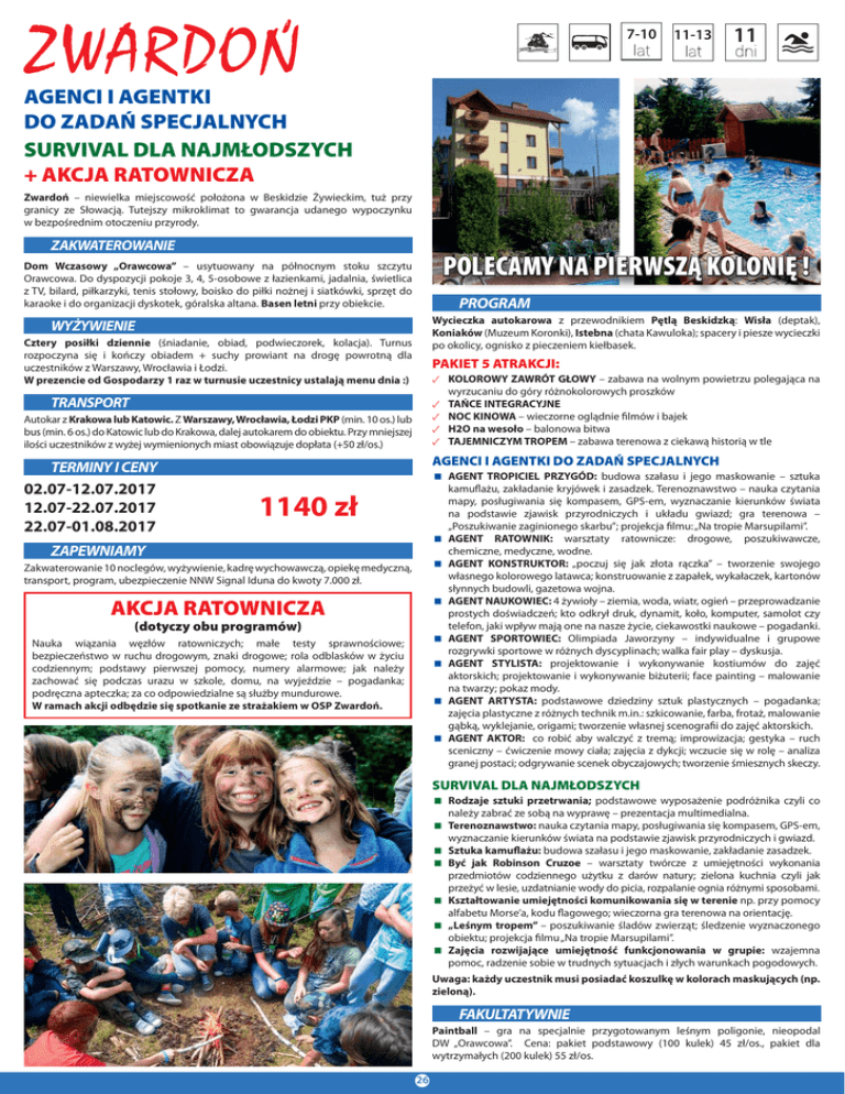 ZWARDON 7-10 11-13 11 AGENCI I AGENTKI DO ZADAŃ SPECJALNYCH SURVIVAL DLA NAJMŁODSZYCH + AKCJA RATOWNICZA Zwardoń – niewielka miejscowość położona w Beskidzie Żywieckim, tuż przy granicy ze Słowacją. Tutejszy mikroklimat to gwarancja udanego wypoczynku w bezpośrednim otoczeniu przyrody. ZAKWATEROWANIE POLECAMY NA PIERWSZĄ KOLONIĘ ! Dom Wczasowy „Orawcowa” – usytuowany na północnym stoku szczytu Orawcowa. Do dyspozycji pokoje 3, 4, 5-osobowe z łazienkami, jadalnia, świetlica z TV, bilard, piłkarzyki, tenis stołowy, boisko do piłki nożnej i siatkówki, sprzęt do karaoke i do organizacji dyskotek, góralska altana. Basen letni przy obiekcie. PROGRAM Wycieczka autokarowa z przewodnikiem Pętlą Beskidzką: Wisła (deptak), Koniaków (Muzeum Koronki), Istebna (chata Kawuloka); spacery i piesze wycieczki po okolicy, ognisko z pieczeniem kiełbasek. WYŻYWIENIE Cztery posiłki dziennie (śniadanie, obiad, podwieczorek, kolacja). Turnus rozpoczyna się i kończy obiadem + suchy prowiant na drogę powrotną dla uczestników z Warszawy, Wrocławia i Łodzi. W prezencie od Gospodarzy 1 raz w turnusie uczestnicy ustalają menu dnia :) PAKIET 5 ATRAKCJI: ✓ KOLOROWY ZAWRÓT GŁOWY – zabawa na wolnym powietrzu polegająca na wyrzucaniu do góry różnokolorowych proszków ✓ TAŃCE INTEGRACYJNE ✓ NOC KINOWA – wieczorne oglądnie filmów i bajek ✓ H2O na wesoło – balonowa bitwa ✓ TAJEMNICZYM TROPEM – zabawa terenowa z ciekawą historią w tle TRANSPORT Autokar z Krakowa lub Katowic. Z Warszawy, Wrocławia, Łodzi PKP (min. 10 os.) lub bus (min. 6 os.) do Katowic lub do Krakowa, dalej autokarem do obiektu. Przy mniejszej ilości uczestników z wyżej wymienionych miast obowiązuje dopłata (+50 zł/os.) TERMINY I CENY 02.07-12.07.2017 12.07-22.07.2017 22.07-01.08.2017 AGENCI I AGENTKI DO ZADAŃ SPECJALNYCH AGENT TROPICIEL PRZYGÓD: budowa szałasu i jego maskowanie – sztuka kamuflażu, zakładanie kryjówek i zasadzek. Terenoznawstwo – nauka czytania mapy, posługiwania się kompasem, GPS-em, wyznaczanie kierunków świata na podstawie zjawisk przyrodniczych i układu gwiazd; gra terenowa – „Poszukiwanie zaginionego skarbu”; projekcja filmu: „Na tropie Marsupilami”. AGENT RATOWNIK: warsztaty ratownicze: drogowe, poszukiwawcze, chemiczne, medyczne, wodne. AGENT KONSTRUKTOR: „poczuj się jak złota rączka” – tworzenie swojego własnego kolorowego latawca; konstruowanie z zapałek, wykałaczek, kartonów słynnych budowli, gazetowa wojna. AGENT NAUKOWIEC: 4 żywioły – ziemia, woda, wiatr, ogień – przeprowadzanie prostych doświadczeń; kto odkrył druk, dynamit, koło, komputer, samolot czy telefon, jaki wpływ mają one na nasze życie, ciekawostki naukowe – pogadanki. AGENT SPORTOWIEC: Olimpiada Jaworzyny – indywidualne i grupowe rozgrywki sportowe w różnych dyscyplinach; walka fair play – dyskusja. AGENT STYLISTA: projektowanie i wykonywanie kostiumów do zajęć aktorskich; projektowanie i wykonywanie biżuterii; face painting – malowanie na twarzy; pokaz mody. AGENT ARTYSTA: podstawowe dziedziny sztuk plastycznych – pogadanka; zajęcia plastyczne z różnych technik m.in.: szkicowanie, farba, frotaż, malowanie gąbką, wyklejanie, origami; tworzenie własnej scenografii do zajęć aktorskich. AGENT AKTOR: co robić aby walczyć z tremą; improwizacja; gestyka – ruch sceniczny – ćwiczenie mowy ciała; zajęcia z dykcji; wczucie się w rolę – analiza granej postaci; odgrywanie scenek obyczajowych; tworzenie śmiesznych skeczy. 1140 zł ZAPEWNIAMY Zakwaterowanie 10 noclegów, wyżywienie, kadrę wychowawczą, opiekę medyczną, transport, program, ubezpieczenie NNW Signal Iduna do kwoty 7.000 zł. AKCJA RATOWNICZA (dotyczy obu programów) Nauka wiązania węzłów ratowniczych; małe testy sprawnościowe; bezpieczeństwo w ruchu drogowym, znaki drogowe; rola odblasków w życiu codziennym; podstawy pierwszej pomocy, numery alarmowe; jak należy zachować się podczas urazu w szkole, domu, na wyjeździe – pogadanka; podręczna apteczka; za co odpowiedzialne są służby mundurowe. W ramach akcji odbędzie się spotkanie ze strażakiem w OSP Zwardoń. SURVIVAL DLA NAJMŁODSZYCH Rodzaje sztuki przetrwania; podstawowe wyposażenie podróżnika czyli co należy zabrać ze sobą na wyprawę – prezentacja multimedialna. Terenoznawstwo: nauka czytania mapy, posługiwania się kompasem, GPS-em, wyznaczanie kierunków świata na podstawie zjawisk przyrodniczych i gwiazd. Sztuka kamuflażu: budowa szałasu i jego maskowanie, zakładanie zasadzek. Być jak Robinson Cruzoe – warsztaty twórcze z umiejętności wykonania przedmiotów codziennego użytku z darów natury; zielona kuchnia czyli jak przeżyć w lesie, uzdatnianie wody do picia, rozpalanie ognia różnymi sposobami. Kształtowanie umiejętności komunikowania się w terenie np. przy pomocy alfabetu Morse’a, kodu flagowego; wieczorna gra terenowa na orientację. „Leśnym tropem” – poszukiwanie śladów zwierząt; śledzenie wyznaczonego obiektu; projekcja filmu „Na tropie Marsupilami”. Zajęcia rozwijające umiejętność funkcjonowania w grupie: wzajemna pomoc, radzenie sobie w trudnych sytuacjach i złych warunkach pogodowych. Uwaga: każdy uczestnik musi posiadać koszulkę w kolorach maskujących (np. zieloną). FAKULTATYWNIE Paintball – gra na specjalnie przygotowanym leśnym poligonie, nieopodal DW „Orawcowa”. Cena: pakiet podstawowy (100 kulek) 45 zł/os., pakiet dla wytrzymałych (200 kulek) 55 zł/os. 26
