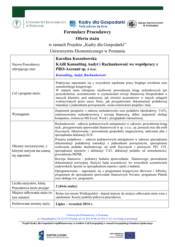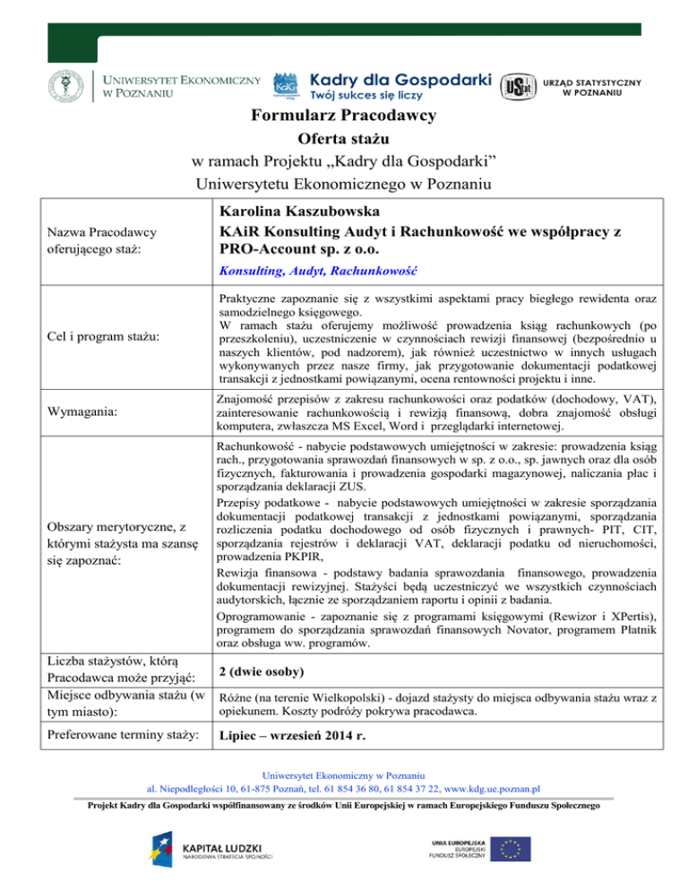 Formularz Pracodawcy Oferta stażu w ramach Projektu „Kadry dla Gospodarki” Uniwersytetu Ekonomicznego w Poznaniu Nazwa Pracodawcy oferującego staż: Karolina Kaszubowska KAiR Konsulting Audyt i Rachunkowość we współpracy z PRO-Account sp. z o.o. Konsulting, Audyt, Rachunkowość Cel i program stażu: Praktyczne zapoznanie się z wszystkimi aspektami pracy biegłego rewidenta oraz samodzielnego księgowego. W ramach stażu oferujemy możliwość prowadzenia ksiąg rachunkowych (po przeszkoleniu), uczestniczenie w czynnościach rewizji finansowej (bezpośrednio u naszych klientów, pod nadzorem), jak również uczestnictwo w innych usługach wykonywanych przez nasze firmy, jak przygotowanie dokumentacji podatkowej transakcji z jednostkami powiązanymi, ocena rentowności projektu i inne. Wymagania: Znajomość przepisów z zakresu rachunkowości oraz podatków (dochodowy, VAT), zainteresowanie rachunkowością i rewizją finansową, dobra znajomość obsługi komputera, zwłaszcza MS Excel, Word i przeglądarki internetowej. Obszary merytoryczne, z którymi stażysta ma szansę się zapoznać: Rachunkowość - nabycie podstawowych umiejętności w zakresie: prowadzenia ksiąg rach., przygotowania sprawozdań finansowych w sp. z o.o., sp. jawnych oraz dla osób fizycznych, fakturowania i prowadzenia gospodarki magazynowej, naliczania płac i sporządzania deklaracji ZUS. Przepisy podatkowe - nabycie podstawowych umiejętności w zakresie sporządzania dokumentacji podatkowej transakcji z jednostkami powiązanymi, sporządzania rozliczenia podatku dochodowego od osób fizycznych i prawnych- PIT, CIT, sporządzania rejestrów i deklaracji VAT, deklaracji podatku od nieruchomości, prowadzenia PKPIR, Rewizja finansowa - podstawy badania sprawozdania finansowego, prowadzenia dokumentacji rewizyjnej. Stażyści będą uczestniczyć we wszystkich czynnościach audytorskich, łącznie ze sporządzaniem raportu i opinii z badania. Oprogramowanie - zapoznanie się z programami księgowymi (Rewizor i XPertis), programem do sporządzania sprawozdań finansowych Novator, programem Płatnik oraz obsługa ww. programów. Liczba stażystów, którą Pracodawca może przyjąć: Miejsce odbywania stażu (w tym miasto): Preferowane terminy staży: 2 (dwie osoby) Różne (na terenie Wielkopolski) - dojazd stażysty do miejsca odbywania stażu wraz z opiekunem. Koszty podróży pokrywa pracodawca. Lipiec – wrzesień 2014 r. Uniwersytet Ekonomiczny w Poznaniu al. Niepodległości 10, 61-875 Poznań, tel. 61 854 36 80, 61 854 37 22, www.kdg.ue.poznan.pl Projekt Kadry dla Gospodarki współfinansowany ze środków Unii Europejskiej w ramach Europejskiego Funduszu Społecznego
