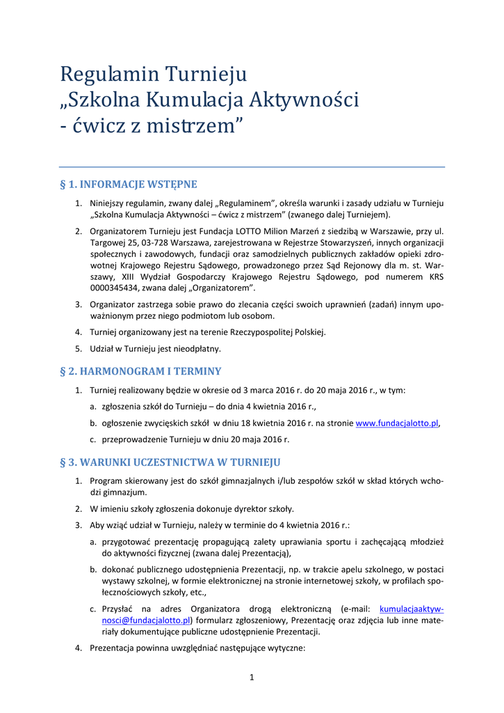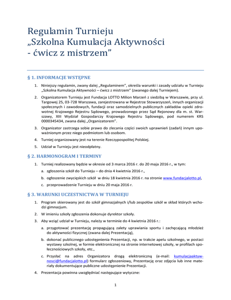 Regulamin Turnieju „Szkolna Kumulacja Aktywności - ćwicz z mistrzem” § 1. INFORMACJE WSTĘPNE 1. Niniejszy regulamin, zwany dalej „Regulaminem”, określa warunki i zasady udziału w Turnieju „Szkolna Kumulacja Aktywności – ćwicz z mistrzem” (zwanego dalej Turniejem). 2. Organizatorem Turnieju jest Fundacja LOTTO Milion Marzeń z siedzibą w Warszawie, przy ul. Targowej 25, 03-728 Warszawa, zarejestrowana w Rejestrze Stowarzyszeń, innych organizacji społecznych i zawodowych, fundacji oraz samodzielnych publicznych zakładów opieki zdrowotnej Krajowego Rejestru Sądowego, prowadzonego przez Sąd Rejonowy dla m. st. Warszawy, XIII Wydział Gospodarczy Krajowego Rejestru Sądowego, pod numerem KRS 0000345434, zwana dalej „Organizatorem”. 3. Organizator zastrzega sobie prawo do zlecania części swoich uprawnień (zadań) innym upoważnionym przez niego podmiotom lub osobom. 4. Turniej organizowany jest na terenie Rzeczypospolitej Polskiej. 5. Udział w Turnieju jest nieodpłatny. § 2. HARMONOGRAM I TERMINY 1. Turniej realizowany będzie w okresie od 3 marca 2016 r. do 20 maja 2016 r., w tym: a. zgłoszenia szkół do Turnieju – do dnia 4 kwietnia 2016 r., b. ogłoszenie zwycięskich szkół w dniu 18 kwietnia 2016 r. na stronie www.fundacjalotto.pl, c. przeprowadzenie Turnieju w dniu 20 maja 2016 r. § 3. WARUNKI UCZESTNICTWA W TURNIEJU 1. Program skierowany jest do szkół gimnazjalnych i/lub zespołów szkół w skład których wchodzi gimnazjum. 2. W imieniu szkoły zgłoszenia dokonuje dyrektor szkoły. 3. Aby wziąć udział w Turnieju, należy w terminie do 4 kwietnia 2016 r.: a. przygotować prezentację propagującą zalety uprawiania sportu i zachęcającą młodzież do aktywności fizycznej (zwana dalej Prezentacją), b. dokonać publicznego udostępnienia Prezentacji, np. w trakcie apelu szkolnego, w postaci wystawy szkolnej, w formie elektronicznej na stronie internetowej szkoły, w profilach społecznościowych szkoły, etc., c. Przysłać na adres Organizatora drogą elektroniczną (e-mail: [email protected]) formularz zgłoszeniowy, Prezentację oraz zdjęcia lub inne materiały dokumentujące publiczne udostępnienie Prezentacji. 4. Prezentacja powinna uwzględniać następujące wytyczne: 1 a. twórcami powinni być uczniowie, którzy mogą zaprosić do współpracy inne osoby, np. sportowców, lekarzy, pielęgniarki, rodziców, nauczycieli itp. b. forma Prezentacji jest dowolna, np. prezentacja multimedialna, komiks, fotoreportaż, film, etc. W przypadku gdy Prezentacja wykonana nie jest w formie elektronicznej tylko np. w formie tablic lub plansz, w zgłoszeniu do konkursu należy przesłać elektroniczne zdjęcia ww. materiałów, c. treść powinna zachęcać osoby mało aktywne fizycznie (np. unikające lekcji WF) do uprawiania sportu, pokazywać korzyści np. medyczne, psychologiczne, społeczne, emocjonalne etc. 5. Zgłoszenie do Turnieju szkoły poprzez wykonanie czynności, o których mowa w ust. 3, oznacza, że Zgłaszający: a. akceptuje warunki Regulaminu i zobowiązuje się do ich przestrzegania, b. oświadcza, że Prezentacja nie narusza praw osób trzecich, w szczególności praw autorskich oraz dóbr osobistych, c. wyraża zgodę na publikację Prezentacji przez Organizatora w Internecie, d. wyraża gotowość wzięcia udziału w Turnieju w dniu 20 maja 2016 r. w Warszawie. § 4. WYBÓR LAUREATÓW 1. Kapituła powołana przez Organizatora wybierze do 32 najciekawszych Prezentacji w oparciu o kryterium oryginalności, innowacyjności podejścia, ilości zaangażowanych osób oraz zgodności z założeniami Programu. 2. Obrady Kapituły odbędą się do 13 kwietnia 2016 r. 3. Wyniki obrad Kapituły zostaną opublikowane na stronie kumulacjaktywnosci.pl i fundacjalotto.pl w dniu 18 kwietnia 2016 r. 4. Nagrodą jest udział 20 uczniów (plus dwóch opiekunów) z każdej zwycięskiej Szkoły w Turnieju w dniu 20 maja 2016 r. Warszawie. 5. Zwycięskie Prezentacje zostaną opublikowane przez Organizatora w Internecie. 6. Decyzje Kapituły są ostateczne i nie podlegają procedurze odwoławczej. § 5. REALIZACJA NAGRODY – Turniej „Szkolna Kumulacja Aktywności – ćwicz z mistrzem” 1. Turniej odbędzie się w dniu 20 maja 2016 r. na terenie Toru Wyścigów Konnych Służewiec, ul. Puławska 266, Warszawa, w godzinach 10.00 – 16.00. 2. W Turnieju jako instruktorzy i sędziowie różnych dyscyplin sportowych wezmą udział mistrzowie sportu tj. olimpijczycy, medaliści zawodów o randze krajowej i międzynarodowej biorący udział w 3 edycji Kumulacji Aktywności (lista mistrzów na www.kumulacjaaktywnosci.pl). 3. Program Turnieju: a. biegi ze startu wspólnego dziewcząt i chłopców na 1 500 m i 2 500 m, b. uczestnictwo w ćwiczeniach fizycznych zaplanowanych do wykonywania na co najmniej 20 przygotowanych stanowiskach sportowych z różnych sportów, jak np.: badminton, gimnastyka, judo, koszykówka, łucznictwo, piłka nożna, siatkówka, rugby, strzelectwo, 2 szermierka, wioślarstwo i inne, oraz z rozwiązywania zadań logicznych i konkursu wiedzy o sporcie i olimpizmie. 4. Turniej będzie realizowany wg poniższego harmonogramu: a. b. c. d. e. f. rejestracja szkół i odbiór pakietów startowych – godz. 9.00 – 10.45, otwarcie imprezy – godz. 11.00 – 11.15, wspólna rozgrzewka prowadzona przez mistrza sportu – godz. 11.15 – 11.30, bieg na 1500 m dziewcząt i chłopców – godz. 11.30 – 11.50, bieg na 2 500 m dziewcząt i chłopców – godz. 11.50 – 12.20, rywalizacja drużynowa zespołów szkolnych w różnych dyscyplinach sportu oraz w rozwiązywaniu zadań logicznych i konkursach wiedzy o sporcie – godz. 11.30 – 15.00, g. ciepły posiłek regeneracyjny – godz. 12.00 – 15.00, h. ceremonia nagradzania najlepszych zawodników i drużyn – godz. 15.00 – 15.30, i. zakończenie imprezy – godz. 16.00. 5. Każdy uczestnik Turnieju otrzyma pakiet startowy zawierający koszulkę, numer startowy, chip,