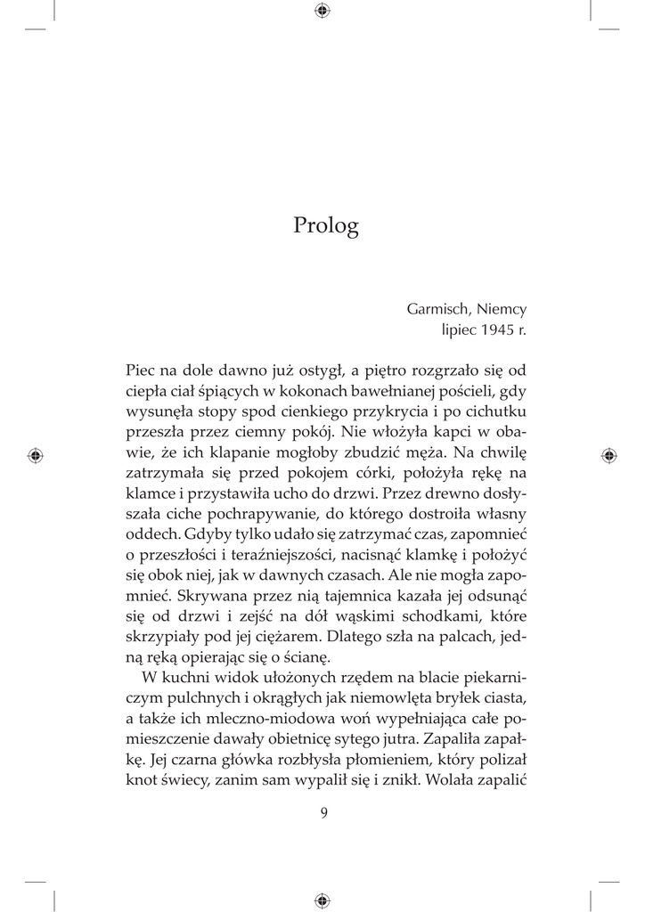 Prolog Garmisch, Niemcy lipiec 1945 r. Piec na dole dawno już ostygł, a piętro rozgrzało się od ciepła ciał śpiących w kokonach bawełnianej pościeli, gdy wysunęła stopy spod cienkiego przykrycia i po cichutku przeszła przez ciemny pokój. Nie włożyła kapci w obawie, że ich klapanie mogłoby zbudzić męża. Na chwilę zatrzymała się przed pokojem córki, położyła rękę na klamce i przystawiła ucho do drzwi. Przez drewno dosłyszała ciche pochrapywanie, do którego dostroiła własny oddech. Gdyby tylko udało się zatrzymać czas, zapomnieć o przeszłości i teraźniejszości, nacisnąć klamkę i położyć się obok niej, jak w dawnych czasach. Ale nie mogła zapomnieć. Skrywana przez nią tajemnica kazała jej odsunąć się od drzwi i zejść na dół wąskimi schodkami, które skrzypiały pod jej ciężarem. Dlatego szła na palcach, jedną ręką opierając się o ścianę. W kuchni widok ułożonych rzędem na blacie piekarniczym pulchnych i okrągłych jak niemowlęta bryłek ciasta, a także ich mleczno-miodowa woń wypełniająca całe pomieszczenie dawały obietnicę sytego jutra. Zapaliła zapałkę. Jej czarna główka rozbłysła płomieniem, który polizał knot świecy, zanim sam wypalił się i znikł. Wolała zapalić 9 świecę niż żarówkę u sufitu, tak jasną, że aż budziła grozę. Na ulicy przed domem spacerowali uzbrojeni żołnierze; nie mogła ryzykować, że wzbudzi ich ciekawość ani że obudzi swoją rodzinę. Uklękła pod blatem z rosnącymi bochnami chleba, odsunęła na bok pokryty sadzą garnek i pomacała w ciemności, chcąc znaleźć pęknięcie w desce podłogowej, gdzie ukryła nowy list. Zgrubiałymi od wałkowania ciasta dłońmi przesuwała po deskach, nie zwracając uwagi na wbijające się w skórę drzazgi. W głowie jej pulsowało, gorąco przeszywało całe ręce aż po czubki palców, zanim wyczuła i dosłyszała szelest papieru wsuniętego wcześniej w szczelinę. List przyszedł z codzienną pocztą; leżał między rachunkiem od młynarza a bardzo starym numerem „Signal Magazine” z wydartą okładką i stronami zalanymi tak, że stały się zupełnie nieczytelne, z wyjątkiem dobrze widocznej reklamy BMW, dumnie demonstrującej aluminiowy rower „nowoczesnego” cyklisty. Subtelny charakter pisma i staroświecka pieczęć wyróżniały się na tle reszty wyblakłych przesyłek. Rozpoznała list natychmiast i szybko wsunęła go do kieszeni swojej tradycyjnej bawarskiej sukienki, swojej dirndl, zanim mogłoby go dojrzeć czyjeś podejrzliwe oko. W domu mąż zawołał: ‒ Co nowego przyszło? ‒ Nic. Tylko do kupienia i do płacenia. – Podała mu czasopismo i rachunek. – Kupuj, kupuj i kupuj, ten świat się nigdy nie zatrzymuje. – Włożyła ręce do kieszeni, sprawdzając, czy list nadal tam jest. Mąż tylko mruknął i cisnął sfatygowane czasopismo do śmieci, po czym rozciął czubkiem noża kopertę z przesyłką od młynarza. Wyjął rachunek i trzymając go blisko oczu, zsumował wszystko w pamięci i pokiwał głową na potwierdzenie. 10 ‒ Dopóki on się kręci, człowiek budzi się co rano głodny. I dzięki Bogu za to. Inaczej bylibyśmy bez pracy, ja? ‒ Ja – powtórzyła. – Gdzie dzieci? ‒ Wyszły do swoich zajęć – odparł. Kiwnęła głową i wycofała się do pustej kuchni, żeby bezpiecznie schować list. I teraz, gdy na niebie wisiał już sierp księżyca, chudy jak rybia ość, przykucnęła nisko i postawiła świecę na podłodze. Wosk pieczęci ułamał się już wcześniej pod dotykiem, a jego okruszki spadły na kafelki. Ostrożnie zgarnęła je na podstawkę płonącej świecy. Rozwinęła kartkę i czytała dobrze znane pismo. W miarę jak przygniatające słowa układały się w zdania, jej ręce coraz bardziej się trzęsły, oddech przyspieszał, aż musiała zakryć usta dłonią, żeby nie było słychać. Płomień świecy zadrżał i wygiął się. W jego centrum pulsowała błękitna żyłka. Coś poruszyło powietrze. Zastygła w bezruchu na ziemi, nasłuchując cichego szmeru po drugiej stronie kuchni. Mysz, modliła się w duchu. Albo wałęsający się pies węszy pod drzwiami kuchennymi. Powiew alpejskiego wiatru albo przelatujący duch. Wszystko, tylko nie człowiek. Nie mogła zostać przyłapana z tym listem w ręku. Wsunęła się głębiej pod blat stołu, zgniatając kartkę na podołku i obejmując żelazny garnek, wciąż zalatujący duszoną w nim wczoraj cebulą. Czekała, aż płomień wyprostuje się i ustabilizuje. Wpatrywała się tak mocno, że aż zapiekły ją oczy. Zamknęła je, by dać im wytchnienie, i ujrzała sceny jak na starych fotografiach: dziewczynki z dopasowanymi kokardami na końcach warkoczy siedzące pod drzewkiem owocowym; chłopiec o kończynach tak chudych, że przypominały zgięte wiatrem trzciny na brzegu rzeki; mężczyzna ze szpetną twarzą jedzący czekoladę, która sączyła mu się z otworu na piersiach; kobieta tańcząca na 11 ognisku i niezajmująca się ogniem; tłumy dzieci zjadających góry pieczywa. Gdy otworzyła oczy, płomień już się nie palił. Czerń nocy przechodziła w błękit pruski. Zasnęła w swojej kryjówce. Ale nadchodził poranek i już tu nie była bezpieczna. Wyczołgała się, czując strzykanie i ból w kościach. List wzięła ze sobą, ukryty w fałdach cienkiej koszuli nocnej. Po raz drugi na palcach pokonała schody, minęła pokój córki, weszła do sypialni i wśliznęła się do łóżka. Mąż spał jak zabity. Powoli i bardzo ostrożnie sięgnęła do boku łóżka i schowała list pod materac, po czym położyła dłoń na piersiach. W sercu poczuła obcość, jakby tam w środku pompatycznie uderzało cudze serce, podczas gdy reszta ciała spoczywała zimna i drętwa. Zegar na stoliku przy łóżku tykał „tik-tik-tik”, bez odgłosu „tak” poruszającego się wahadła. Równowagi tego swoistego pulsu dopełniało bicie jej serca. Jak w rytm me
