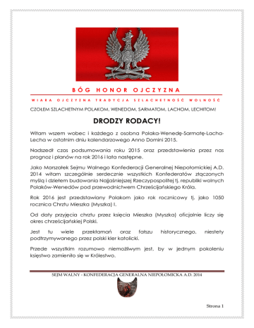 BÓG W I A R A O J C Z Y Z N A HONOR OJCZYZNA T R A D Y C J A S Z L A C H E T N O Ś Ć W O L N O Ś Ć CZOŁEM SZLACHETNYM POLAKOM, WENEDOM, SARMATOM, LACHOM, LECHITOM! DRODZY RODACY! Witam wszem wobec i każdego z osobna Polaka-Wenedę-Sarmatę-LachaLecha w ostatnim dniu kalendarzowego Anno Domini 2015. Nadszedł czas podsumowania roku 2015 oraz przedstawienia przez nas prognoz i planów na rok 2016 i lata następne. Jako Marszałek Sejmu Walnego Konfederacji Generalnej Niepołomickiej A.D. 2014 witam szczególnie serdecznie wszystkich Konfederatów złączonych myślą i dziełem budowania Najjaśniejszej Rzeczypospolitej tj. republiki wolnych Polaków-Wenedów pod przewodnictwem Chrześcijańskiego Króla. Rok 2016 jest przedstawiany Polakom jako rok rocznicowy tj. jako 1050 rocznica Chrztu Mieszka (Myszka) I. Od daty przyjęcia chrztu przez księcia Mieszka (Myszka) oficjalnie liczy się okres chrześcijańskiej Polski. Jest tu wiele przekłamań oraz fałszu podtrzymywanego przez polski kler katolicki. historycznego, niestety Przede wszystkim rozumowo niemożliwym jest, by w jednym pokoleniu księstwo zamieniło się w Królestwo. SEJM WALNY - KONFEDERACJA GENERALNA NIEPOŁOMICKA A.D. 2014 Strona 1 To z kolei zmusza nas nad pochyleniem się nad tym KIM BYŁA DOBRAWA – żona Mieszka (Myszka) - matka chrzestna Polski? W polskiej historiografii przyjmuje się, że Dobrawa była Przemyślidką czyli z rodu legendarnego Przemysła męża Lubuszy. Oficjalnie niby nic nie wiemy o Jej matce, co jest kuriozalne, bo jak wyjaśnić brak wiedzy na temat żony ojca Dobrawy tj. Króla Czech Bolesława I? Ta luka historyczna nie jest przypadkowa, bowiem żoną Bolesława I, a matką Dobrawy była prawdopodobnie córka Króla Wenedów (Obotrytów) - Tęgomira prawdopodobnie o imieniu Drogomira (nie mylić z Drohimirą). Problem w tym, że Król Wenedów Tęgomir z siedzibą w Brennej (dzisiejszym Berlinie) był Królem chrześcijańskim już na początku X wieku i był prawdopodobnie jednym z ojców chrzestnych (wówczas było kilkoro chrzestnych) Mieszka (Myszka) I. Tym samym Dobrawa nie jest z dynastii czeskiej Przemyślidów ale po kądzieli jest z dynastii (rodu) Wenedów (Obotrytów) – protoplastów Polaków. Logiczne też, że Król - dziadek Dobrawy postawił jako warunek ślubu wnuczki z innowiercem Mieszkiem (Myszkiem) – księciem Goplan, Polan i Mazowszan przyjęcie przez niego wiary chrześcijańskiej i aby być pewnym konwersji Mieszka (Myszka) na chrześcijaństwo, sam postanowił być jednym z ojców chrzestnych Mieszka (Myszka) I. Dlaczego Mieszko (Myszko) został wybrańcem Dobrawy? Prawdopodobnie dlatego aby odzyskać Brenną i Wolin oraz umocnić tam chrześcijańskich Wenedów, którzy zostali w międzyczasie zepchnięci z terenów dzisiejszej Meklemburgii i Brandenburgii do Czech i na Wielkie Morawy. Mieszko (Myszko) I był sprawnym wodzem – wojem – wojownikiem. Był Wenedą rządzącym Ziemiami Goplan, Polan i Mazowszan. Jego ojcem był Siemomysł, a matką księżniczka Pomorska (Wenedyjska). Tak więc prawidłową dynastią Mieszka (Myszka) i Dobrawy jest dynastia Wieniawitów – Wenedów, a chrzest królewskiej Polski należałoby przesunąć o kilkadziesiąt, jak nie o kilkaset lat wstecz. SEJM WALNY - KONFEDERACJA GENERALNA NIEPOŁOMICKA A.D. 2014 Strona 2 Najwięcej fałszu historycznego dokonują pseudo naukowcy będący na jurgielcie niemieckim. Fałszu historycznego dokonuje też kler katolicki fałszując datację królewskości Polski, przesuwając ją do czasów Chrobrego, podczas gdy Królowie Polscy są notowani już w 550 roku! Czas Panowie profesorowie odkłamać historię Polski – Wenedów! Czas hierarchowie kościoła przyznać, że chrześcijaństwo w Polsce istniało przez Mieszkiem (Myszkiem) I, szczególnie na Ziemi Śląskiej i Małopolskiej, a przede wszystkim na Ziemi Połabskiej – dzisiejszej Meklemburgii i Brandenburgii oraz Łużyc (dzisiejszej Saksonii). Czas otworzyć oczy Polakom i powiedzieć od kiedy Niemcy znaleźli się po drugiej strony Łaby i kto tam zamieszkiwał wcześniej? Czas powiedzieć prawdę Polakom, że dzisiejszy Berlin to siedziba polskich Królów – Brenna. Czas wyjaśnić Polakom, czy miasto Brest we francuskiej Bretanii ma związek z Brześciem nad Bugiem? Czas wyjaśnić, czy włoska prowincja Veneto z Wenecją ma związek z Wenetami-Wenedami? Nie dziwi, więc, że ja, jako Polak – Weneda – Sarmata – Lach – Lech zwołałem na Ziemiach Korony Polskiej Konfederację Generalną Niepołomicką A.D. 2014, aby sprzeciwić się antypolskiej okupacyjnej władzy III RP, a tak naprawdę II PRL. Rodacy! Polacy! Wenedowie! Przystępujcie do naszej Konfederacji! Budujmy wspólnie republikę wolnych Polaków – Wenedów z chrześcijańskim Królem. W październiku 2015 roku na Sejmie Walnym w Niepołomicach intronizowaliśmy Jezusa Chrystusa jako Króla Wrzechświata i Króla Polski. Od tego czasu patronuje nam Jezus Mesjasz, a skoro Bóg z nami to kto przeciwko nam? W Polsce A.D. 2015, mimo zmiany Prezydenta z Bronisława Komorowskiego na Andrzeja Dudę i mimo zmiany rządzących partii tj. „Platformy Obywatelskiej” i „Polskiego Stronnictwa Ludowego” na „Prawo i Sprawiedliwość” mamy ustrój narzucony nam w 1918 i 1944 roku odpowiednio przez francuskich neojakobinów-masonów i chazarskich Żydów i sowieckich bolszewików tj. SEJM WALNY - KONFEDERACJA GENERALNA NIEPOŁOMICKA A.D. 2014 Strona 3 mamy republikę demo[no]kratyczną z partiami organizacjami żydomasońskimi – satanistycznymi. politycznymi czyli Wartość tego ustroju, tej swoistej „monety” przez jej odwrócenie z awersu na rewers nie uległa w najmniejszym stopniu zmianie w 2015 roku. Wartość ta Jest dokładnie taka sama, a nawet niższa niż w 2014 roku, bo co rok ta „moneta” ulega dewaluacji. Dwie rewolucje masońskie tj. rewolucja antyfrancuska roku 1789 i rewolucja antyrosyjska roku 1917 sieją spustoszenie cywilizacyjn