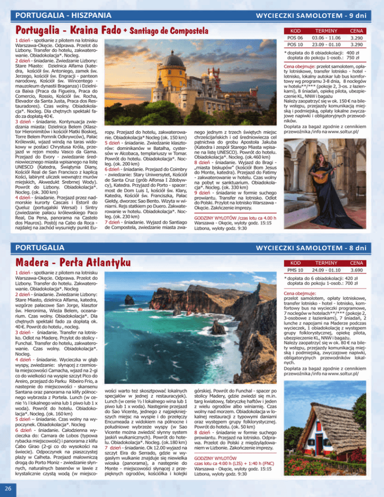 PORTUGALIA - HISZPANIA WYCIECZKI SAMOLOTEM - 9 dni P o r t u g a l i a K r a i n a F a d o +S a n t i a g o d e C o m p o s t e l a 1 dzieñ - spotkanie z pilotem na lotnisku Warszawa-Okêcie. Odprawa. Przelot do Lizbony. Transfer do hotelu, zakwaterowanie. Obiadokolacja*. Nocleg. 2 dzieñ - œniadanie. Zwiedzanie Lizbony: Stare Miasto: Dzielnica Alfama (katedra, koœció³ œw. Antoniego, zamek œw. Jerzego, koœció³ œw. Engracji - panteon narodowy, Koœció³ œw. Wincentego mauzoleum dynastii Braganza) i Dzielnica Baixa (Praca da Figueira, Praca do Comercio, Rossio, Koœció³ œw. Rocha, Elevador da Santa Justa, Praca dos Restauradores). Czas wolny. Obiadokolacja*. Nocleg. Dla chêtnych spektakl fado za dop³at¹ 40 €. 3 dzieñ - œniadanie. Kontynuacja zwiedzania miasta: Dzielnica Belem (Klasztor Hieronimitów i koœció³ Matki Boskiej, Torre Belem Pomnik Odkrywców), Pa³ac Królewski, wjazd wind¹ na taras widokowy w postaci Chrystusa Króla, przejazd w rejon mostu Vasco da Gama. Przejazd do Evory - zwiedzanie œredniowiecznego miasta wpisanego na listê UNESCO (Katedra, Œwi¹tynia Diany, Koœció³ Real de San Francisco z kaplic¹ Koœci, labirynt uliczek wewn¹trz murów miejskich, Akwedukt Srebrnej Wody). Powrót do Lizbony. Obiadokolacja*. Nocleg. (ok. 300 km) 4 dzieñ - œniadanie. Przejazd przez nadmorskie kurorty Cascais i Estoril do Queluz (portugalski Wersal) i Sintry (zwiedzanie pa³acu królewskiego Paco Real, Da Pena, panorama na Castelo dos Mauros). Postój na Cabo da Roca najdalej na zachód wysuniêty punkt Europy ropy. Przejazd do hotelu, zakwaterowanie. Obiadokolacja* Nocleg (ok. 150 km) 5 dzieñ - œniadanie. Zwiedzanie klasztorów: dominikanów w Batalha, cystersów w Alcobaca, templariuszy w Tomar. Powrót do hotelu. Obiadokolacja*. Nocleg. (ok. 200 km) 6 dzieñ - œniadanie. Przejazd do Coimbry - zwiedzanie: Stary Uniwersytet, Koœció³ de Santa Cruz (grób Alfonsa I Zdobywcy), Katedra. Przyjazd do Porto - spacer: most de Dom Luis I, koœció³ œw. Klary, Katedra, Koœció³ œw. Franciszka, Pa³ac Gie³dy, dworzec Sao Bento. Wizyta w winiarni. Rejs statkiem po Duero. Zakwaterowanie w hotelu. Obiadokolacja*. Nocleg. (ok. 230 km) 7 dzieñ - œniadanie. Wyjazd do Santiago de Compostela, zwiedzanie miasta zwanego nego jednym z trzech œwiêtych miejsc chrzeœcijañskich i od œredniowiecza cel p¹tnictwa do grobu Aposto³a Jakuba (Katedra i zespó³ Starego Miasta wpisane na listê UNESCO). Powrót do hotelu. Obiadokolacja*. Nocleg. (ok.460 km) 8 dzieñ - œniadanie. Wyjazd do Bragi „miasta biskupów” (koœció³ Bom Jesus do Monte, katedra). Przejazd do Fatimy - zakwaterowanie w hotelu. Czas wolny na pobyt w sanktuarium. Obiadokolacja*. Nocleg. (ok. 330 km) 9 dzieñ - œniadanie w formie suchego prowiantu. Transfer na lotnisko. Odlot do Polski. Przylot na lotnisko Warszawa Okêcie. Zakñczenie imprezy. CENA 3.290 3.290 Cena obejmuje: przelot samolotem, op³aty lotniskowe, transfer lotnisko - hotel lotnisko, lokalny autokar lub bus komfortowy wg programu 3-8 dnia, 8 noclegów w hotelu**/*** (pokoje 2, 3-os. z ³azienkami), 8 œniadañ, opiekê pilota, ubezpieczenie KL, NNW i baga¿u Nale¿y zaopatrzyæ siê w ok. 150 € na bilety wstêpu, przejazdy komunikacj¹ miejsk¹ i podmiejsk¹, op³aty lokalne zwyczajowe napiwki i obligatoryjnych przewodników. Dop³ata za baga¿ zgodnie z cennikiem przewoŸnika /info na www.soltur.pl/ GODZINY WYLOTÓW /czas lotu ca 4.00 h Warszawa - Okêcie, wyloty godz. 15:15 Lizbona, wyloty godz. 9:30 WYCIECZKI SAMOLOTEM - 8 dni M a d e r a P e r ła A t l a n t y k u 26 TERMINY 03.06 - 11.06 23.09 - 01.10 * dop³ata do 8 obiadokolacji: 400 z³ dop³ata do pokoju 1-osob.: 750 z³ PORTUGALIA 1 dzieñ - spotkanie z pilotem na lotnisku Warszawa-Okêcie. Odprawa. Przelot do Lizbony. Transfer do hotelu. Zakwaterowanie. Obiadokolacja*. Nocleg 2 dzieñ - œniadanie. Zwiedzanie Lizbony: Stare Miasto, dzielnica Alfama, katedra, wzgórze pa³acowe San Jorge, klasztor œw. Hieronima, Wie¿a Belem, oceanarium. Czas wolny. Obiadokolacja*. Dla chêtnych spektakl fado za dop³at¹ ok. 40 €. Powrót do hotelu , nocleg. 3 dzieñ - œniadanie. Transfer na lotnisko. Odlot na Maderê. Przylot do stolicy Funchal. Transfer do hotelu, zakwaterowanie. Czas wolny. Obiadokolacja*. Nocleg. 4 dzieñ - œniadanie. Wycieczka w g³¹b wyspy, zwiedzanie: s³yn¹cej z rzemios³a miejscowoœci Camacha, wjazd na 2-gi co do wielkoúci na wyspie szczyt Pico do Areiro, przejazd do Parku Ribeiro Frio, a nastepnie do miejscowoúci - skansenu Santana oraz panorama na klify póùnocnego wybrzeýa z Portela. Lunch (w cenie ½ l lokalnego wina lub 1 piwo lub 1 x woda). Powrót do hotelu. Obiadokolacja*. Nocleg. (ok. 160 km) 5 dzieñ – œniadanie. Czas wolny na wypoczynek. Obiadokolacja*. Nocleg 6 dzieñ - œniadanie. Ca³odzienna wycieczka do: Camara de Lobos (typowa rybacka miejscowoœæ) i panorama z klifu Cabo Girao (2-gi co do wysokoœci na œwiecie). Odpoczynek na piaszczystej pla¿y w Calheta. Przejazd malownicz¹ drog¹ do Porto Moniz - zwiedzanie s³ynnych, naturalnych basenów w lawie z krystalicznie czyst¹ wod¹ (w miejscowoœci KOD POS 06 POS 10 KOD TERMINY CENA PMS 10 24.09 - 01.10 3.690 * dop³ata do 6 obiadokolacji: 420 z³ dop³ata do pokoju 1-osob.: 700 z³ Cena obejmuje: przelot samolotem, op³aty lotniskowe, transfer lotnisko - hotel - lotnisko, komfortowy bus na wycieczki programowe, 7 noclegów w hotelach**/*** (pokoje 2, 3-osobowe z ³azienkami), 7 œniadañ, 2 lunche z napojami na Maderze podczas wycieczek, 1 obiadokolacjê z wystêpem grupy folklorystycznej, opiekê pilota, ubezpieczenie KL, NNW i baga¿u. Nale¿y zaopatrzyæ siê w ok. 80 € na bilety wstêpu, przejazdy komunikacj¹ miejsk¹ i podmiejsk¹, zwyczajowe napiwki, obligatoryjnych przewodników lokalnych. Dop³ata za baga¿ zgodnie z cennikiem przewoŸnika /info na www.soltur.pl/ . woœci warto te¿ skosztpowaæ lokalnych specja³ów w jednej z restauracyjek). Lunch (w cenie 