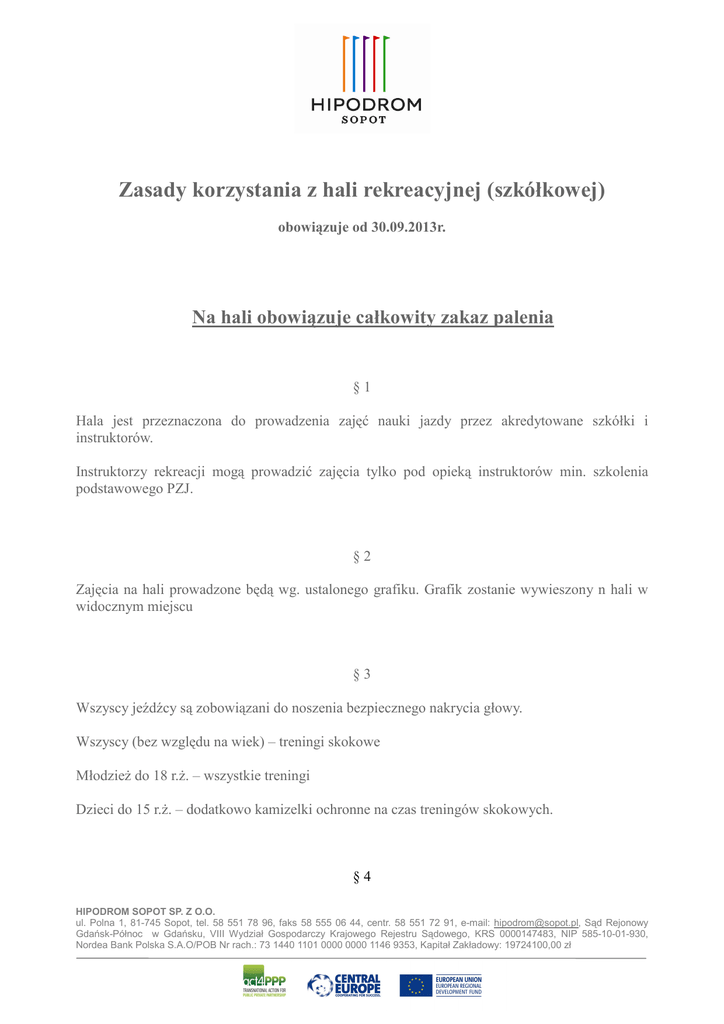Zasady korzystania z hali rekreacyjnej (szkółkowej) obowiązuje od 30.09.2013r. Na hali obowiązuje całkowity zakaz palenia §1 Hala jest przeznaczona do prowadzenia zajęć nauki jazdy przez akredytowane szkółki i instruktorów. Instruktorzy rekreacji mogą prowadzić zajęcia tylko pod opieką instruktorów min. szkolenia podstawowego PZJ. §2 Zajęcia na hali prowadzone będą wg. ustalonego grafiku. Grafik zostanie wywieszony n hali w widocznym miejscu §3 Wszyscy jeźdźcy są zobowiązani do noszenia bezpiecznego nakrycia głowy. Wszyscy (bez względu na wiek) – treningi skokowe Młodzież do 18 r.ż. – wszystkie treningi Dzieci do 15 r.ż. – dodatkowo kamizelki ochronne na czas treningów skokowych. §4 HIPODROM SOPOT SP. Z O.O. ul. Polna 1, 81-745 Sopot, tel. 58 551 78 96, faks 58 555 06 44, centr. 58 551 72 91, e-mail: [email protected], Sąd Rejonowy Gdańsk-Północ w Gdańsku, VIII Wydział Gospodarczy Krajowego Rejestru Sądowego, KRS 0000147483, NIP 585-10-01-930, Nordea Bank Polska S.A.O/POB Nr rach.: 73 1440 1101 0000 0000 1146 9353, Kapitał Zakładowy: 19724100,00 zł Prowadzący treningi odpowiadają za bezpieczeństwo jeźdźców oraz ich odpowiedni strój w czasie jazdy. §5 Każdorazowo po zakończeniu treningu należy posprzątać używane przez siebie elementy (przeszkody, drągi, czworobok itp.) i złożyć je w miejscu do tego wyznaczonym. §6 Stępowanie, przejścia do stępa i zatrzymywanie na ścianie ujeżdżalni jest zabronione jeśli na ujeżdżalni jest wiele koni. §7 Zabronione jest na hali stępowanie parami lub w większej liczbie koni obok siebie. §8 Na hali, przy jeździe w różnych kierunkach jeźdźcy wymijają się zawsze lewą stroną. Na halach ustala się następujące pierwszeństwo: jeźdźcy poruszający się na lewą rękę, jeźdźcy jadący wyższym chodem, jeźdźcy poruszający się po ścieżce wzdłuż ściany ujeżdżalni przed jeźdźcami wykonującymi inne figury; jeźdźcy pracujący na kole lub wolcie pozostawiają linię ścieżki wzdłuż ścian ujeżdżalni wolną dla innych jeźdźców poruszających się po niej. §9 Nakazuje się przerwać wszelkie ćwiczenia, jeśli na ujeżdżalni znajduje się koń bez jeźdźca. Ćwiczenia mogą być wznowione, gdy koń zostanie złapany. § 10 Nakazuje się oznakować czerwoną wstążką konie kopiące lub gryzące. § 11 Zabrania się lonżowania oraz wypuszczania luzem koni na dużej hali. Jedyna hala służąca lonżowaniu to „Stodoła”, na którą również można wypuszczać konie luzem POD STAŁĄ OPEKĄ. Wewnątrz hal mogą przebywać konie tylko pod opieką instruktora. § 12 Wchodząc na kryte ujeżdżalnie należy powiedzieć głośno ( UWAGA WCHODZĘ ). § 13 Przed wyprowadzeniem konia z ujeżdżalni należy koniom wyczyścić kopyta. § 14 Na czas konsultacji, klinik, szkoleń, zawodów i przygotowań do nich hala może zostać udostępniona do użytkowania pozostałym pensjonariuszom, w godzinach ustalonych z prowadzącymi zajęcia szkółkowe. § 15 Prowadzący zajęcia szkółkowe dbają o porządek i natychmiastowe usuwanie końskich odchodów. § 16 Psy można wprowadzać na halę tylko na smyczy.