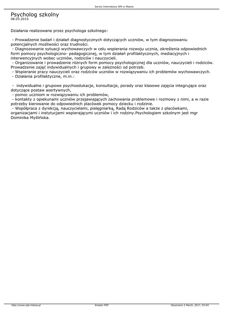 Serwis Internetowy SP6 w Mławie Psycholog szkolny 08.03.2015. Działania realizowane przez psychologa szkolnego: - Prowadzenie badań i działań diagnostycznych dotyczących uczniów, w tym diagnozowaniu potencjalnych możliwości oraz trudności. - Diagnozowanie sytuacji wychowawczych w celu wspierania rozwoju ucznia, określenia odpowiednich form pomocy psychologiczno- pedagogicznej, w tym działań profilaktycznych, mediacyjnych i interwencyjnych wobec uczniów, rodziców i nauczycieli. - Organizowanie i prowadzenie różnych form pomocy psychologicznej dla uczniów, nauczycieli i rodziców. Prowadzenie zajęć indywidualnych i grupowy w zależności od potrzeb. - Wspieranie pracy nauczycieli oraz rodziców uczniów w rozwiązywaniu ich problemów wychowawczych. - Działania profilaktyczne, m.in.: - indywidualne i grupowe psychoedukacje, konsultacje, porady oraz klasowe zajęcia integrujące oraz dotyczące postaw asertywnych, - pomoc uczniom w rozwiązywaniu ich problemów, - kontakty z opiekunami uczniów przejawiających zachowania problemowe i rozmowy z nimi, a w razie potrzeby kierowanie do odpowiednich placówek pomocy dziecku i rodzinie. - Współpraca z dyrekcją, nauczycielami, pielęgniarką, Radą Rodziców a także z placówkami, organizacjami i instytucjami wspierającymi uczniów i ich rodziny.Psychologiem szkolnym jest mgr Dominika Myślińska. http://www.sp6.mlawa.pl Kreator PDF Utworzono 2 March, 2017, 03:04