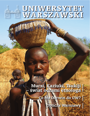 UNIWERSYTET WA R S Z AW S K I PISMO UCZELNI ISSN 1640-2758 NR 2 (41) KWIECIEN 2009 Mursi, Kaziuki, Tsukiji – świat oczami etnologa Co ma Darwin do UW? Oblicza Warszawy Ogród Botaniczny UW zaprasza po zimowej przerwie Od 12 kwietnia Ogród Botaniczny Uniwersytetu Warszawskiego (Aleje Ujazdowskie 4) jest znów otwarty dla zwiedzających. Już wkrótce rozpocznie się tegoroczny cykl Spotkań z Przyrodą, organizowanych w ogrodzie: 16 maja otwarta zostanie Wystawa Roślin Mięsożernych, zaś w połowie czerwca czeka nas Wystawa Kaktusów. Dla pracowników oraz studentów UW wstęp do ogrodu jest wolny. Więcej na stronie: www.ogrod.uw.edu.pl. W N U M E R Z E W YD AR ZE N I A n n Kalejdoskop . . . . . . . . . . . . . . . . . . . . . . . . . . . . . . . . Nominacje profesorskie . . . . . . . . . . . . . . . . . . . . . . . . . 2 9 STUDIA n Edukacja otwarta Katarzyna Łukaszewska . . . . . . . . . . . . . . . 10 2 ROK KAROLA DARWINA n Co ma Darwin do Uniwersytetu Warszawskiego? Jerzy Dzik . . . . . 11 B AD AN I A n n n n n n n n n Cyfrowa mapa granicy Moho Anna Korzekwa . . . . . . . . . . Oblicza miasta Katarzyna Łukaszewska . . . . . . . . . . . . . . Afrykanie w Polsce. Widoczni czy niewidoczni? Elżbieta Budakowska . . . . . . . . . . . . . . . . . . . . . . . . Ryby, rynki i globalne przepływy Jerzy S. Wasilewski . . . . . . Mursi i ich kra˛żki wargowe Maciej Za˛bek . . . . . . . . . . . . . Od Kaziuków do Werbowej Niedzieli Lech Mróz . . . . . . . . . Narracje historyczne w postkolonialnej Syberii Łukasz Smyrski . „Ludowe” wyobrażenia o władzy, państwie i demokracji Anna Malewska-Szałygin . . . . . . . . . . . . . . . . . . . . . . Równaniem w tornado Justyna Jasiewicz-Hall . . . . . . . . . . . . . . . . . . . . . . . . . . . . . . . . . . . . . . 13 14 11 16 17 20 22 24 26 28 20 KU LT U RA n Współczesna kultura a długowieczność produktów Anna Szalast . . . . . . . . . . . . . . . . . . . . . . . . . . . . . . . . 29 STUDENCKI G £OS n n Wykopaliska w głe˛binach Morza Gościnnego Aleksandra Górska . . . Pankisi – dlaczego tam? Magdalena Wnuk . . . . . . . . . . . . . . . 31 32 22 VARIA n n Pisanki sercu miłe – z prof. Irena˛ Stasiewicz-Jasiukowa˛ rozmawia Justyna Jasiewicz-Hall . . . . . . . . . . . . . . . . . . . . . . . . . . Przegla˛d prasy . . . . . . . . . . . . . . . . . . . . . . . . . . . . . . 34 35 29 DZIEJE UW n n n Studenckie Koło Naukowe Historyków Paweł Tyszka . . . . . . . . . . SKNH dawniej o pare˛ pokoleń Marcin Kula . . . . . . . . . . . . . . . Poczet rektorów Robert Gawkowski . . . . . . . . . . . . . . . . . . . 35 37 38 RSUM . . . . . . . . . . . . . . . . . . . . . . . . . . . . . . . . . . . 39 ODESZLI . . . . . . . . . . . . . . . . . . . . . . . . . . . . . . . . . . . 40 34 Uniwersytet Warszawski Kwiecieæ 2009 1 W Y D A R Kalejdoskop Nauka i szkolnictwo wy¿sze Strategia rozwoju szkolnictwa wy¿szego n Pod koniec stycznia Ministerstwo Nauki i Szkolnictwa Wy¿szego og‡osi‡o przetarg na opracowanie ÐStrategii rozwoju szkolnictwa wy¿szego do roku 2020. Okre"laj„c jednak warunki przetargu (punkt II.2.3 Zdolno techniczna i IV.1.2 Ograniczenie liczby wykonawcw), praktycznie uniemo¿liwi‡o wziŒcie w nim udzia‡u szko‡om wy¿szym i ich konsorcjom ( instytucjom, kt)re od miesiŒcy pracowa‡y nad przygotowaniem dokumentu. Konferencje Rektor)w Akademickich Szk)‡ Polskich i Zawodowych Szk)‡ Polskich oraz Fundacja Rektor)w Polskich wys‡a‡y wiŒc do ministerstwa wsp)lne stanowisko w tej sprawie, wraz z sugesti„ wprowadzenia zmian w warunkach przetargowych. W odpowiedzi, kt)r„ otrzyma‡a po miesi„cu prof. Katarzyna Cha‡asiæska-Macukow, rektor UW i przewodnicz„ca KRASP czytamy: Ðwszelkie protesty dotycz„ce w/w zam)wienia mog„ by6 zg‡oszone tylko w ramach tocz„cej siŒ procedury zam)wienia publicznego. Poniewa¿ w/w Stanowisko ma charakter informacyjny (...) nie mo¿na go potraktowa6, jako prawid‡owo z‡o¿onego protestu. W po‡owie marca do KRASP dotar‡ kolejny, mniej Ðautomatyczny list z ministerstwa. Wynika z niego jednak, ¿e resort nie planuje w tej sprawie ¿adnych zmian, a uk‡on wobec "rodowiska naukowego zredukowa‡ do zaproszenia przedstawiciela naukowc)w do udzia‡u w dialogu z oferentami, wy‡onionymi w drodze przetargu. Uniwersytet na 5+ Od maja do wrze"nia 2008 r. studenci UW mieli mo¿liwo"6 wziŒcia udzia‡u w og)lnouniwersyteckim badaniu ankietowym na temat jako"ci kszta‡cenia na uczelni. Pod koniec stycznia tego roku wyniki badania zosta‡y zaprezentowane senatorom UW, a p)z·niej tak¿e dziennikarzom. W ankiecie przygotowanej przez PracowniŒ Jako"ci Kszta‡cenia znalaz‡y siŒ pytania dotycz„ce infrastruktury uniwersytetu, funkcjonowania systemu USOS oraz warunk)w zapis)w na zajŒcia og)lnouniwersyteckie. Studenci oceniali tak¿e m.in. programy studi)w oraz kwestiŒ przestrzegania praw studenckich. Autor)w badania zaskoczy‡o zainteresowanie, z jakim ankieta zosta‡a przyjŒta przez student)w. ( Zamierzali"my og‡osi6 sukces, je"li ankietŒ wype‡ni 10 proc. student)w ( m)wi‡ na konferencji prasowej dr Miko‡aj Jasiæski z PJK, jeden z autor)w badania. W badaniu wziŒ‡o udzia‡ ponad 13 tys. student)w, czyli 30 procent studiuj„cych. ( To pokazuje jak, wa¿na jest dla student)w uczelnia i jak zale¿y im na jej udoskonalaniu ( t‡umaczy‡ dziennikarzom. W skali od 1 do 7 og)lny poziom zadowolenia student)w z jako"ci kszta‡cenia na uczelni wynosi trochŒ powy¿ej 5. Studenci s„ zadowoleni z zajŒ6 i swoich studi)w. Bardzo dobrze oceniaj„ te¿ dzia‡alno"6 k)‡ naukowych. Z bazy dydaktycznej UW najbardziej zadowoleni s„ studenci Instytutu Archeologii, Instytutu Kultury Polskiej oraz wydzia‡)w Biologii i Zarz„dzania. Tu "rednia ocen wynios‡a powy¿ej sze"ciu w siedmiostopniowej skali. NajwiŒcej zastrze¿eæ w tym zakresie maj„ studenci Wydzia‡u Pedagogicznego oraz kierunk)w lingwistycznych. Na podstawie wynik)w badaæ m