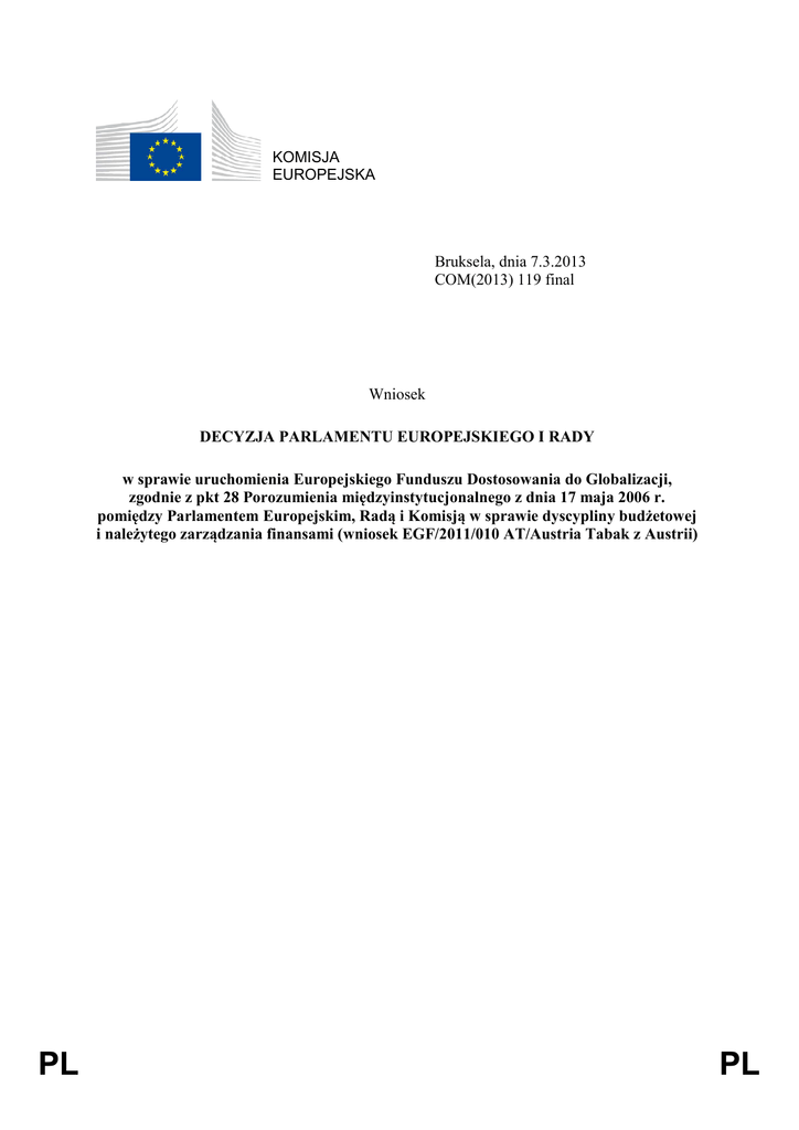 KOMISJA EUROPEJSKA Bruksela, dnia 7.3.2013 COM(2013) 119 final Wniosek DECYZJA PARLAMENTU EUROPEJSKIEGO I RADY w sprawie uruchomienia Europejskiego Funduszu Dostosowania do Globalizacji, zgodnie z pkt 28 Porozumienia międzyinstytucjonalnego z dnia 17 maja 2006 r. pomiędzy Parlamentem Europejskim, Radą i Komisją w sprawie dyscypliny budżetowej i należytego zarządzania finansami (wniosek EGF/2011/010 AT/Austria Tabak z Austrii) PL PL UZASADNIENIE Przepisy pkt 28 Porozumienia międzyinstytucjonalnego z dnia 17 maja 2006 r. pomiędzy Parlamentem Europejskim, Radą i Komisją w sprawie dyscypliny budżetowej i należytego zarządzania finansami1 umożliwiają uruchomienie środków z Europejskiego Funduszu Dostosowania do Globalizacji (EFG) poprzez zastosowanie mechanizmu elastyczności, w ramach rocznego limitu w wysokości 500 mln EUR, powyżej limitów właściwych działów ram finansowych. Zasady mające zastosowanie do wkładów z EFG zostały określone w rozporządzeniu (WE) nr 1927/2006 Parlamentu Europejskiego i Rady z dnia 20 grudnia 2006 r. ustanawiającym Europejski Fundusz Dostosowania do Globalizacji2. W dniu 20 grudnia 2011 r., w następstwie zwolnień w przedsiębiorstwie Austria Tabak GmbH oraz u 14 austriackich dostawców i producentów znajdujących się poniżej w łańcuchu dostaw, Austria przedłożyła wniosek nr EGF/2011/010 AT/Austria Tabak o wkład finansowy z EFG. Po dokładnym przeanalizowaniu wniosku Komisja uznała, zgodnie z art. 10 rozporządzenia (WE) nr 1927/2006, że warunki przekazania wkładu finansowego określone w tym rozporządzeniu zostały spełnione. STRESZCZENIE WNIOSKU I ANALIZA Podstawowe dane: Nr referencyjny EFG Państwo członkowskie Artykuł 2 Główne przedsiębiorstwo Dostawcy i producenci niższego szczebla Okres odniesienia Data rozpoczęcia świadczenia zindywidualizowanych usług Data złożenia wniosku Zwolnienia w okresie odniesienia Zwolnienia przed okresem odniesienia i po nim Kwalifikowalne zwolnienia ogółem Liczba pracowników, co do których oczekuje się, że skorzystają ze środków Wydatki na zindywidualizowane usługi (EUR) Wydatki na wdrażanie EFG3 (EUR) Wydatki na wdrażanie EFG (%) Budżet ogółem (EUR) Wkład z EFG w EUR (65 %) 15.11.2011 20.12.2011 320 0 320 270 5 864 615 200 000 3,3 6 064 615 3 941 999 1. Wniosek przedstawiono Komisji w dniu 20 grudnia 2011 r. i uzupełniano dodatkowymi informacjami do dnia 9 października 2012 r. 2. Wniosek spełnia warunki wypłaty środków z EFG określone w art. 2 lit. c) rozporządzenia (WE) nr 1927/2006 oraz został złożony w terminie 10 tygodni, o którym mowa w art. 5 tego rozporządzenia. 1 2 3 PL EGF/2011/010 Austria lit. c) – wyjątkowe okoliczności Austria Tabak GmbH 14 20.8.2011 – 19.12.2011 Dz.U. C 139 z 14.6.2006, s. 1. Dz.U. L 406 z 30.12.2006, s. 1. Zgodnie z art. 3 akapit trzeci rozporządzenia (WE) nr 1927/2006. 2 PL Związek między zwolnieniami pracowników a poważnymi zmianami strukturalnymi w handlu światowym spowodowanymi globalizacją lub światowym kryzysem finansowym i gospodarczym 3. Przyczyną zwolnień pracowników było zamknięcie ostatniego zakładu produkcyjnego przedsiębiorstwa Austria Tabak w Hainburgu (Niederösterreich/Dolna Austria). W wyniku decyzji podjętej przez właściciela – przedsiębiorstwo Japan Tobacco International (JTI)4 – powyższa fabryka papierosów była zamykana stopniowo od drugiej połowy 2011 r. do połowy 2012 r. 4. Aby udowodnić związek pomiędzy zwolnieniami pracowników i istotnymi zmianami w strukturze światowego handlu spowodowanymi globalizacją, Austria przekonuje, że produkcja papierosów i wyrobów tytoniowych w UE (ujęta w dziale 12 klasyfikacji NACE Rev. 25) silnie odczuła zmiany w strukturze światowego handlu, w szczególności spadek udziału UE w rynku i przeniesienie produkcji do państw trzecich. Zmiany w strukturze handlu stanowią odzwierciedlenie spadku spożycia papierosów w ostatniej dekadzie w uprzemysłowionych państwach Europy oraz w USA i Japonii (głównie z powodu środków zwalczania palenia tytoniu oraz z powodu rosnącego opodatkowania). Austria argumentuje swoje stanowisko przytaczając dane Światowej Organizacji Zdrowia (WHO)6 oraz dane pochodzące z publikacji „Tobacco Atlas” wydawanej przez World Lung Foundation/American Cancer Society7. Pokazują one, że popyt na wyroby tytoniowe gwałtownie wzrasta i będzie wzrastał w azjatyckich krajach wschodzących i w Rosji8. Łącznie w Chinach, Rosji i Indonezji mieszka jedna trzecia palaczy na świecie. Rys. Tendencja spadkowa – odsetek palaczy wśród dorosłych mężczyzn (państwa uprzemysłowione): 19602010 Źródło: http://www.tobaccoatlas.org 4 5 6 7 8 PL Przedsiębiorstwo JTI, z siedzibą w Genewie, należy do japońskiego przedsiębiorstwa Japan Tobacco Inc. i jest jedną z największych korporacji tytoniowych na świecie (10,8 % udziału w rynku światowym w 2007 r.), obok państwowego chińskiego przedsiębiorstwa China National Tobacco Corporation (32 % udziału w rynku w 2007 r.), przedsiębiorstwa Morris International (18,7 % udziału w rynku w 2007 r.) i przedsiębiorstwa British American Tobacco (17,1 % udziału w rynku w 2007 r.). Obecnie JTI działa w 120 państwach i zatrudnia 25 tys. pracowników. Dział 12 klasyfikacji NACE Rev. 2 obejmuje zarówno wyroby tytoniowe do palenia, jak i wyroby tytoniowe bezdymne. Wyroby tytoniowe do palenia obejmują papierosy, a także cygara, fajki i samodzielnie skręcane papierosy. Wyroby tytoniowe bezdymne obejmują takie produkty jak tabaka lub tytoń do żucia. http://www.who.int/tobacco/en/atlas5.pdf http://www.tobaccoatlas.org: wydanie uaktualnione (czwarte) z 2012 r. Według WHO, przedsiębiorstwa Philip Morris i innych źródeł, ogromny rynek stanowią Chiny, w których mieszka 320-350 mln palaczy. W 2009 r. 38 % światowej konsumpcji papierosów przypadło na Chiny. Kolejnym państwem pod względem odsetka światowej konsumpcji papierosów by