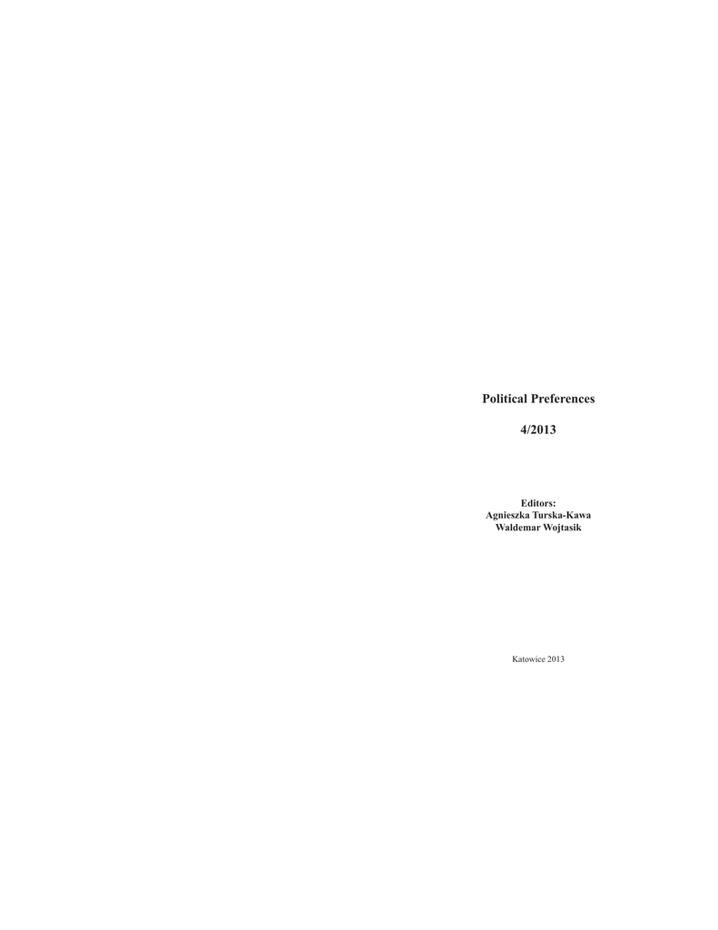 Political Preferences 4/2013 Editors: Agnieszka Turska-Kawa Waldemar Wojtasik Katowice 2013 All texts are licensed under the Creative Commons BY 3.0 (CC BY 3.0) 6FLHQWL¿F&RXQFLO prof. dr hab. Roman Bäcker (Nicolaus Copernicus University, Poland), prof. dr hab. Tadeusz Godlewski (Kazimierz Wielki University, Poland), prof. dr hab. Iwona Jakubowska-Branicka (University of Warsaw, Poland), prof. dr hab. Slavomir Magál (University of St. Cyril and Methodius, Slovakia), prof. dr hab. Jozef Matúš (University of St. Cyril and Methodius, Slovakia), prof. dr hab. Dusan Pavlu (Higher School of Hospitality Management, Czech Republic) prof. dr hab. Libor Pavera (Higher School of Hospitality Management, Czech Republic), prof. dr hab. Dana Petranová (University of St. Cyril and Methodius, Slovakia), prof. dr hab. Olga Prokopenko 6XPVNL1DWLRQDO8QLYHUVLW\8NUDLQHSURIGUKDE7HUHVD6DVLĔVND.ODV-DJLHOORQLDQ8QLYHUVLW\ Poland), prof. dr hab. Jerzy Sielski (University of Szczecin, Poland), dr Marcjanna Augustyn (University of Hull, England) Editorial Board: dr Agnieszka Turska-Kawa (chief editor) PJU-DURVáDZ:LFKXUDMRXUQDOVHFUHWDU\ dr hab. Robert Alberski (theme editor: systems and voting behavior) SURI80.GUKDE'DQXWD3OHFND.DUQRZVNDWKHPHHGLWRUSROLWLFDOLGHQWL¿FDWLRQ GUKDEàXNDV]7RPF]DNWKHPHHGLWRUSROLWLFDOSDUWLHV dr Zbigniew Widera (theme editor: political marketing) dr Waldemar Wojtasik (theme editor: party systems) PJU3U]HP\VáDZ*U]RQNDVWDWLVWLFDOHGLWRU Reviewers: SURIGUKDEďXGPLODýiE\RYi8QLYHUVLW\RI6W&\ULODQG0HWKRGLXVLQ7UQDYD6ORYDNLD prof. dr hab. Norbert Vrabec (University of St. Cyril and Methodius in Trnava, Slovakia), prof. dr hab. Krzysztof Gajdka (University of Economics in Katowice, Poland), prof. dr hab. Tadeusz *RGOHZVNL1LFRODXV&RSHUQLFXV8QLYHUVLW\LQ7RUXQ3RODQGSURIGUKDE6WDQLVáDZ0LFKDOF]\N (University of Silesia in Katowice, Poland), prof. dr hab. Jacek Wojnicki (University of Warsaw, 3RODQGSURIGUKDE0DULXV].ROF]\ĔVNL8QLYHUVLW\RI6LOHVLDLQ.DWRZLFH3RODQG /DQJXDJHYHUL¿FDWLRQ -DURVáDZ:LFKXUD &RYHUSURMHFW -DURVáDZ:LFKXUD Original version of journal: paper. © Centre for Innovation, Technology Transfer and Development Foundation of the University of Silesia Katowice 2013 Patronage for the project is exercised by Polish Political Science Association and the Society for Academic Initiatives. Journal is published by the Institute of Political Science and Journalism at the University of Silesia and the Center for Innovation, Technology Transfer and Development Foundation of the University of Silesia. ISSN: 2083-327X ISBN: 978-83-62314-76-8 Desktop Publishing, prepress and printing: REMAR, www.remar-sosnowiec.pl, e-mail: [email protected] CONTENTS Introduction ....................................................................................................... 7 0LUR+DþHN(University of Ljubljana, Slovenia) (Dis)trust into the rule of law in Slovenia......................................................... 9 Waldemar Wojtasik (University of Silesia, Poland) Functions of elections in democratic system .................................................. 25 5DIDá*ODMFDU(University of Silesia, Poland) Model of election of the head of state of the Third Polish Republic – balancing between institutional coherence and political pragmatism ............ 39 Sebastian Kubas (University of Silesia, Poland) Evolution of Preferences at Hungarian Electorate towards Bidimensional “Left – Right” Structure (1990 to 2013)................................. 53 Karolina Ticha (University of Matej Bel, Slovakia) Comparison of the cleavages development in the Czech Republic and Poland after 1989 ..................................................................................... 77 Danuta Plecka (Karnowska) (Nicolaus Copernicus University, Poland) Individualism and civic participation – an essay on a certain way of thinking about citizenship........................................................................... 89 Irena Pilch (University of Silesia, Poland) Lidia Baran (University od Silesia, Poland) Personal values, perceptions of unfairness in social exchange and happiness among young voters and non-voters in Poland ....................... 99 Agnieszka Turska-Kawa (University of Silesia, Poland) Reactive political leadership ......................................................................... 115 'DULXV]'ROLĔVNL(Warsaw School of Social Sciences and Humanities, Poland) Robert Wiszniowski (University of Wroclaw, Poland) 7HFKQLTXHVRIVRFLDOLQÀXHQFHZLWKUHIHUHQFHWRSROLWLFDOOLIH...................... 133 5 Aleksandra Seklecka (Nicolaus Copernicus University, Poland) The picture(s) of campaign. The 2011 electoral campaign in major news bulletins ................................................................................. 153 Hana Pravdová (University of St. Cyril and Methodius in Trnava, Slovakia) Coordinates of Interests of Media, Political Subjects and Recipients .......... 169 $JQLHV]ND.DVLĔVND0HWU\ND(The Jan Kochanowski University in Kielce, Poland) Psychological and marketing conditions of electoral activity of women ..... 179 7HUHVD$VWUDPRZLF]/H\N(University of Warmia and Mazury in Olsztyn, Poland) :LWROG=\JPXQW.XOHUVNLDFWLYLWLHV±VHFUHWDU\6WDQLVáDZ0LNRáDMF]\N¶V – after World War II ...................................................................................... 187 Reviews ......................................................................................................... 199 -DURVáDZ:LFKXUDNew media and the public opinion (Nowe media a opinia publiczna), Wydawnictwo i-Press, Kraków, 2012 (Reviewer: Zbigniew Widera)....................................................................... 199 .U]\V]WRI*DMGND Spokesman in the surrounding media (Rzecznik prasowy w otoczeniu mediów), Towarzystwo Autorów i Wydawców Prac Naukowych UNIWERSITAS, Kraków, 2012 (Reviewer: Zbigniew Widera)....................................................................... 201 Abstracts ...............