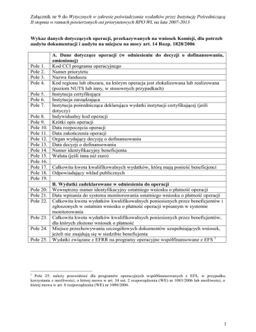 Załącznik nr 9 do Wytycznych w zakresie poświadczania wydatków przez Instytucję Pośredniczącą II stopnia w ramach powierzonych osi priorytetowych RPO WL na lata 2007-2013 Wykaz danych dotyczących operacji, przekazywanych na wniosek Komisji, dla potrzeb audytu dokumentacji i audytu na miejscu na mocy art. 14 Rozp. 1828/2006 Pole 1. Pole 2. Pole 3. Pole 4. Pole 5. Pole 6. Pole 7. A. Dane dotyczące operacji (w odniesieniu do decyzji o dofinansowaniu, zmienionej) Kod CCI programu operacyjnego Numer priorytetu Nazwa funduszu Kod regionu lub obszaru, na którym operacja jest zlokalizowana lub realizowana (poziom NUTS lub inny, w stosownych przypadkach) Instytucja certyfikująca Instytucja zarządzająca Instytucja pośrednicząca deklarująca wydatki instytucji certyfikującej (jeśli dotyczy) Indywidualny kod operacji Krótki opis operacji Data rozpoczęcia operacji Data zakończenia operacji Organ wydający decyzję o dofinansowaniu Data decyzji o dofinansowaniu Numer identyfikacyjny beneficjenta Waluta (jeśli inna niż euro) Pole 8. Pole 9. Pole 10. Pole 11. Pole 12. Pole 13. Pole 14. Pole 15. Pole 16. Pole 17. Całkowita kwota kwalifikowalnych wydatków, którą mają ponieść beneficjenci Pole 18. Odpowiadający wkład publicznych Pole 19. B. Wydatki zadeklarowane w odniesieniu do operacji Pole 20. Wewnętrzny numer identyfikacyjny ostatniego wniosku o płatność operacji Pole 21. Data wpisania do systemu monitorowania ostatniego wniosku o płatność operacji Pole 22. Całkowita kwota wydatków kwalifikowalnych poniesionych przez beneficjentów i zgłoszonych w ostatnim wniosku o płatność operacji wpisanym w systemie monitorowania Pole 23. Całkowita kwota wydatków kwalifikowalnych poniesionych przez beneficjentów, dla których złożono wniosek o płatność Pole 24. Miejsce przechowywania szczegółowych dokumentów uzupełniających wniosek, jeżeli nie znajdują się w siedzibie beneficjenta Pole 25. Wydatki związane z EFRR na programy operacyjne współfinansowane z EFS 1 1 Pole 25: należy przewidzieć dla programów operacyjnych współfinansowanych z EFS, w przypadku korzystania z możliwości, o której mowa w art. 34 ust. 2 rozporządzenia (WE) nr 1083/2006 lub możliwości, o której mowa w art. 8 rozporządzenia (WE) nr 1080/2006. 1 Załącznik nr 9 do Wytycznych w zakresie poświadczania wydatków przez Instytucję Pośredniczącą II stopnia w ramach powierzonych osi priorytetowych RPO WL na lata 2007-2013 Pole 26. Wydatki związane z EFS na programy operacyjne współfinansowane z EFRR 2 Pole 27. Wydatki poniesione w obszarach przylegających do obszarów kwalifikowanych (współpraca transgraniczna) 3 Pole 28. Wydatki poniesione przez partnerów spoza obszaru kwalifikowalnego (współpraca transnarodowa) 4 Pole 29. Wydatki poniesione poza terytorium Wspólnoty (współpraca transgraniczna, transnarodowa i międzyregionalna) 5 Pole 30. Wydatki poniesione na zakup gruntów 6 Pole 31 Wydatki poniesione na mieszkalnictwo 7 Pole 32. Wydatki związane z kosztami pośrednimi / kosztami ogólnymi rozliczanymi ryczałtowo, koszty ryczałtowe wyliczone na podstawie standardowych taryf zryczałtowanych stawek kosztów jednostkowych i kwot ryczałtowych 8 Pole 33. Dochód odliczony od wydatków na operację i włączony do deklaracji wydatków i wniosku o płatność Pole 34. Korekty finansowe odliczone od wydatków na operację i włączone do deklaracji wydatków i wniosku o płatność Pole 35. Całkowita kwota wydatków kwalifikowalnych operacji i odpowiadający wkład publiczny włączone do deklaracji wydatków przesłanej Komisji przez instytucję certyfikującą (w euro) Pole 36. Całkowita kwota wydatków kwalifikowalnych operacji i odpowiadający wkład publiczny włączone do deklaracji wydatków przesłanej Komisji przez instytucję certyfikującą (w walucie krajowej) Pole 37. Data ostatniej deklaracji wydatków instytucji certyfikującej zawierającej wydatki operacji Pole 38. Data weryfikacji przeprowadzonych na podstawie mocy art. 13 ust. 2 lit. b) Pole 39. Data audytów przeprowadzonych na podstawie art. 16 ust. 1 Pole 40. Organ przeprowadzający audyt lub weryfikację Pole 41. 2 Pole 26: należy przewidzieć dla programów operacyjnych współfinansowanych z EFRR, w przypadku korzystania z możliwości, o której mowa w art. 34 ust. 2 rozporządzenia (WE) nr 1083/2006 lub możliwości, o której mowa w art. 8 rozporządzenia (WE) nr 1080/2006. 3 Art. 21 ust. 1 rozporządzenia (WE) nr 1080/2006. 4 Art. 21 ust. 2 rozporządzenia (WE) nr 1080/2006. 5 Art. 21 ust. 3 rozporządzenia (WE) nr 1080/2006. 6 Art. 7 ust. 1 lit. b) rozporządzenia (WE) nr 1080/2006. 7 Art. 7 ust. 2 rozporządzenia (WE) nr 1080/2006. 8 Art. 7 rozporządzenia nr 1080/2006 i art. 11 rozporządzenia nr 1081/2006 Parlamentu Europejskiego i Rady (Dz.U. L 210 z 31.7.2006, s. 12). 2
