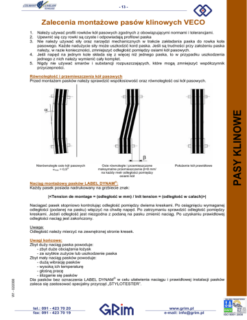 - 13 - Zalecenia montażowe pasów klinowych VECO 1. Należy używać profili rowków kół pasowych zgodnych z obowiązującymi normami i tolerancjami. 2. Upewnić się czy rowki są czyste i odpowiadają profilowi paska 3. Nie należy używać siły oraz narzędzi mechanicznych w trakcie zakładania paska do rowka koła pasowego. Każde nadużycie siły może uszkodzić kord paska. Jeśli są trudności przy założeniu paska należy, w razie konieczności, zmniejszyć odległość pomiędzy osiami kół pasowych. 4. Jeśli napęd na jednym kole składa się z więcej niż jednego paska, to w przypadku uszkodzenia jednego z nich należy wymienić cały komplet. 5. Nigdy nie używać smarów i substancji rozpuszczających, które mogą zmniejszyć współczynnik przyczepności. Nierównoległe osie kół pasowych O max = 0,5 Osie równoległe i przemieszczone maksymalne przemieszczenie β=8 mm/ na każdy metr odległości pomiędzy osiami kół Położenie kół prawidłowe Naciąg montażowy pasków LABEL DYNAM®: Każdy pasek posiada nadrukowany na grzbiecie znak: |<Tension de montage = (odległość w mm) / Init tension = (odległość w calach)>| Naciągać pasek stopniowo kontrolując odległość pomiędzy dwiema kreskami. Po osiągnięciu wymaganej odległości (podanej na pasku) włączyć na chwilę napęd. Po zatrzymaniu sprawdzić odległość pomiędzy kreskami. Jeżeli odległość jest niezgodna z podaną na pasku zmienić naciąg. Po uzyskaniu prawidłowej odległości naciąg jest zakończony. W1 - 02/2008 Uwaga: Odległość należy mierzyć na zewnętrznej stronie kresek. Uwagi końcowe: Zbyt duży naciąg paska powoduje: - zbyt duże obciążenia łożysk - za szybkie zużycie lub uszkodzenie paska Zbyt mały naciąg pasków powoduje: - dużą wibrację pasków - wysoką ich temperaturę - głośną pracę - ślizganie się pasków Dla pasków bez oznaczenia LABEL DYNAM® w celu ułatwienia naciągu i prawidłowej instalacji pasków zaleca się zastosować specjalny przyrząd „STYLOTESTER”. tel.: 091 - 423 70 20 fax: 091 - 423 70 19 www.grim.pl e-mail: [email protected] PASY KLINOWE Równoległość i przemieszczenia kół pasowych Przed montażem pasków należy sprawdzić współosiowość oraz równoległość osi kół pasowych.