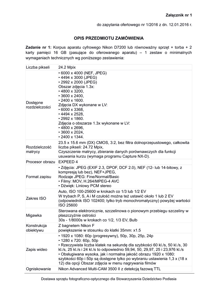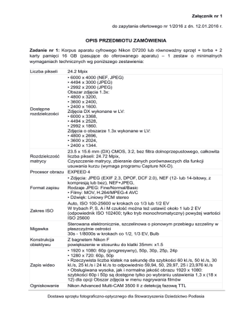 Załącznik nr 1 do zapytania ofertowego nr 1/2016 z dn. 12.01.2016 r. OPIS PRZEDMIOTU ZAMÓWIENIA Zadanie nr 1: Korpus aparatu cyfrowego Nikon D7200 lub równoważny sprzęt + torba + 2 karty pamięci 16 GB (pasujące do oferowanego aparatu) – 1 zestaw o minimalnych wymaganiach technicznych wg poniższego zestawienia: Liczba pikseli 24.2 Mpix • 6000 x 4000 (NEF, JPEG) • 4494 x 3000 (JPEG) • 2992 x 2000 (JPEG) Obszar zdjęcia 1.3x: • 4800 x 3200, • 3600 x 2400, • 2400 x 1600. Dostępne Zdjęcia DX wykonane w LV: rozdzielczości • 6000 x 3368, • 4494 x 2528, • 2992 x 1860. Zdjęcia o obszarze 1.3x wykonane w LV: • 4800 x 2696, • 3600 x 2024, • 2400 x 1344. 23.5 x 15.6 mm (DX) CMOS, 3:2, bez filtra dolnoprzepustowego, całkowita Rozdzielczość liczba pikseli: 24.72 Mpix, matrycy Czyszczenie matrycy, zbieranie danych porównawczych dla funkcji usuwania kurzu (wymaga programu Capture NX-D). Procesor obrazu EXPEED 4 • Zdjęcia: JPEG (EXIF 2.3, DPOF, DCF 2.0), NEF (12- lub 14-bitowy, z kompresją lub bez), NEF+JPEG, Format zapisu Rodzaje JPEG: Fine/Normal/Basic • Filmy: MOV, H.264/MPEG-4 AVC • Dźwięk: Liniowy PCM stereo Auto, ISO 100-25600 w krokach co 1/3 lub 1/2 EV W trybach P, S, A i M czułość można też ustawić około 1 lub 2 EV Zakres ISO (odpowiednik ISO 102400; tylko tryb monochromatyczny) powyżej wartości ISO 25600 Sterowana elektronicznie, szczelinowa o pionowym przebiegu szczeliny w Migawka płaszczyźnie ostrości 30s - 1/8000s w krokach co 1/2, 1/3 EV, Bulb Konstrukcja Z bagnetem Nikon F obiektywu powiększenie w stosunku do klatki 35mm: x1.5 • 1920 x 1080: 60p (progresywny), 50p, 30p, 25p, 24p • 1280 x 720: 60p, 50p • Rzeczywista liczba klatek na sekundę dla szybkości 60 kl./s, 50 kl./s, 30 Zapis wideo kl./s, 25 kl./s i 24 kl./s to odpowiednio 59,94, 50, 29,97, 25 i 23,976 kl./s • Obsługiwana wysoka, jak i normalna jakość obrazu 1920 x 1080: szybkości 60p i 50p są dostępne tylko po wybraniu ustawienia 1,3 x (18 x 12) dla opcji Obszar zdjęcia w menu nagrywania filmów Ogniskowanie Nikon Advanced Multi-CAM 3500 II z detekcją fazową TTL Dostawa sprzętu fotograficzno-optycznego dla Stowarzyszenia Dziedzictwo Podlasia Pomiar światła Balans bieli Kompensacja ekspozycji Programy Zdjęcia seryjne • 51 pól AF (w tym 15 pól krzyżowych), 1 pole obsługuje przysłonę f/8), dioda wspomagająca AF (zasięg około 0,5–3 m). możliwość wyboru jednego z 51 lub 11 pól AF) • Punkty AF: Jednopolowy AF, 9-, 21- lub 51-polowy AF z dynamicznym wyborem pola, śledzenie 3D, automatyczny wybór pola AF; możliwość wyboru jednego z 51 lub 11 pól AF • Tryby napędu AF: Pojedynczy AF (AF-S): Ciągły AF (AF-C); automatyczny wybór AF-S/AF-C (AF-A), wyprzedzające śledzenie ostrości włączane automatycznie przy zmianie stanu fotografowanego obiektu; ręczne ustawianie ostrości (M): można korzystać ze wskaźnika ustawienia ostrości • Zakres detekcji: Od –3 do +19 EV (ISO 100, 20°C) • AF w podglądzie na żywo: Autofokus (AF): pojedynczy AF (AF-S), tryb ciągłego AF (AF-F), ręczne ustawianie ostrości (M); AF z detekcją kontrastu w dowolnej części kadru (aparat automatycznie wybiera pole AF po włączeniu opcji AF z priorytetem twarzy lub AF ze śledzeniem obiektu) • Tryby pól AF w podglądzie na żywo: AF z priorytetem twarzy, szerokie pole AF, normalne pole AF, AF ze śledzeniem obiektu 2016-pikselowy czujnik RGB, TTL, Tryby pomiaru: • matrycowy 3D Colour Matrix II (2016 punktowy) - obiektywy Nikkor typu G/E/D • matrycowy Color Matrix II - pozostałe obiektywy z procesorem • punktowy w kole o średnicy 3,5 mm (2.5% kadru), • centralnie ważony (75% czułości czujnika skupione na obszarze o średnicy 6, 8, 10, lub 13 mm w centrum kadru) lub pomiar na podstawie uśrednienia całego kadru, Zakres pomiaru: matrycowy lub centralnie ważony od 0 do 20 EV, pomiar punktowy od 2 do 20 EV (F1.4, ISO100, +20°C) Funkcja Active D-Lighting (poziomy: auto, bardzo wysoki, wysoki, normalny, niski, wyłączony) • Automatyczny (2 rodzaje), światło żarowe, światło jarzeniowe (7 rodzajów), światło słoneczne, lampa błyskowa, pochmurno, cień, pomiar manualny (można zapisać maks. 6 wartości; punktowy pomiar balansu bieli dostępny w trybie podglądu na żywo) i wybór temperatury barwowej (od 2500 do 10 000 K) • wszystkie tryby z dokładną regulacją Regulacja w zakresie od –5 do +5 EV w krokach co 1/3 lub 1/2 EV w trybach P, S, A, M, SCENE i noktowizora • Automatyka programowa z fleksją programu (P), automatyka z preselekcją czasu (S), automatyka z preselekcją przysłony (A), manualny (M); U1 (ustawienia użytkownika 1); U2 (ustawienia użytkownika 2) • Tryby automatyczne: automatyczny, automatyczny bez błysku • Programy tematyczne: portret, krajobraz, dziecko, zdjęcia sportowe, makro, portret nocny, krajobraz nocny, przyjęcie/wnętrza, plaża/śnieg, zachód słońca, zmierzch/świt, portret zwierzaka, blask świec, kwiaty, barwy jesieni, żywność • Tryby efektów specjalnych: noktowizor, szkic kolorowy, efekt miniatury, kolor selektywny, sylwetka, rozjaśnienie, przyciemnienie • Szybkość 6 kl./s (tryb szybki CH), 1-6 kl./s (tryb wolny CL) - zdjęcia w formacie JPEG i 12-bitowym formacie NEF z użyciem obszaru zdjęcia DX • Szybkość 7 kl./s (tryb szybki CH), 1-6 kl./s (tryb wolny CL) - zdjęcia w formacie JPEG i 12-bitowym formacie NEF z użyciem obszaru zdjęcia x1.3 • Szybkość 5 kl./s (tryb szybki CH), 1-5 kl./s (tryb wolny CL) - zdjęcia w 14bitowym formacie NEF z użyciem obszaru zdjęcia DX • Szybkość 6 kl./s (tryb szybki CH), 1-6 kl./s (tryb wolny CL) - zdjęcia w 14- Dostawa sprzętu fotograficzno-optycznego dla Stowarzyszenia Dziedzictwo Podlasia bitowym formacie NEF z użyciem obszaru zdjęcia x1.3 Typu pop-up, i-TTL, liczba przewodnia 12 (ISO 100, 20˚C). • Synchronizacja do 1/250s • Korekcja siły błysku od - 3 EV do +1 EV w krokach co 1/3 lub 1/2 EV 