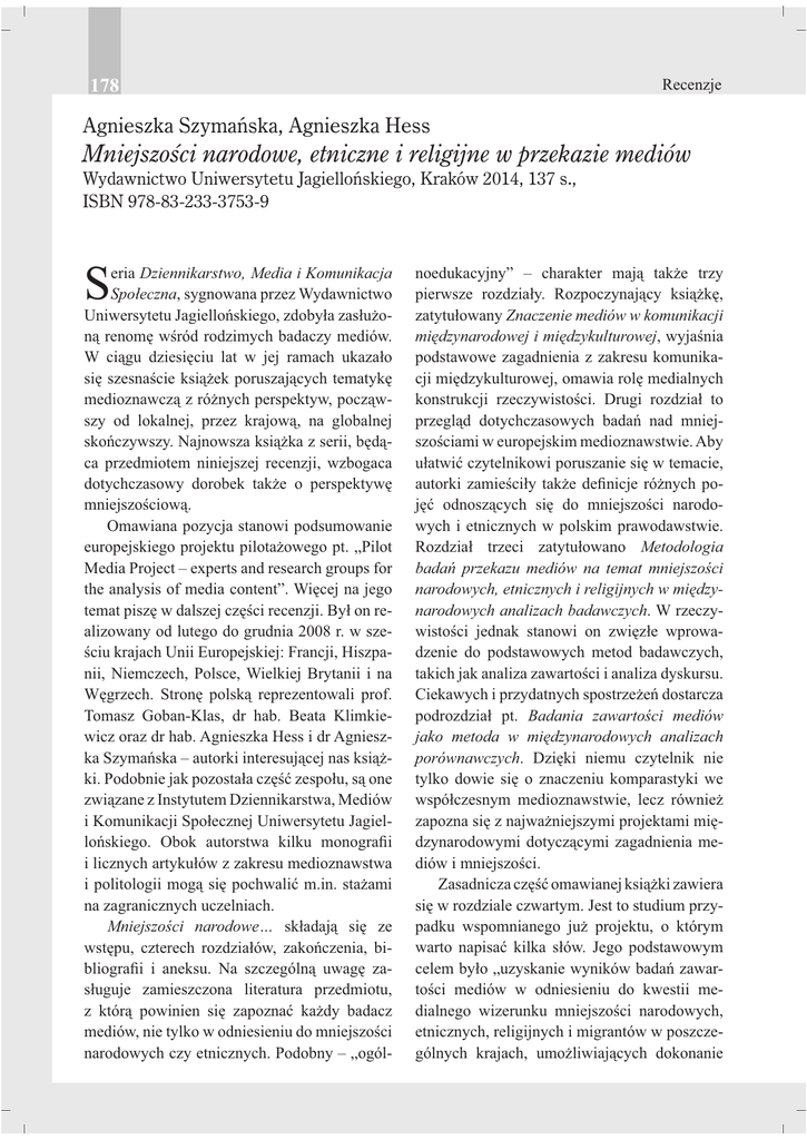 Recenzje 178 Agnieszka Szymańska, Agnieszka Hess Mniejszości narodowe, etniczne i religijne w przekazie mediów Wydawnictwo Uniwersytetu Jagiellońskiego, Kraków 2014, 137 s., ISBN 978-83-233-3753-9 S eria Dziennikarstwo, Media i Komunikacja Społeczna, sygnowana przez Wydawnictwo Uniwersytetu Jagiellońskiego, zdobyła zasłużoną renomę wśród rodzimych badaczy mediów. W ciągu dziesięciu lat w jej ramach ukazało się szesnaście książek poruszających tematykę medioznawczą z różnych perspektyw, począwszy od lokalnej, przez krajową, na globalnej skończywszy. Najnowsza książka z serii, będąca przedmiotem niniejszej recenzji, wzbogaca dotychczasowy dorobek także o perspektywę mniejszościową. Omawiana pozycja stanowi podsumowanie europejskiego projektu pilotażowego pt. „Pilot Media Project – experts and research groups for the analysis of media content”. Więcej na jego temat piszę w dalszej części recenzji. Był on realizowany od lutego do grudnia 2008 r. w sześciu krajach Unii Europejskiej: Francji, Hiszpanii, Niemczech, Polsce, Wielkiej Brytanii i na Węgrzech. Stronę polską reprezentowali prof. Tomasz Goban-Klas, dr hab. Beata Klimkiewicz oraz dr hab. Agnieszka Hess i dr Agnieszka Szymańska – autorki interesującej nas książki. Podobnie jak pozostała część zespołu, są one związane z Instytutem Dziennikarstwa, Mediów i Komunikacji Społecznej Uniwersytetu Jagiellońskiego. Obok autorstwa kilku monografii i licznych artykułów z zakresu medioznawstwa i politologii mogą się pochwalić m.in. stażami na zagranicznych uczelniach. Mniejszości narodowe… składają się ze wstępu, czterech rozdziałów, zakończenia, bibliografii i aneksu. Na szczególną uwagę zasługuje zamieszczona literatura przedmiotu, z którą powinien się zapoznać każdy badacz mediów, nie tylko w odniesieniu do mniejszości narodowych czy etnicznych. Podobny – „ogól- noedukacyjny” – charakter mają także trzy pierwsze rozdziały. Rozpoczynający książkę, zatytułowany Znaczenie mediów w komunikacji międzynarodowej i międzykulturowej, wyjaśnia podstawowe zagadnienia z zakresu komunikacji międzykulturowej, omawia rolę medialnych konstrukcji rzeczywistości. Drugi rozdział to przegląd dotychczasowych badań nad mniejszościami w europejskim medioznawstwie. Aby ułatwić czytelnikowi poruszanie się w temacie, autorki zamieściły także definicje różnych pojęć odnoszących się do mniejszości narodowych i etnicznych w polskim prawodawstwie. Rozdział trzeci zatytułowano Metodologia badań przekazu mediów na temat mniejszości narodowych, etnicznych i religijnych w międzynarodowych analizach badawczych. W rzeczywistości jednak stanowi on zwięzłe wprowadzenie do podstawowych metod badawczych, takich jak analiza zawartości i analiza dyskursu. Ciekawych i przydatnych spostrzeżeń dostarcza podrozdział pt. Badania zawartości mediów jako metoda w międzynarodowych analizach porównawczych. Dzięki niemu czytelnik nie tylko dowie się o znaczeniu komparastyki we współczesnym medioznawstwie, lecz również zapozna się z najważniejszymi projektami międzynarodowymi dotyczącymi zagadnienia mediów i mniejszości. Zasadnicza część omawianej książki zawiera się w rozdziale czwartym. Jest to studium przypadku wspomnianego już projektu, o którym warto napisać kilka słów. Jego podstawowym celem było „uzyskanie wyników badań zawartości mediów w odniesieniu do kwestii medialnego wizerunku mniejszości narodowych, etnicznych, religijnych i migrantów w poszczególnych krajach, umożliwiających dokonanie Recenzje pogłębionej analizy porównawczej”1. Sześć krajów, które wzięło w nim udział, zostało wytypowanych zarówno pod względem geograficznym, jak i kulturowo-historycznym. Każdy z zaangażowanych zespołów naukowców został zobligowany do wyboru materiału badawczego w oparciu o te same kryteria i ramy czasowe „w sposób reprezentatywny dla krajobrazu mediów w swoim kraju”. Oznaczało to, że w badaniu należało uwzględnić „cztery dzienniki, w tym dwa ogólnospołeczne tytuły opiniotwórcze o odmiennej orientacji politycznej oraz po dwa tytuły prasy bulwarowej, również – o ile było to możliwe – o odmiennej orientacji politycznej”2. Biorąc pod uwagę polskie warunki, rodzimy zespół uznał za stosowne zastąpić jeden tabloid „Naszym Dziennikiem”, jako prasowym przedstawicielem liczącej się części społeczeństwa3. Łącznie, wszystkie zespoły dokonały czterech pomiarów, z których każdy objął trzy pełne wydania wybranych tytułów prasowych z czterech tygodni. Początkowo planowano zbadać sześć wydań gazet w każdym z tygodni, jednak „niezwykle rozbudowana struktura klucza kategoryzacyjnego wykorzystywanego w badaniach, a także konieczność częściowego kodowania wszystkich jednostek wypowiedzi prasowej opublikowanych na łamach wybranych do badań wydań spowodowały konieczność ograniczenia pomiaru do trzech wydań w każdym z badanych tygodni”4. W dalszej części rozdziału zostały przedstawione szczegółowe informacje dotyczące poszczególnych etapów realizacji projektu. 179 Możemy więc zaznajomić się m.in. z dziesięcioma typami grup mniejszości, które poddano analizie, jak również z samą strukturą badań, w tym z zakresem informacji kodowanych w bazie danych wykorzystanej na potrzeby projektu. Sporym atutem omawianej publikacji jest zamieszczony klucz kategoryzacyjny „zawierający jednocześnie zarówno elementy narzędzia pomiaru ilościowego, jak i jakościowego”. Jak bardzo szczegółowy był to klucz świadczy fakt, że do opisu samego tylko nagłówka/ tytułu (headline/ subheadline details) zespół badawczy miał do dyspozycji aż dziesięć kategorii: obecność tytułu, perspektywa problemu w tytule, region geograficzny, tematyka, treść na temat mniejszości, przynależność generalna, przynależność szczegó