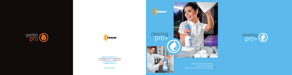 Kwazar Corporation Sp. z o.o. ul. Chełmońskiego 144, 96-313 Jaktorów, Poland tel. 48 (46) 856 40 30 | fax 48 (46) 856 41 33 [email protected] [email protected] www.kwazar.com.pl profesjonalne opryskiwacze techniczne professional technical sprayers профессиональные технические опрыскиватели PL EN RUS PL Państwa życzenia i uwagi będą wskazywać nam kierunki działań. Oddając w Państwa ręce NOWY katalog pragniemy zaprezentować nowe PRODUKTY z serii CLEANING PRO + będące efektem uważnego śledzenia potrzeb naszych Klientów. Od lat pracujemy nad ciągłym podnoszeniem jakości świadczonych przez nas usług oraz ulepszaniem naszych produktów. Z roku na rok podnosimy poprzeczkę. Staramy się być coraz lepsi. Działania i starania naszej firmy doceniają niezależni eksperci z branży. Potwierdzeniem tego są nagrody, wyróżnienia oraz dyplomy przyznawane nam przez różne specjalistyczne środowiska. Dzisiaj chcemy Państwu szczerze podziękować. Kierując do Państwa te słowa mamy niezachwianą nadzieję, że będziemy wspólnie dbać o markę Kwazar, by dalej trwała i zawsze była łączona z wysoką jakością i najwyższą technologią. EN Your satisfaction and our development is our utmost priority. Your wishes and comments have guided us and will always continue to guide us in our activities. Every year we try to raise the bar and be better and better. We present you our NEW catalogue with NEW products of our CLEANING PRO + series, which is the result of feedback received from you, our customers. It is our intention to continue to develop the Kwazar brand name and to ensure that it is always associated with high quality and state-of-the-art technology. RUS Ваши пожелания и предложения будут нам указывать, куда направлять наши действия. Отдавая в Ваши руки НОВЫЙ каталог, мы хотим представить новые ТОВАРЫ с серии CLEANING PRO +, на основании результатов внимательного прослеживания потребности наших клиентов. Наша компания много лет работает над постоянным повышением качества предлагаемых нами услуг и наших товаров. Стараемся быть лучшими, из года в год повышаем уровень. Действие и усилия нашей компании оценили независимые эксперты отрасли. Подтверждением этих слов является большое количество наград, грамот и дипломов выданных различными специализированными обществами. Сегодня мы хотим сказать большое спасибо. Направляя Вам эти слова, искренне надеемся, что будем совместно заботиться и продвигать марку КВАЗАР, что бы наши товары всегда ассоциировалась с высшим качеством и технологией. PL MERCURY SUPER 360 PRO+ to seria małych, profesjonalnych opryskiwaczy do mycia i czyszczenia, o pojemności od 0.5 l do 1.0 l. Doskonale sprawdzają się podczas mycia okien, łazienek i wszelkich czynnościach związanych z czyszczeniem. EN Made in Poland Czysta przyjemność użytkowania Pure pleasure to use MERCURY SUPER 360 PRO+ A range of small professional trigger sprayers, in 0.5L and 1.0L sizes, and in 4 different trigger/base colours Ideal for all cleaning applications. RUS Удовольствие в использовании MERCURY SUPER 360 PRO+ это серия небольших, профессиональных опрыскивателей для уборки и очистки, объемом от 0.5 литра до 1.0 литра. Отлично подходят для мойки окон, ванной комнаты и всех других действиях связанных с уборкой. Unikalne technologie Unique technologies Уникальные технологии NEW Gama produktów Product range Гамма продуктов 1 PL SYSTEM 360° oprysk niezależnie od pozycji zbiornika EN 360° SYSTEM an uninterrupted spray action from any position RUS CИСТЕМА 360° опрыскивание независимо от положении бака 2 Dodatkowe funkcjonalności Additional functionality Дополнительная функциональность SUPER DOUBLE ACTION™ PL aplikacja przy naciśnięciu i zwolnieniu dźwigni pompki EN sprays on both the in and the out stoke, giving a constant spray RUS Pierścień stabilizujący stabilizacja i ochrona zbiornika przed uszkodzeniem 1 распыление осуществляется как при нажатии, так и отпуске механизма насоса Base ring stabilization and protection of base against damage Кольцо безопасности стабилизация и защита бака перед механическими повреждениями 101-6130-01-0121 Pasek poziomu cieczy łatwe dozowanie i kontrolowanie poziomu płynu PL EN RUS Uszczelnienia vitonowe Viton seals Bитон уплотнения 2 Visible fluid strip easy to keep an eye on the fluid level Mercury Super Pro+ 360° pojemność / capacity / мощность PL 0.5 L VENUS SUPER 360 PRO+ to seria małych, profesjonalnych opryskiwaczy ciśnieniowych do mycia i czyszczenia, o pojemności od 1.0 l do 2.0 l. Znajdują zastosowanie w myjniach samochodowych, placówkach ochrony zdrowia i firmach sprzątających. Dzięki innowacyjnym rozwiązaniom radzą sobie nawet w trudno dostępnych miejscach. 0,12 kg waga / weight / вес Прозрачная полоса у
