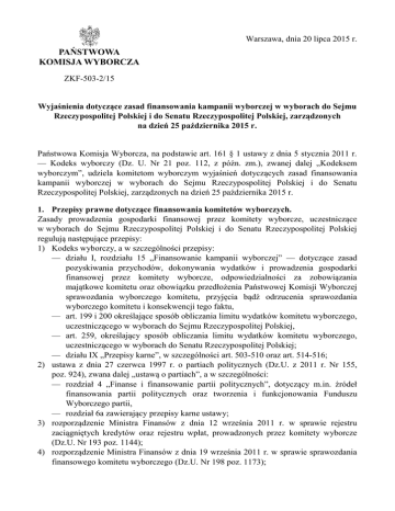 Warszawa, dnia 20 lipca 2015 r. PAŃSTWOWA KOMISJA WYBORCZA ZKF-503-2/15 Wyjaśnienia dotyczące zasad finansowania kampanii wyborczej w wyborach do Sejmu Rzeczypospolitej Polskiej i do Senatu Rzeczypospolitej Polskiej, zarządzonych na dzień 25 października 2015 r. Państwowa Komisja Wyborcza, na podstawie art. 161 § 1 ustawy z dnia 5 stycznia 2011 r. — Kodeks wyborczy (Dz. U. Nr 21 poz. 112, z późn. zm.), zwanej dalej „Kodeksem wyborczym”, udziela komitetom wyborczym wyjaśnień dotyczących zasad finansowania kampanii wyborczej w wyborach do Sejmu Rzeczypospolitej Polskiej i do Senatu Rzeczypospolitej Polskiej, zarządzonych na dzień 25 października 2015 r. 1. Przepisy prawne dotyczące finansowania komitetów wyborczych. Zasady prowadzenia gospodarki finansowej przez komitety wyborcze, uczestniczące w wyborach do Sejmu Rzeczypospolitej Polskiej i do Senatu Rzeczypospolitej Polskiej regulują następujące przepisy: 1) Kodeks wyborczy, a w szczególności przepisy: — działu I, rozdziału 15 „Finansowanie kampanii wyborczej” — dotyczące zasad pozyskiwania przychodów, dokonywania wydatków i prowadzenia gospodarki finansowej przez komitety wyborcze, odpowiedzialności za zobowiązania majątkowe komitetu oraz obowiązku przedłożenia Państwowej Komisji Wyborczej sprawozdania wyborczego komitetu, przyjęcia bądź odrzucenia sprawozdania wyborczego komitetu i konsekwencji tego faktu, — art. 199 i 200 określające sposób obliczania limitu wydatków komitetu wyborczego, uczestniczącego w wyborach do Sejmu Rzeczypospolitej Polskiej, — art. 259, określający sposób obliczania limitu wydatków komitetu wyborczego, uczestniczącego w wyborach do Senatu Rzeczypospolitej Polskiej; — działu IX „Przepisy karne”, w szczególności art. 503-510 oraz art. 514-516; 2) ustawa z dnia 27 czerwca 1997 r. o partiach politycznych (Dz.U. z 2011 r. Nr 155, poz. 924), zwana dalej „ustawą o partiach”, a w szczególności: — rozdział 4 „Finanse i finansowanie partii politycznych”, dotyczący m.in. źródeł finansowania partii politycznych oraz tworzenia i funkcjonowania Funduszu Wyborczego partii, — rozdział 6a zawierający przepisy karne ustawy; 3) rozporządzenie Ministra Finansów z dnia 12 września 2011 r. w sprawie rejestru zaciągniętych kredytów oraz rejestru wpłat, prowadzonych przez komitety wyborcze (Dz.U. Nr 193 poz. 1144); 4) rozporządzenie Ministra Finansów z dnia 19 września 2011 r. w sprawie sprawozdania finansowego komitetu wyborczego (Dz.U. Nr 198 poz. 1173); —2— (Ujednolicone teksty wymienionych ustaw i rozporządzeń znajdują się na stronie internetowej Państwowej Komisji Wyborczej www.pkw.gov.pl); 5) ustawa z dnia 29 września 1994 r. o rachunkowości (Dz. U. z 2013 r. poz. 330, z późn. zm.). 2. Komitety wyborcze Prawo zgłaszania kandydatów na posłów i senatorów mają partie polityczne i koalicje partii politycznych oraz wyborcy. Czynności wyborcze w imieniu partii politycznych, koalicji wyborczych partii politycznych i wyborców, zgodnie z przepisami Kodeksu wyborczego, wykonują komitety wyborcze, od dnia ich utworzenia. Uwaga! Komitet wyborczy może podejmować czynności prawne, w tym związane z pozyskiwaniem środków finansowych na kampanię wyborczą i ich wydatkowaniem, po wydaniu przez Państwową Komisję Wyborczą postanowienia o przyjęciu zawiadomienia o jego utworzeniu. Prawo do prowadzenia kampanii wyborczej na rzecz kandydatów przysługuje, na zasadzie wyłączności, komitetowi wyborczemu (art. 84 § 1 Kodeksu wyborczego). Oznacza to, że wszelkie czynności związane z pozyskiwaniem środków finansowych, dokonywaniem wydatków na organizowanie spotkań wyborczych i promocją poszczególnych kandydatów w formie plakatów, ulotek, itd., mogą być prowadzone tylko przez komitety wyborcze i wyłącznie w okresie kampanii wyborczej, która rozpoczyna się z dniem ogłoszenia postanowienia Prezydenta Rzeczypospolitej o zarządzeniu wyborów, a kończy się na 24 godziny przed dniem wyborów (art. 104 Kodeksu wyborczego). Uwaga! Wszelkie spotkania sprawozdawcze czy informacyjne członków partii, organizacji społecznych, stowarzyszeń, posłów i senatorów lub przedstawicieli komitetów zgłaszających kandydatów w wyborach do Sejmu lub Senatu, organizowane w trakcie kampanii wyborczej, mogą odbywać się tylko pod warunkiem, że nie zawierają żadnych znamion agitacji wyborczej. W przeciwnym razie traktowane są jako element kampanii wyborczej i podlegają regulacjom dotyczącym tej kampanii. Gospodarkę finansową komitetu prowadzi i ponosi za nią pełną odpowiedzialność pełnomocnik finansowy komitetu wyborczego (art. 127 § 1 Kodeksu wyborczego). Zgodnie z art. 130 § 2 Kodeksu wyborczego bez pisemnej zgody pełnomocnika finansowego nie można zaciągać żadnych zobowiązań finansowych w imieniu i na rzecz komitetu wyborczego. Uwaga! Pełnomocnik finansowy może upoważnić inne osoby do podejmowania określonych czynności związanych z dokonywaniem wydatków komitetu wyborczego w jego pomocniczych strukturach terenowych. Nie zwalnia go to jednak z odpowiedzialności za całokształt gospodarki finansowej komitetu. Pełnomocnik finansowy ponosi odpowiedzialność karną za naruszenie zakazów i ograniczeń w pozyskiwaniu i wydatkowaniu środków. —3— Uwaga! Można być pełnomocnikiem finansowym tylko jednego komitetu wyborczego (art. 127 § 3 Kodeksu wyborczego). Funkcji pełnomocnika finansowego, w myśl art. 127 § 2 Kodeksu wyborczego nie może pełnić: 1) pełnomocnik wyborczy; 2) kandydat na posła oraz kandydat na senatora; 3) funkcjonariusz publiczny w rozumieniu art. 115 § 13 Kodeksu karnego, tj.: Prezydent Rzeczypospolitej Polskiej, poseł, senator, radny, poseł do Parlamentu Europejskiego, sędzia, ławnik, prokurator, funkcjonariusz finansowego organu postępowania przygotowawczego lub organu nadrzędnego nad finansowym organem postępowania przygotowawczego, not