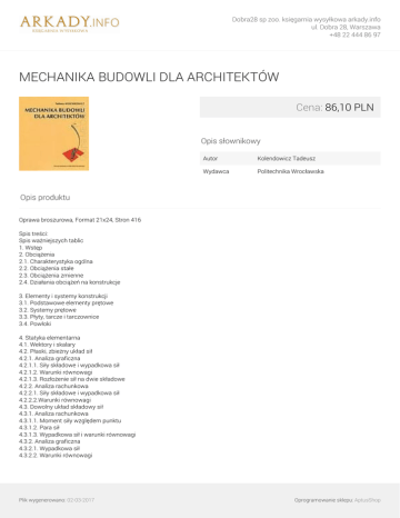 Dobra28 sp zoo. księgarnia wysyłkowa arkady.info ul. Dobra 28, Warszawa +48 22 444 86 97 MECHANIKA BUDOWLI DLA ARCHITEKTÓW Cena: 86,10 PLN Opis słownikowy Autor Kolendowicz Tadeusz Wydawca Politechnika Wrocławska Opis produktu Oprawa broszurowa, Format 21x24, Stron 416 Spis treści: Spis ważniejszych tablic 1. Wstęp 2. Obciążenia 2.1. Charakterystyka ogólna 2.2. Obciążenia stałe 2.3. Obciążenia zmienne 2.4. Działania obciążeń na konstrukcje 3. Elementy i systemy konstrukcji 3.1. Podstawowe elementy prętowe 3.2. Systemy prętowe 3.3. Płyty, tarcze i tarczownice 3.4. Powłoki 4. Statyka elementarna 4.1. Wektory i skalary 4.2. Płaski, zbieżny układ sił 4.2.1. Analiza graficzna 4.2.1.1. Siły składowe i wypadkowa sił 4.2.1.2. Warunki równowagi 4.2.1.3. Rozłożenie sił na dwie składowe 4.2.2. Analiza rachunkowa 4.2.2.1. Siły składowe i wypadkowa sił 4.2.2.2.Warunki równowagi 4.3. Dowolny układ składowy sił 4.3.1. Analiza rachunkowa 4.3.1.1. Moment siły względem punktu 4.3.1.2. Para sił 4.3.1.3. Wypadkowa sił i warunki równowagi 4.3.2. Analiza graficzna 4.3.2.1. Wypadkowa sił 4.3.2.2. Warunki równowagi Plik wygenerowano: 02-03-2017 Oprogramowanie sklepu: AptusShop Dobra28 sp zoo. księgarnia wysyłkowa arkady.info ul. Dobra 28, Warszawa +48 22 444 86 97 5. Geomatria pól 5.1. Środek ciężkości 5.1.1. Sposób rachunkowy 5.2.1. Moment bezwładności pola względem prostej 5.2.2. Biegunowy moment bezwładności 5.2.3. Promień bezwładności 5.2.4. Twierdzenie Steinera 5.2.5. Moment dewiacji 5.2.6. Główne osie i główne momenty bezwładności 5.3. Wskaźnik zginania 6. Tarcie 7. Podpory 7.1. Podpora przegubowo przesuwna 7.2. Podpora przegubowo nieprzesuwna 7.3. Sztywne utwierdzenie 7.4. Wyznaczanie relacji podpór - warunki równowagi 8. Kratownice 8.1. Uwagi ogólne 8.2. Obciążenia kratownic dachowych 8.3. Warunek wewnętrznej wyznaczalności statycznej 8.4. Wyznaczanie sił wewnętrznych sposobem Cremony 8.5. Wyznaczanie sił wewnętrznych sposobem Ritera 8.6. Kształtowanie kratownic 9. Materiały konstrukcyjne 9.1. Wiadomości ogólne 9.2. Stan naprężenia 9.3. Stan odkształcenia 9.4. Prawo Hoke'a 9.5. Wytrzymałość materiału. Ogólne zasady wymiarowania konstrukcji 9.6. Stal 9.7. Aluminium 9.8. Beton 9.9. Mury 9.10. Drewno 10. Proste wypadki wytrzymałościowe 10.1. Rozciąganie i ściskanie 10.2. Ścinanie 10.3. Skręcanie 10.3.1. Przekrój kolorowy i pierścieniowy 10.3.2. Przekrój prostokątny 10.3.3. Przekroje o ściankach cienkich 11. Belki 11.1. Momenty zginające i siły poprzeczne w belkach statycznie wyznaczalnych 11.2. Projektowanie przekroju 11.3. Zginanie ukośne 11.4. Linia ugięcia 11.4.1. Linia ugięcia wsporników 11.4.2. Linia ugięcia belek wolno podpartych 11.5. Belki jednoprzęsłowe statycznie niewyznaczalne 11.6. Belki ciągłe wieloprzęgłowe. Metoda Crossa 11.7. Obliczanie belek ciągłych za pomocą tablic. Obwiednie momentów 11.8. Belki przegubowe 11.9. Zginanie spręzysto plastyczne Plik wygenerowano: 02-03-2017 Oprogramowanie sklepu: AptusShop Dobra28 sp zoo. księgarnia wysyłkowa arkady.info ul. Dobra 28, Warszawa +48 22 444 86 97 11.10. Ścinanie w belkach 11.11. Naprężenia główne. Trajektornie naprężeń głównych 11.12. Kształtowanie belek 12. Ramy 12.1. Uwagi ogólne 12.2. Ramy statycznie wyznaczalne 12.3. Ramy statycznie niewyznaczalne o węzłach nieprzesuwnych 12.4. Belki Vierendeela 13. Pręty obciążone mimośrodowo 14. Słupy 15. Cięgna wiotkie 15.1. Cięgno obciążone siłami słupowymi 15.1.1. Punkty zawieszenia na jednym poziomie 15.1.2. Punkty zawieszenia na róznych poziomach 15.2. Cięgno obciążone cięzarem rozłożonym w sposób ciągły 15.2.1. Punkty zawieszenia na jednym poziomie 15.2.2. Punkty zawieszenia na różnych poziomach 15.3. Wiązary ciągnowe 16. Łuki 16.1. Łuk trójprzegubowy 16.1.1. Rozwiązania analityczne 16.1.2. Rozwiązania graficzne 16.2. Łuk dwuprzegubowy 16.3. Łuk bezprzegubowy 16.4. Łuk pierścieniowy 17. Płyty 17.1. Zginanie walcowe 17.2. Zginanie dwukierunkowe 18. Ruszty płaskie jednowarstwowe 19. Powłoki 19.1. Kopuły koliste 19.2. Powłoki walcowe 20. Tarczownice 21. Stateczność budowli 22. Projektowanie wstępne konstrukcji 23. Przegląd niektórych obiektów architektury końca XX i początku XXI wieku 23.1. Najwyższy budynek "Taipei 101" na Tajwanie, 508 metrów wysokości, 2004 r., system magakolumn 23.2. "Sky Tower" we Wrocławiu - największy budynek w Polsce 23.3. Burj al Arab w Dubaju, wieżowiec hotel z największym wspornikiem konstrukcji nośnej restaurachi hotelowej 23.4. "Convention Hall" Ludika Miesa van Der Rohe, Chicago 1984 r. (projekt niezrealizowany) - przykład największego systemu rusztu dwuwarstwowego 23.5. Most przez Cieśninę Mesyńską (planowane rozpoczęcie 2012 r.) największy most wiszący 23.6. Most "Stonecutters" w Honkongu, Chiny (ukonczony w 2008 r.) 1018 m - największy most podwieszony 23.7. Most "Lupu" w Szanghaju, Chiny, 2003 r., 550 m, największy most łukowy 23.8. Podsumowanie Bibliografia Plik wygenerowano: 02-03-2017 Oprogramowanie sklepu: AptusShop Dobra28 sp zoo. księgarnia wysyłkowa arkady.info ul. Dobra 28, Warszawa +48 22 444 86 97 Wykaz piśmiennictwa Rok wydania 2012 Plik wygenerowano: 02-03-2017 Powered by TCPDF (www.tcpdf.org) Oprogramowanie sklepu: AptusShop