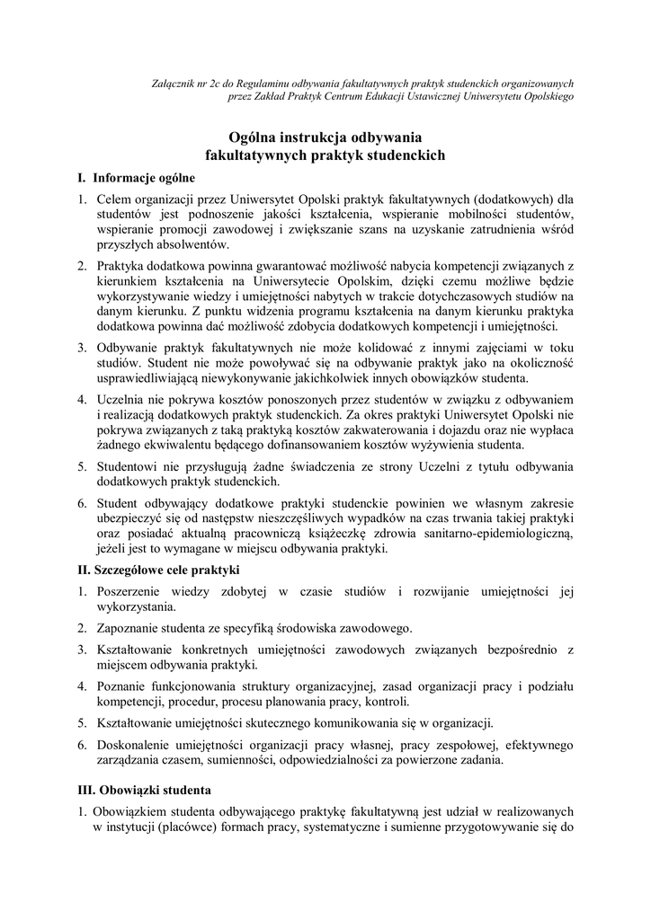 Załącznik nr 2c do Regulaminu odbywania fakultatywnych praktyk studenckich organizowanych przez Zakład Praktyk Centrum Edukacji Ustawicznej Uniwersytetu Opolskiego Ogólna instrukcja odbywania fakultatywnych praktyk studenckich I. Informacje ogólne 1. Celem organizacji przez Uniwersytet Opolski praktyk fakultatywnych (dodatkowych) dla studentów jest podnoszenie jakości kształcenia, wspieranie mobilności studentów, wspieranie promocji zawodowej i zwiększanie szans na uzyskanie zatrudnienia wśród przyszłych absolwentów. 2. Praktyka dodatkowa powinna gwarantować możliwość nabycia kompetencji związanych z kierunkiem kształcenia na Uniwersytecie Opolskim, dzięki czemu możliwe będzie wykorzystywanie wiedzy i umiejętności nabytych w trakcie dotychczasowych studiów na danym kierunku. Z punktu widzenia programu kształcenia na danym kierunku praktyka dodatkowa powinna dać możliwość zdobycia dodatkowych kompetencji i umiejętności. 3. Odbywanie praktyk fakultatywnych nie może kolidować z innymi zajęciami w toku studiów. Student nie może powoływać się na odbywanie praktyk jako na okoliczność usprawiedliwiającą niewykonywanie jakichkolwiek innych obowiązków studenta. 4. Uczelnia nie pokrywa kosztów ponoszonych przez studentów w związku z odbywaniem i realizacją dodatkowych praktyk studenckich. Za okres praktyki Uniwersytet Opolski nie pokrywa związanych z taką praktyką kosztów zakwaterowania i dojazdu oraz nie wypłaca żadnego ekwiwalentu będącego dofinansowaniem kosztów wyżywienia studenta. 5. Studentowi nie przysługują żadne świadczenia ze strony Uczelni z tytułu odbywania dodatkowych praktyk studenckich. 6. Student odbywający dodatkowe praktyki studenckie powinien we własnym zakresie ubezpieczyć się od następstw nieszczęśliwych wypadków na czas trwania takiej praktyki oraz posiadać aktualną pracowniczą książeczkę zdrowia sanitarno-epidemiologiczną, jeżeli jest to wymagane w miejscu odbywania praktyki. II. Szczegółowe cele praktyki 1. Poszerzenie wiedzy zdobytej w czasie studiów i rozwijanie umiejętności jej wykorzystania. 2. Zapoznanie studenta ze specyfiką środowiska zawodowego. 3. Kształtowanie konkretnych umiejętności zawodowych związanych bezpośrednio z miejscem odbywania praktyki. 4. Poznanie funkcjonowania struktury organizacyjnej, zasad organizacji pracy i podziału kompetencji, procedur, procesu planowania pracy, kontroli. 5. Kształtowanie umiejętności skutecznego komunikowania się w organizacji. 6. Doskonalenie umiejętności organizacji pracy własnej, pracy zespołowej, efektywnego zarządzania czasem, sumienności, odpowiedzialności za powierzone zadania. III. Obowiązki studenta 1. Obowiązkiem studenta odbywającego praktykę fakultatywną jest udział w realizowanych w instytucji (placówce) formach pracy, systematyczne i sumienne przygotowywanie się do wykonywanych zadań, stosowanie się do zaleceń Dyrekcji oraz Opiekuna praktyki w instytucji (placówce). 2. Student powinien przestrzegać przyjętego w instytucji (placówce) trybu i porządku pracy oraz przepisów o dyscyplinie pracy, przestrzegać zasad bezpieczeństwa i higieny pracy oraz ochrony przeciwpożarowej. 3. Ponad to student zobowiązany jest do zachowania tajemnicy służbowej i państwowej oraz ochrony poufności danych w zakresie określonym przez organizatora praktyki. 4. Praktykant przed rozpoczęciem realizacji samodzielnych zadań powinien poznać różne obszary pracy danej instytucji (placówki). 5. Po zakończeniu praktyki student powinien otrzymać Opinię o przebiegu praktyki, wystawioną przez Opiekuna praktyki i potwierdzoną przez Dyrektora instytucji (placówki). IV. Obowiązki instytucji (placówki) w zakresie organizacji i nadzoru praktyki 1. Merytoryczny i metodyczny nadzór nad przebiegiem praktyki sprawuje Dyrektor instytucji (placówki) lub wyznaczony przez niego Opiekun. 2. Dyrekcja instytucji (placówki) oraz Opiekun praktyki umożliwiają studentom zapoznanie się z całokształtem jej działalności, a szczególnie z jej: a) zadaniami i programem działania, b) specyfiką pracy, c) strukturą organizacyjną, d) dokumentacją instytucji, e) realizowanymi formami pracy (w samej instytucji i w ramach współdziałania z innymi podmiotami w środowisku). 3. Opiekun sprawuje nadzór nad praktykami poprzez: a) opracowanie planu praktyki, który powinien być dostosowany do specyfiki instytucji (placówki), b) systematyczne udzielanie studentom merytorycznych i metodycznych rad i wskazówek, c) dbanie o zapewnienie studentom odpowiednich warunków do pracy i realizowania zadań, d) koordynowanie przygotowania studenta do zadań, zatwierdzanie przygotowanych planów oraz ich nadzorowanie, e) prowadzenie systematycznej obserwacji praktykanta, f) ocenę studenta w zakresie jego przygotowania do pracy i predyspozycji osobowych do zawodu, g) przygotowanie opinii o przebiegu praktyki.