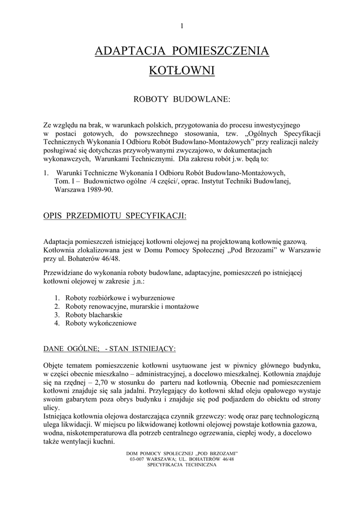1 ADAPTACJA POMIESZCZENIA KOTŁOWNI ROBOTY BUDOWLANE: Ze względu na brak, w warunkach polskich, przygotowania do procesu inwestycyjnego w postaci gotowych, do powszechnego stosowania, tzw. „Ogólnych Specyfikacji Technicznych Wykonania I Odbioru Robót Budowlano-Montażowych” przy realizacji należy posługiwać się dotychczas przywoływanymi zwyczajowo, w dokumentacjach wykonawczych, Warunkami Technicznymi. Dla zakresu robót j.w. będą to: 1. Warunki Techniczne Wykonania I Odbioru Robót Budowlano-Montażowych, Tom. I – Budownictwo ogólne /4 części/, oprac. Instytut Techniki Budowlanej, Warszawa 1989-90. OPIS PRZEDMIOTU SPECYFIKACJI: Adaptacja pomieszczeń istniejącej kotłowni olejowej na projektowaną kotłownię gazową. Kotłownia zlokalizowana jest w Domu Pomocy Społecznej „Pod Brzozami” w Warszawie przy ul. Bohaterów 46/48. Przewidziane do wykonania roboty budowlane, adaptacyjne, pomieszczeń po istniejącej kotłowni olejowej w zakresie j.n.: 1. 2. 3. 4. Roboty rozbiórkowe i wyburzeniowe Roboty renowacyjne, murarskie i montażowe Roboty blacharskie Roboty wykończeniowe DANE OGÓLNE; - STAN ISTNIEJĄCY: Objęte tematem pomieszczenie kotłowni usytuowane jest w piwnicy głównego budynku, w części obecnie mieszkalno – administracyjnej, a docelowo mieszkalnej. Kotłownia znajduje się na rzędnej – 2,70 w stosunku do parteru nad kotłownią. Obecnie nad pomieszczeniem kotłowni znajduje się sala jadalni. Przylegający do kotłowni skład oleju opałowego wystaje swoim gabarytem poza obrys budynku i znajduje się pod podjazdem do obiektu od strony ulicy. Istniejąca kotłownia olejowa dostarczająca czynnik grzewczy: wodę oraz parę technologiczną ulega likwidacji. W miejscu po likwidowanej kotłowni olejowej powstaje kotłownia gazowa, wodna, niskotemperaturowa dla potrzeb centralnego ogrzewania, ciepłej wody, a docelowo także wentylacji kuchni. DOM POMOCY SPOŁECZNEJ „POD BRZOZAMI” 03-007 WARSZAWA; UL. BOHATERÓW 46/48 SPECYFIKACJA TECHNICZNA 2 Doprowadzany obecnie do obiektu gaz ziemny, poza kotłownią zasilać ma także kuchnię. W obiekcie rezygnuje się z pary technologicznej. Obecna kotłownia olejowa zajmuje dwa pomieszczenia, z których jedno, skład oleju, połączone jest z pomieszczeniem kotłów nie zamykanym przejściem o szerokości 1,2 m. Znajdujący się w pomieszczeniu kotłów murowany komin ceramiczny stanowi obudowę dla dwóch wkładów kominowych ze stali nierdzewnej. Konstrukcja komina ceramicznego wystaje ponad połać dachu około 70 cm. W pomieszczeniu składu oleju wykonano betonową wannę w miejscu ustawienia zbiorników na olej. W pomieszczeniu kotłów istnieje fundament pod dwa kotły, o wysokości 11 cm, oddzielny fundament pod podgrzewacz ciepłej wody, stalowa konstrukcja nośna pod dwa zbiorniki prostopadłościenne na kondensat. Różnicę poziomów pomiędzy przylegającym korytarzem, a pomieszczeniem kotłowni pokonuje się schodami znajdującymi się bezpośrednio za drzwiami do kotłowni. Posadzka obu pomieszczeń kotłowni wyłożona jest terakotą, a ściany do pełnej wysokości glazurą. W obrys pomieszczenia kotłowni wyraźnie wchodzą swoim częściowym gabarytem ławy fundamentowe ścian budynku zawężając częściowo pomieszczenie. W pomieszczeniu kotłowni znajdują się dwie, połączone ze sobą przewodem kanalizacyjnym, studzienki schładzające. W jednej z tych studzienek znajduje się elektryczna pompa odwadniająca pomieszczenie, poprzez przewód tłoczny, do szamba na terenie obiektu. PRZEWIDYWANY ZAKRES ROBÓT: Ad. 1. W pomieszczeniu kotłowni należy rozebrać istniejący fundament pod podgrzewacz ciepłej wody, usunąć stalową konstrukcję wsporczą pod dwa zbiorniki kondensatu, rozebrać schody. Istniejący fundament kotłów adaptować na potrzeby nowej kotłowni. Adaptacja ta polega na ograniczeniu kształtu fundamentu do wymaganego projektem, rozkuciu krawędzi fundamentu celem osadzenia kątownika stalowego. Przed zamurowaniem otworu łączącego pom. kotłowni ze składem oleju w krawędziach ścian należy wykuć strzępia. Dotyczy to także zamurowania wnęki występującej w ścianie zewnętrznej pomieszczenia. Istniejące drzwi do pomieszczenia kotłowni należy zdemontować wraz z ościeżnicą. Zdemontować należy także kanał wentylacyjny nawiewny z blachy stalowej, t. zw. kanał „Z”. Wykonanie nowych kanałów wentylacji grawitacyjnej, projektowanej kotłowni, wiąże się z rozkuciami ścian. W przypadku projektowanego kanału nawiewnego „Z” wykuć należy fragment podestu na zewnątrz budynku oraz nowy otwór w murze. Nowy kanał wywiewny powstanie przez połączenie dwóch istniejących kanałów o wym. 14 x 14 cm. Pionowe rozkucie ściany wewnętrznej należy wykonać na całej długości kanałów istniejących. Adaptacji podlega murowany szacht kominowy, który stanowi obudowę właściwego komina z blachy stalowej nierdzewnej – wkładu kominowego. Murowaną konstrukcję komina należy rozkuć w pomieszczeniu kotłowni, od strony wlotu czopucha, tak aby wnętrze szachtu było dostępne, a wkład kominowy był widoczny w pomieszczeniu kotłowni. Przed rozkuciem jednej ściany komina nad miejscem tego rozkucia należy wykonać nadproże z obetonowanego dwuteownika. W przypadku, gdyby nowy wkład stalowy nie mieścił się w istniejącym otworze szachtu, cały murowany komin należy rozebrać, a w jego miejscu wymurować nową obudowę kominową o tych samych wymiarach zewnętrznych ale cieńszych ścianach. DOM POMOCY SPOŁECZNEJ „POD BRZOZAMI” 03-007 WARSZAWA; UL. BOHATERÓW 46/48 SPECYFIKACJA TECHNICZNA 3 Istniejącą wykładzinę ścienną oraz posadzkową należy skuć na całej powierzchni pomieszczenia kotłowni. Ad. 2. Zamurować należy otwór łączący obecny skład oleju opałowego z pomieszczeniem kotłowni. Konstrukcję muru z cegły pełnej dopasować do grubości istniejącej ściany budynku. Wnękę w ścianie zewnętrznej pomieszcz