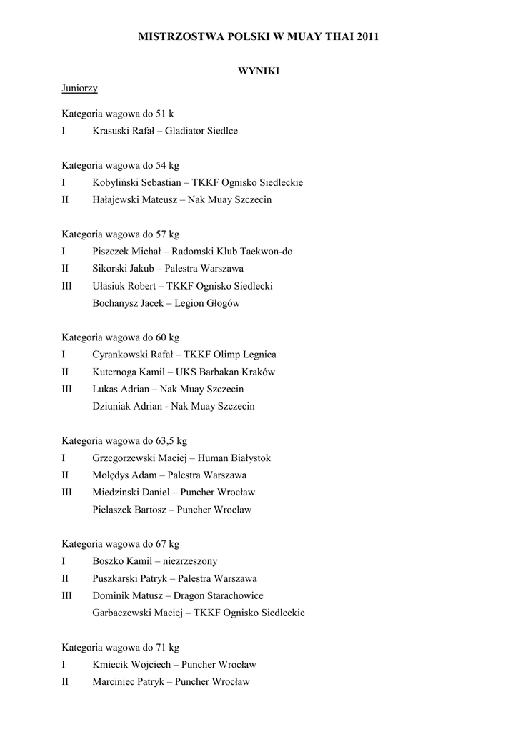 MISTRZOSTWA POLSKI W MUAY THAI 2011 WYNIKI Juniorzy Kategoria wagowa do 51 k I Krasuski Rafał – Gladiator Siedlce Kategoria wagowa do 54 kg I Kobyliński Sebastian – TKKF Ognisko Siedleckie II Hałajewski Mateusz – Nak Muay Szczecin Kategoria wagowa do 57 kg I Piszczek Michał – Radomski Klub Taekwon-do II Sikorski Jakub – Palestra Warszawa III Ułasiuk Robert – TKKF Ognisko Siedlecki Bochanysz Jacek – Legion Głogów Kategoria wagowa do 60 kg I Cyrankowski Rafał – TKKF Olimp Legnica II Kuternoga Kamil – UKS Barbakan Kraków III Lukas Adrian – Nak Muay Szczecin Dziuniak Adrian - Nak Muay Szczecin Kategoria wagowa do 63,5 kg I Grzegorzewski Maciej – Human Białystok II Molędys Adam – Palestra Warszawa III Miedzinski Daniel – Puncher Wrocław Pielaszek Bartosz – Puncher Wrocław Kategoria wagowa do 67 kg I Boszko Kamil – niezrzeszony II Puszkarski Patryk – Palestra Warszawa III Dominik Matusz – Dragon Starachowice Garbaczewski Maciej – TKKF Ognisko Siedleckie Kategoria wagowa do 71 kg I Kmiecik Wojciech – Puncher Wrocław II Marciniec Patryk – Puncher Wrocław III Tuszyński Stanisław – Legion Głogów Marczewski Marcin – TKKF Ognisko Siedleckie Kategoria wagowa do 75 kg I Kluczniok Mateusz – Absortio Gym Rybnik II Kulig Kacper – Nak Muay Szczecin III Rene Mayea Fabregas – K.S.W. Włocławek Borzych Artur – Kohorta Poznań Kategoria wagowa do 81 kg I Gaszka Adam – Absortio Gym Rybnik II Gil Michał – Human Białystok III Radosz Łukasz – Kohorta Poznań Markiefka Mateusz – Beskid Dragon Bielsko-Biała Kategoria wagowa powyżej 81 kg I Bławdziewicz Michał – Palestra Warszawa II Błaszak Bruno – Legion Głogów III Jesiołowski Tomasz – Puncher Wrocław Juniorki Kategoria wagowa do 48 kg I Mężyk Edyta – Radomski Klub Taekwon-do II Kuternoga Patrycja – Barbakan Kraków Kategoria wagowa do 57 kg I Krawczyk Patrycja – Legion Głogów Kategoria wagowa do 60 kg I Owsik Kinga – Centrum Sportów Walki Płock Seniorzy Kategoria wagowa do 54 kg I Osienienko Arkadiusz – KO GYM Świebodzice II Gutkowski Bartosz – Radomski Klub Taekwon-do Kategoria wagowa do 57 kg I Narloch Kacper – Nak Muay Szczecin II Binek Andrzej – KO GYM Świebodzice III Dobrała Przemysław – Czerwony Smok Poznań Stępniewski Paweł – Palestra Warszawa Kategoria wagowa do 60 kg I Kulik Leszek – Radomski Klub Taekwon-do II Królik Michał – Paco Team Katowice III Olszewski Krzysztof – Palestra Warszawa Drohomirecki Arkadiusz – Beskid Dragon Bielsko-Biała Kategoria wagowa do 63,5 kg I Walczak Łukasz – Paco Team Katowice II Dajek Łukasz – Palestra Warszawa III Zembik Maciej – Żarski Klub Sportów Walki Dulak Łukasz – Spartan Knurów Kategoria wagowa do 67 kg I Lipowski Krzysztof – Palestra Warszawa II Jankowski Eliasz – TKKF Olimp Legnica III Korycki Kamil – Radomsko Klub Taekwon-do Bielawiec Krzysztof – Nak Muay Szczecin Kategoria wagowa do 71 kg I Parcheta Marcin – Nak Muay Szczecin II Zawadzki Damian – Radomski Klub Taekwon-do III Dryńkowski Wiktor – Absortio Gym Rybnik Lityński Jakub – Palestra Warszawa Kategoria wagowa do 75 kg I Kosowski Wojciech – Palestra Warszawa II Odzimkowski Albert – Radomski Klub Taekwon-do III Kubacki Filip – Kohorta Poznań Kamiński Kamil – Centrum Sportów Walki Płock Kategoria wagowa do 81 kg I Prokurat Daniel – Palestra Warszawa II Stuszewski Piotr – Palestra Warszawa III Toboła Amadeusz – Paco Team Katowice Lipiński Mariusz – Gladiator Siedlce Kategoria wagowa do 86 kg I Roszkowski Konrad – Palestra Warszawa II Kanawka Grzegorz – Corpus Gdańsk III Tarnacki Tomasz – Human Białystok Andryszczyk Michał – Corpus Gdańsk Kategoria wagowa do 91 kg I Pluta Mateusz – Puncher Wrocław II Nowicki Michał – Wielkopolanin Poznań III Matysiak Adrian – Nak Muay Szczecin Anioł Maciej – Czerwony Smok Poznań Kategoria wagowa powyżej 91 kg I Turyński Michał – Fighter Wrocław II Iwańczuk Tomasz – Nak Muay Szczecin III Klimiuk Tomasz – Human Białystok Koziatek Łukasz – Triada Piekary Śląskie Seniorki Kategoria wagowa do 54 kg I Drużko Dorota – Puncher Wrocław II Porażyńska Monika – Corpus Gdańsk Kategoria wagowa do 67 kg I Waliczek Marta – Beskid Dragon Bielsko-Biała