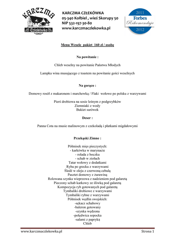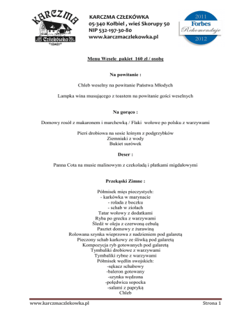 KARCZMA CZŁEKÓWKA 05-340 Kołbiel , wieś Skorupy 50 NIP 532-197-30-80 www.karczmaczlekowka.pl Menu Wesele pakiet 160 zł / osobę Na powitanie : Chleb weselny na powitanie Państwa Młodych Lampka wina musującego z toastem na powitanie gości weselnych Na gorąco : Domowy rosół z makaronem i marchewką / Flaki wołowe po polsku z warzywami Pierś drobiowa na sosie leśnym z podgrzybków Ziemniaki z wody Bukiet surówek Deser : Panna Cota na musie malinowym z czekoladą i płatkami migdałowymi Przekąski Zimne : Półmisek mięs pieczystych: - karkówka w marynacie - rolada z boczku - schab w ziołach Tatar wołowy z dodatkami Ryba po grecku z warzywami Śledź w oleju z czerwoną cebulą Pasztet domowy z żurawiną Rolowana szynka wieprzowa z nadzieniem pod galaretą Pieczony schab karkowy ze śliwką pod galaretą Kompozycja ryb gotowanych pod galaretą Tymbaliki drobiowe z warzywami Tymbaliki rybne z warzywami Półmisek wędlin swojskich: -sękacz schabowy -baleron gotowany -szynka wędzona -polędwica sopocka -salami z papryką Chleb www.karczmaczlekowka.pl Strona 1 KARCZMA CZŁEKÓWKA 05-340 Kołbiel , wieś Skorupy 50 NIP 532-197-30-80 www.karczmaczlekowka.pl Dodatki : -ogórki -pomidory -papryka konserwowa -grzybki marynowane Sałatki : Tradycyjna jarzynowa z majonezem Z grillowanym kurczakiem i makaronem Grecka z serem feta , oliwkami i balsamicznym vinaigrette. Na gorąco : Żur staropolski na zakwasie z białą kiełbasą i jajem podawany z pieczywem Dodatek Staropolski : Chleb z wiejski podawany z domowym smalcem i ogórkami Na gorąco serwowane przez kucharza : Pieczeń karkowa w sosie tymiankowym Kasza gryczana z liściem laurowym Sałatka z ogórka konserwowego w zalewie miodowej www.karczmaczlekowka.pl Strona 2 KARCZMA CZŁEKÓWKA 05-340 Kołbiel , wieś Skorupy 50 NIP 532-197-30-80 www.karczmaczlekowka.pl Na gorąco : Barszcz czerwony z pasztecikiem mięsnym Na słodko : Sernik domowy z rodzynkami Ciasto z wiśniami Przekładaniec z orzechami Tiramisu z białym biszkoptem Ciasto z galaretką owocową Kremowiec z czekoladą Babeczki kruche z owocami Owoce na lustrze Napoje : -Kawa / Herbata - Czarna porzeczka - Pomarańczowy - Jabłkowy - Woda - Pepsi - Mirinda - 7 up *Cena zawiera dekorację stołów , dekorację kwiatową , pokrowce na krzesłach, obsługę kelnerską , zastawę stołową , wynajem sali ** Cena nie zawiera alkoholi *** Dzieci lat 0-2 za darmo , 2- 10 - 50 % ceny **** Obsługa ( zespół , kamerzysta , fotograf ) – 50 % ceny ***** Przy płatności kartą doliczamy opłatę serwisową 5 % www.karczmaczlekowka.pl Strona 3